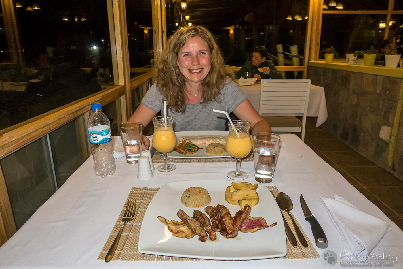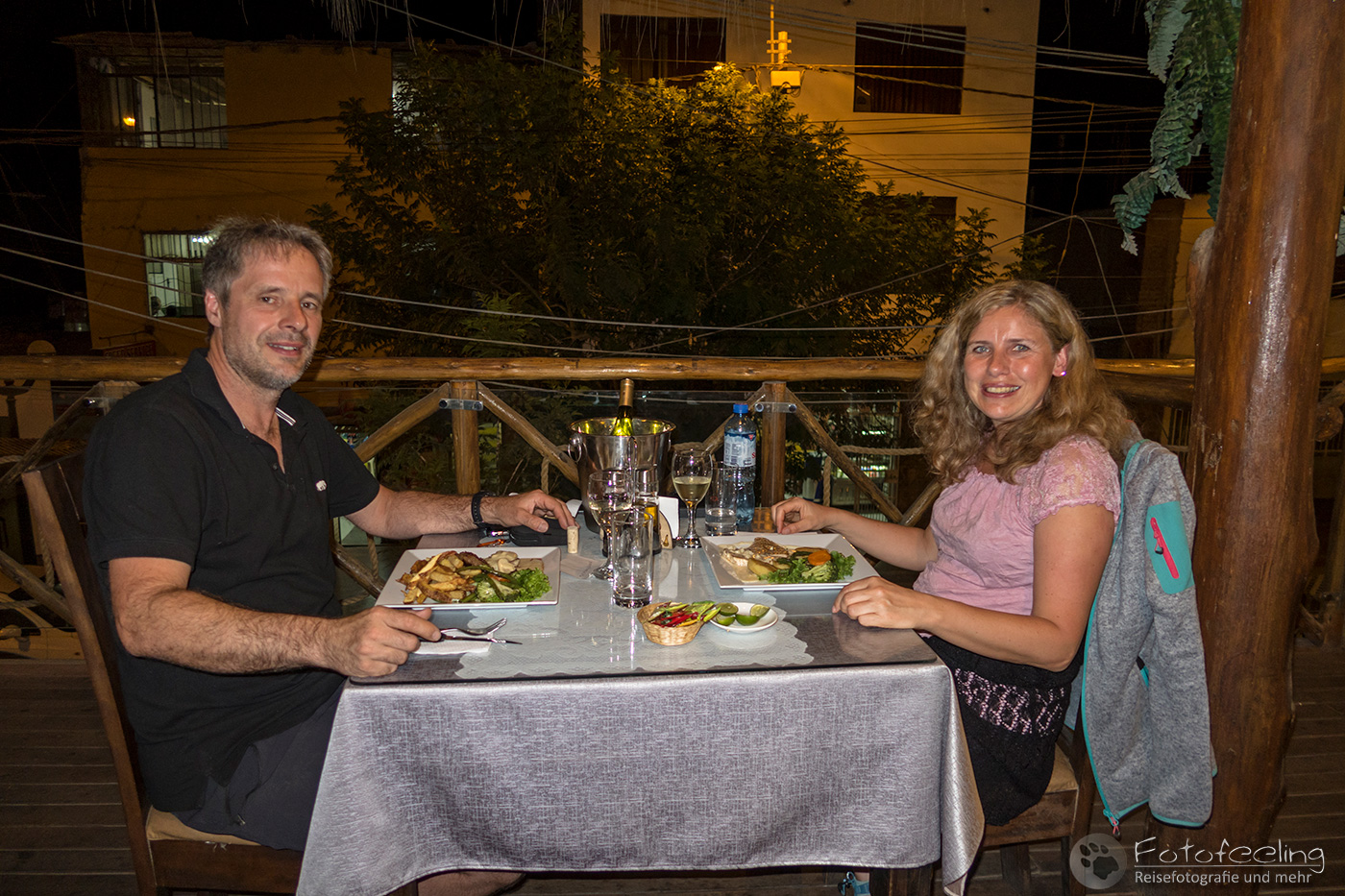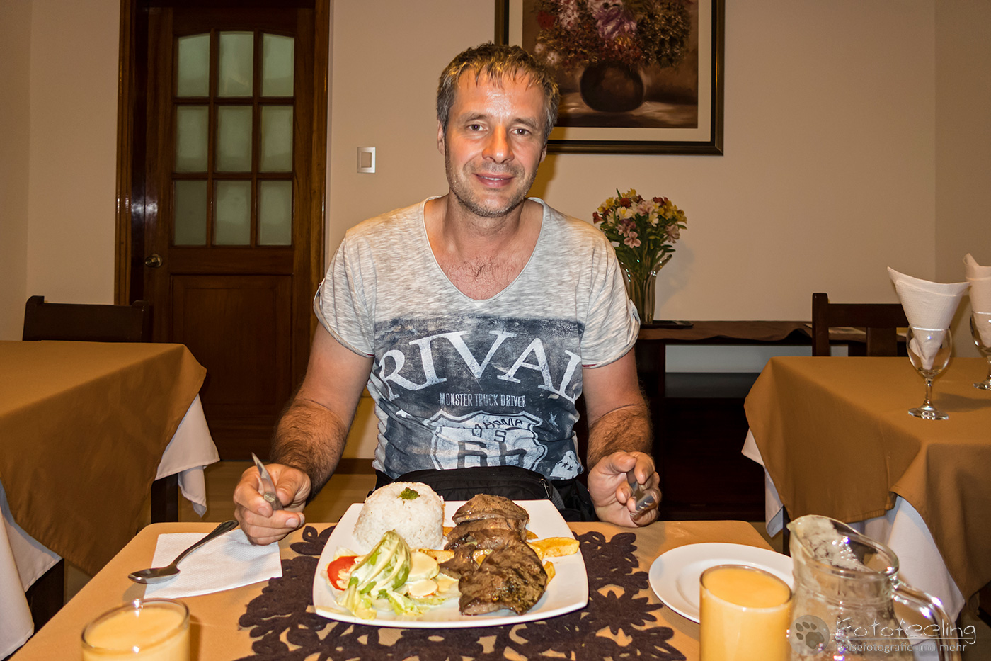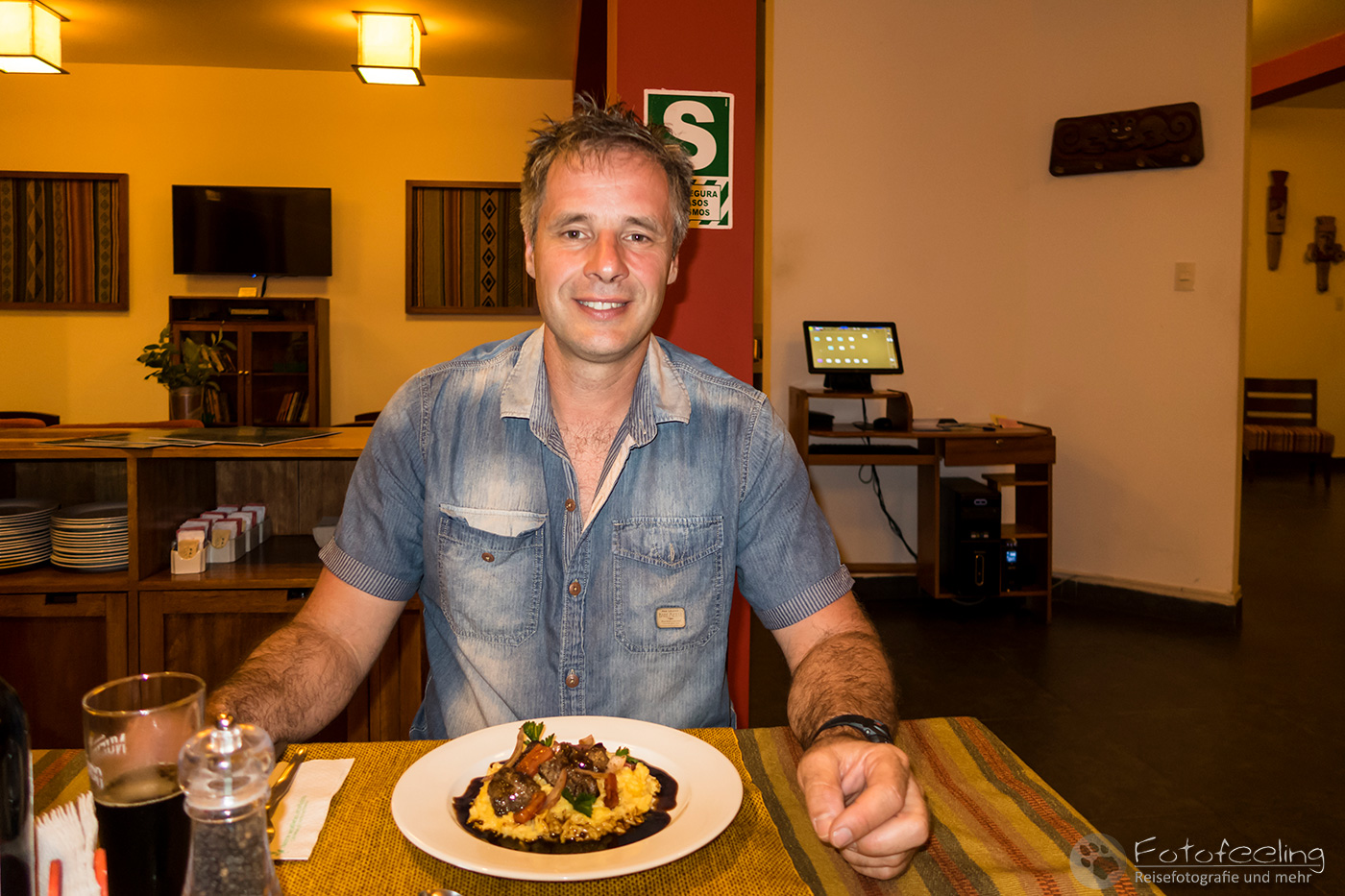 Das Abendessen genossen wir auf der überdachten Terrasse bei leichtem Regen. Chris aß Lomo Saltado – was sonst - und ich ein Schweinesteak mit einer Kartoffelmaisbreimischung (Taco Taco), was sehr gut schmeckte. Doch diesmal gewann eindeutig Chris Lomo Saltado, dass eine geniale Rauchnote hatte und das Beste war, dass wir in ganz Peru gegessen haben.