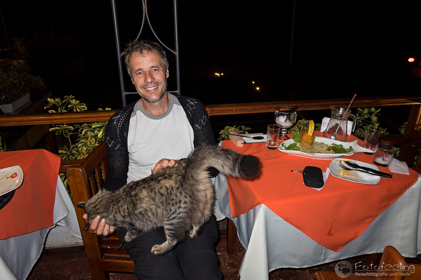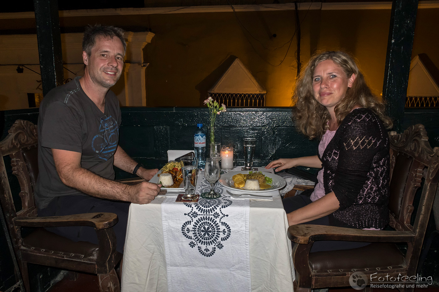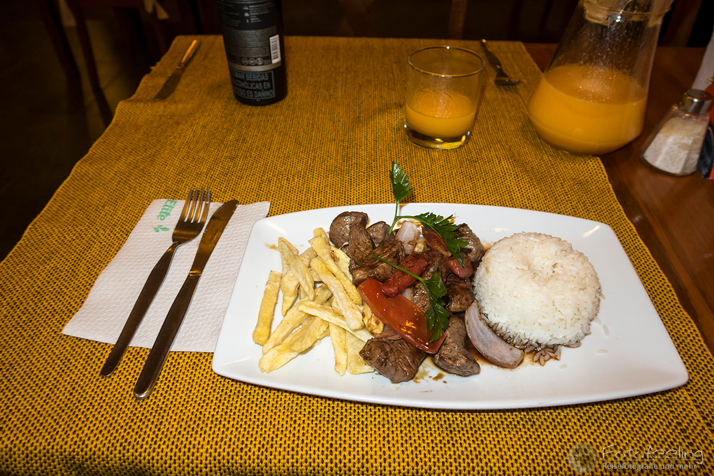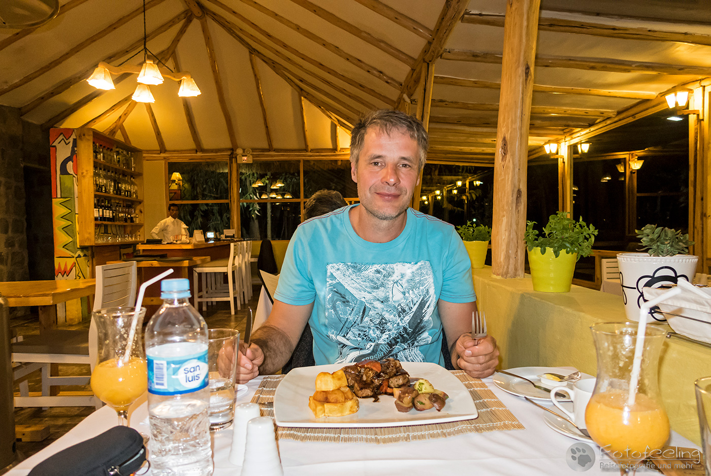 Das Abendessen genossen wir auf der überdachten Terrasse bei leichtem Regen. Chris aß Lomo Saltado – was sonst - und ich ein Schweinesteak mit einer Kartoffelmaisbreimischung (Taco Taco), was sehr gut schmeckte. Doch diesmal gewann eindeutig Chris Lomo Saltado, dass eine geniale Rauchnote hatte und das Beste war, dass wir in ganz Peru gegessen haben.