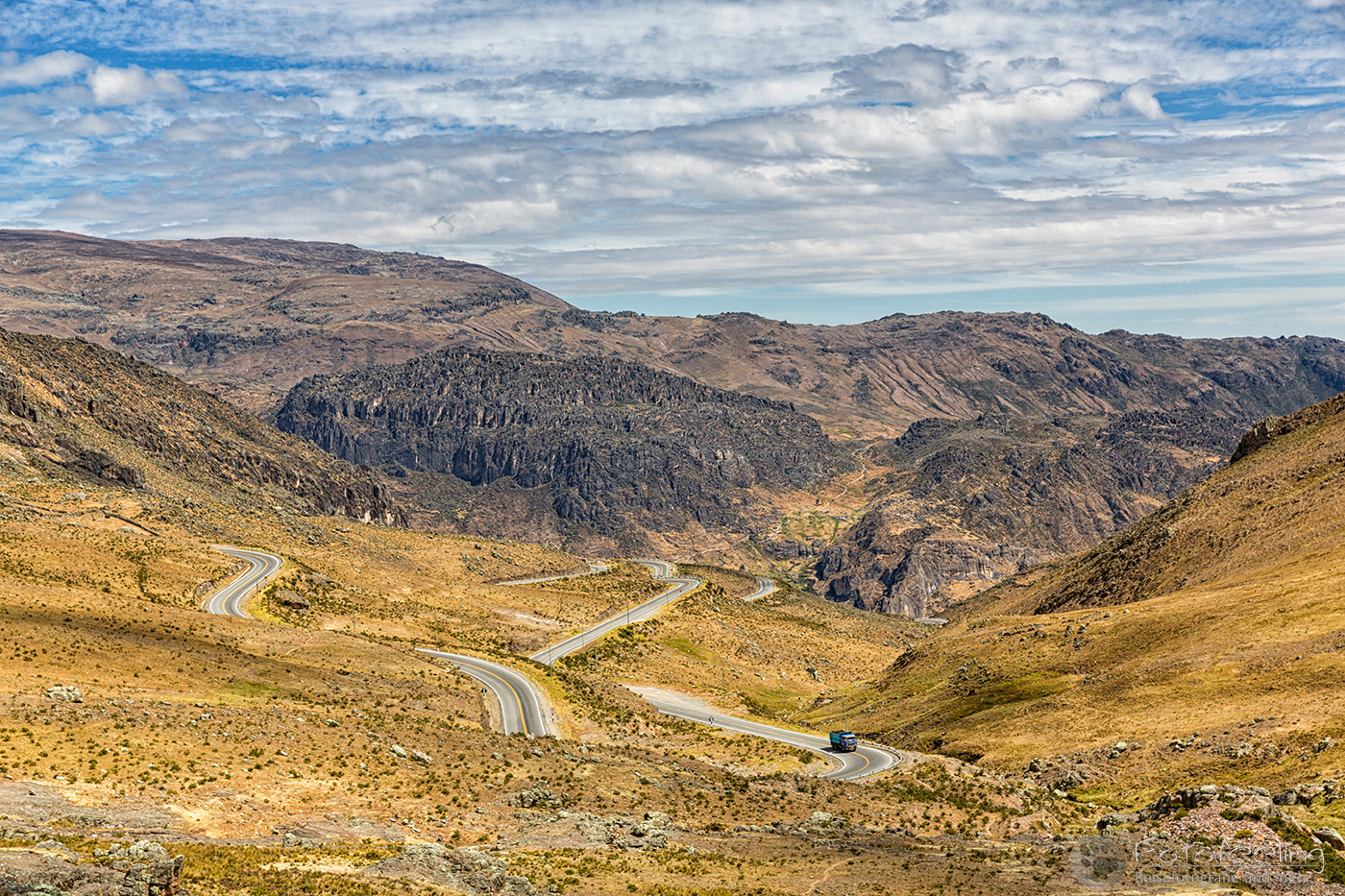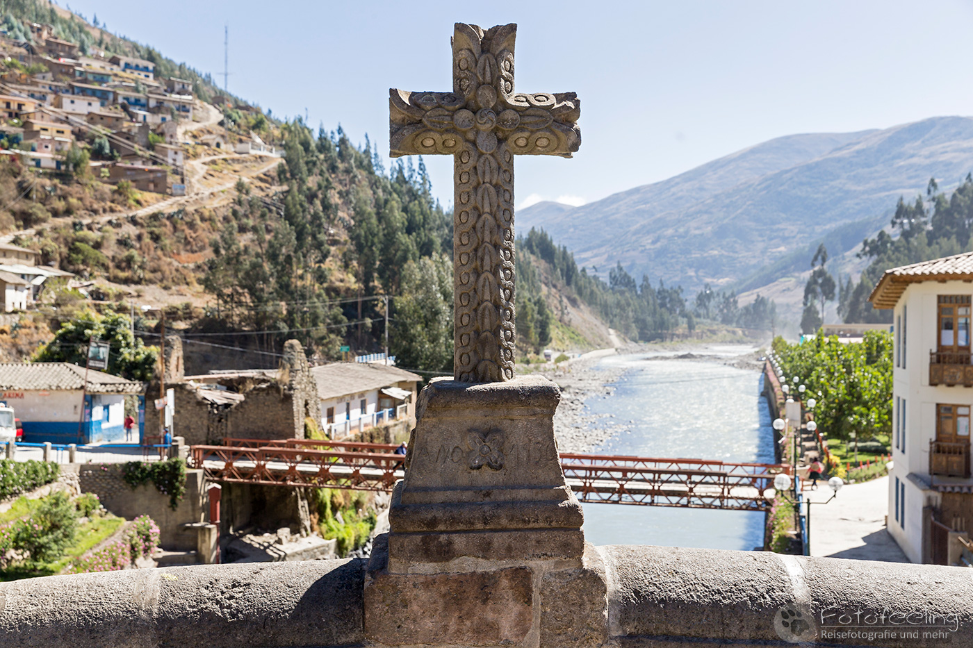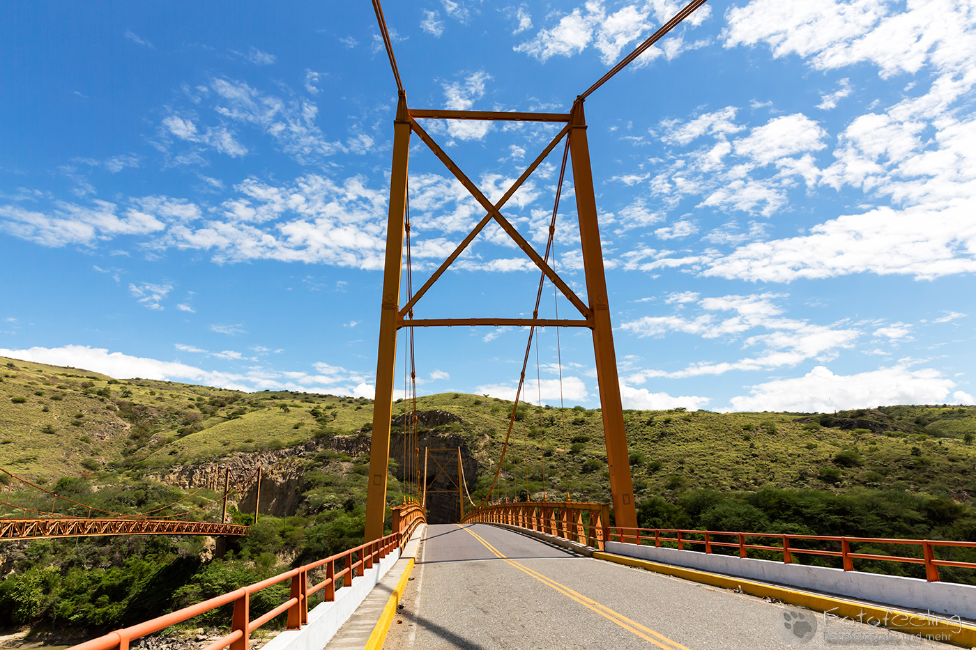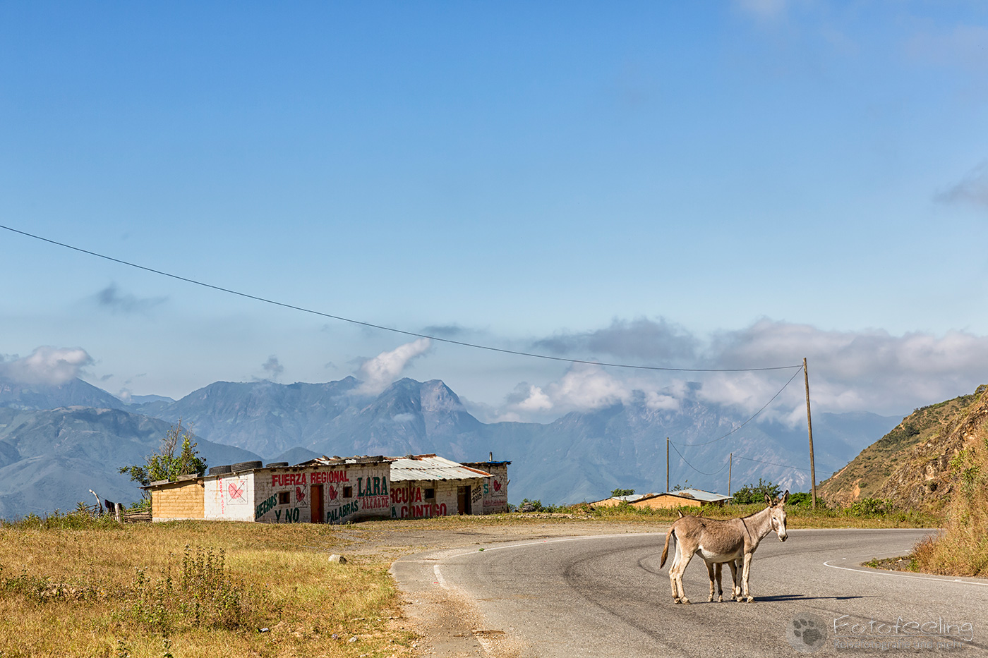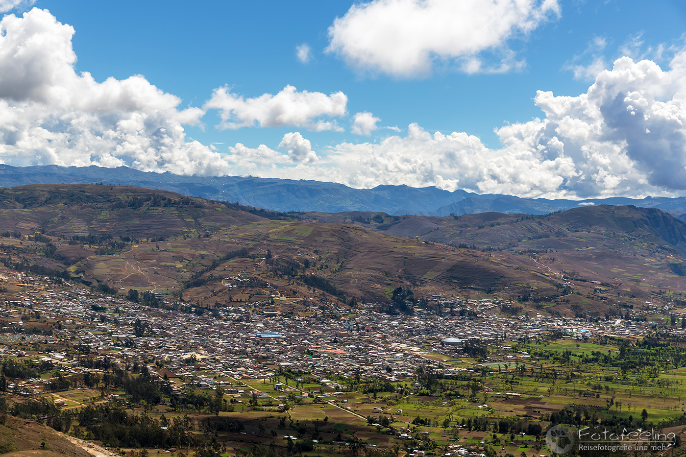 Die Straße schlängelte sich bis auf 2000 m die Berge hinauf. Tiefe Täler und malerische Bergdörfer wechselten sich ab. Immer wieder gingen Esel, Schafe oder Kühe die Straße entlang. Wir fuhren über den 2137 m hohen Pass „Abra de Porcuya“, einen der niedrigsten der Anden. Auch hier wurde permanent an der Straße gearbeitet und so mussten wir immer wieder anhalten und warten. Trotz der Pare = Stopp Schilder hupen die Südamerikaner genervt. Also Geduld ist wirklich nicht ihre Stärke. An einer etwas längeren Straßensperre wurden immer wieder Lebensmittel, Getränke und Obst angeboten. Das Geschäft schien sich zu lohnen, denn Knabbereien und Getränke verschwanden in den wartenden Autos. Wir hatten alles dabei. Als es endlich weiter ging, hupte und knatterte irgendwo ein Auto – ohrenbetäubend laut. Was für eine coole Hupe. Das musste der Laster vor uns sein, dachten wir. Die Hupe war echt der Hammer, aber warum stellte der Fahrer sie nicht ab und machte dauerhaft Lärm. Das Geräusch blieb auch immer gleich laut… Irgendwann meinte ich zu Chris: „Ich glaube, wir sind das!“ Mit einem ungläubigen Schulterzucken stoppte Chris den Wagen und wir lauschten. Jetzt war es noch viel lauter, wieder hupten wir anhaltend, dann kam ein keckerndes Jukebox Geräusch, um gleich darauf wieder von dem Hupen abgelöst zu werden. Wenn wir jetzt noch gehüpft wären, hätten wir glatt in einer Komödie mitspielen können… Wie auch immer - Chris hatte irgendwie die Alarmanlage aktiviert und brauchte ein wenig, bis er das Auto wieder im Griff hatte.