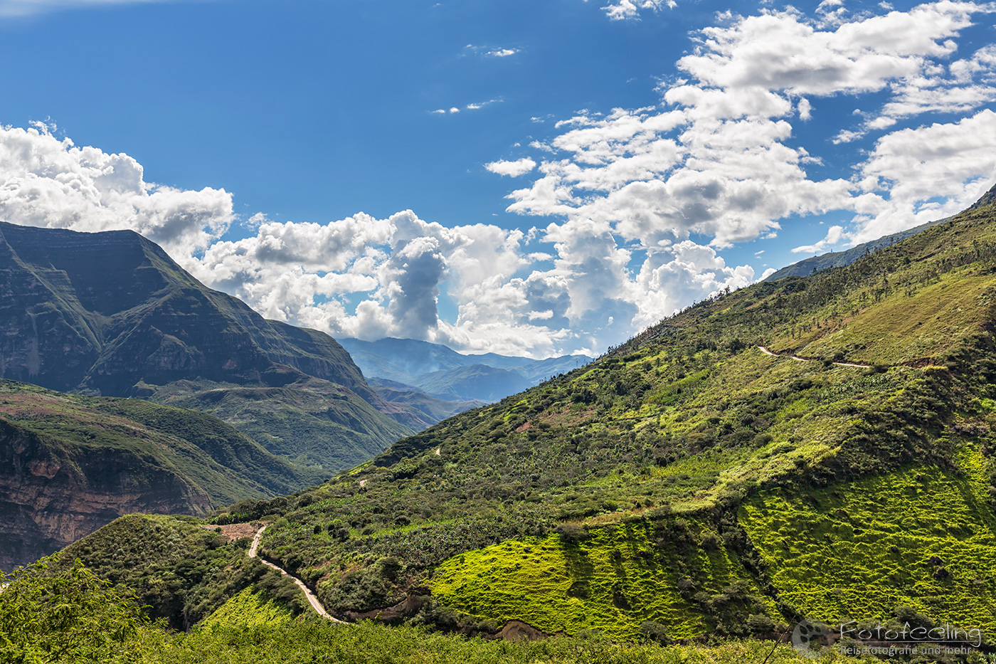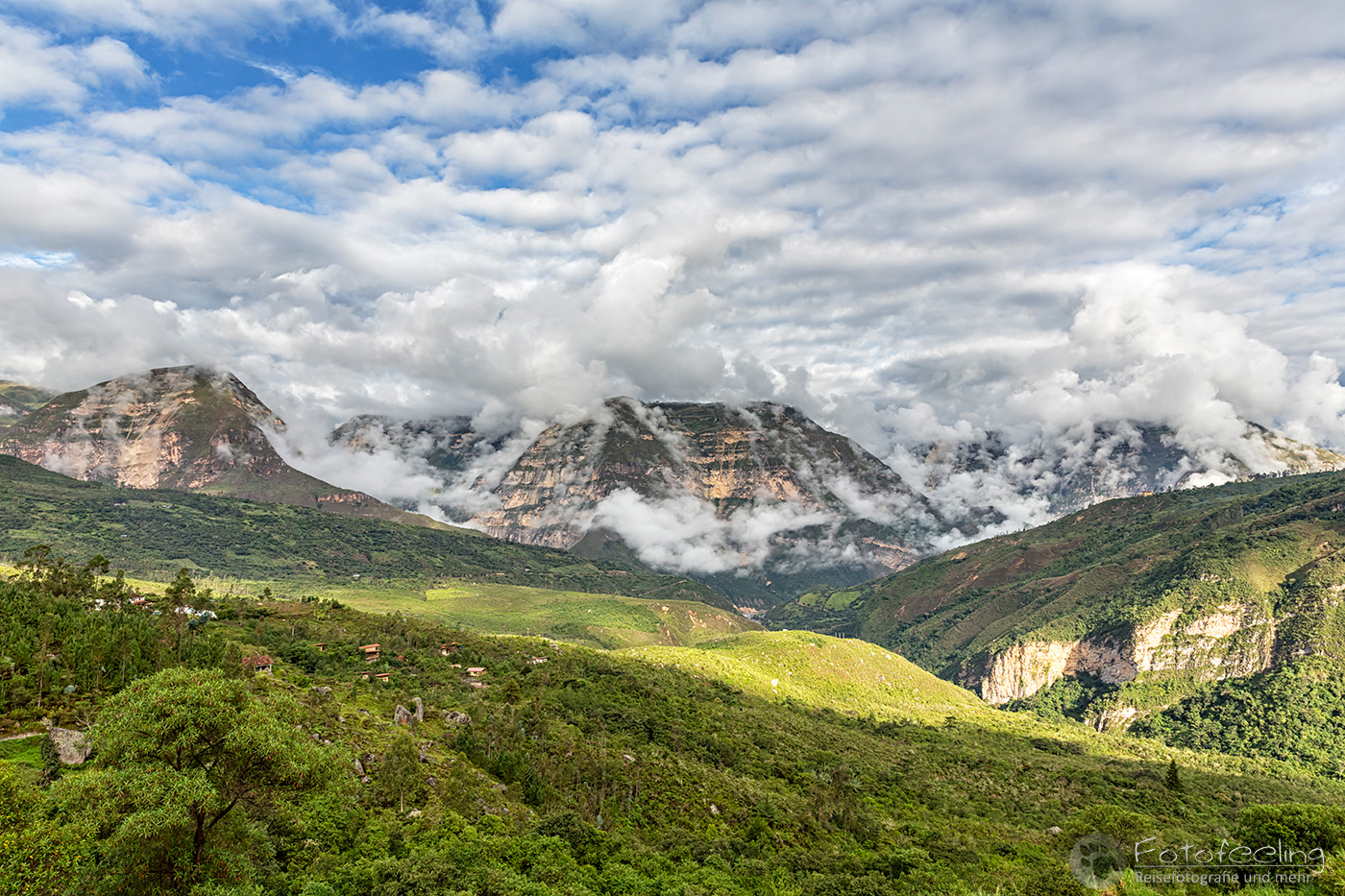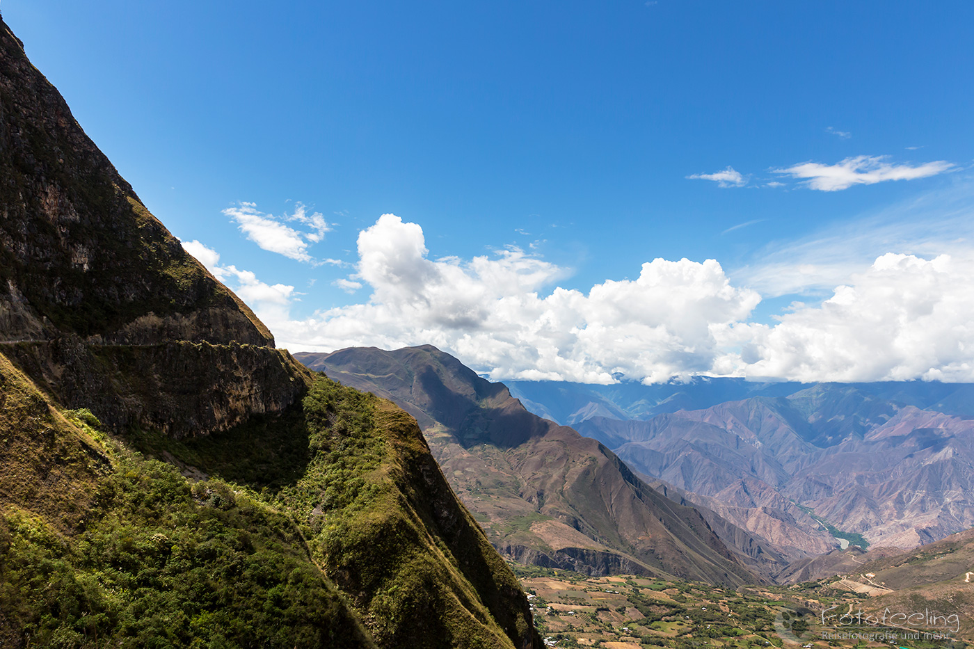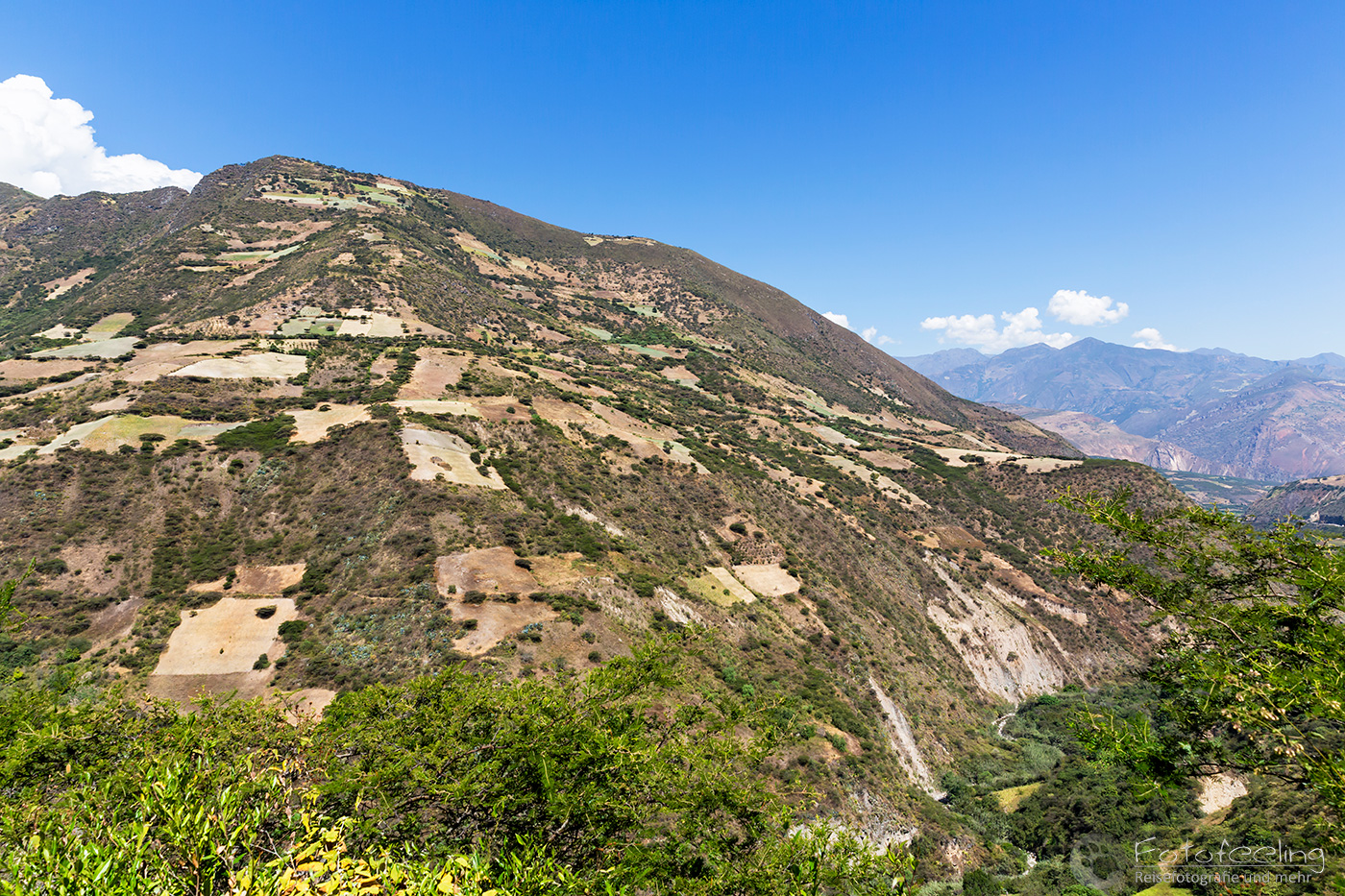 Je weiter wir nach Osten kamen, desto vegetationsreicher wurde die Gebirgslandschaft, wobei uns der Amazonas-Quellfluss Rio Marañon eine Zeitlang begleitete, der später vom Rio Utcubamba abgewechselt wurde. Hier merkten wir auch deutlich, dass wir in den Bergen des Amazonas unterwegs waren, denn es war warm und überall wunderbar grün. Immer wieder entdeckten wir Wasserfälle. Die Berge waren von buntem Gestein oder mit Pflanzen bewachsen. Auch die Temperatur stieg stetig bis auf schwülwarme 33°C. Vögel zwitscherten und ab und zu konnten wir sogar Papageien entdecken.