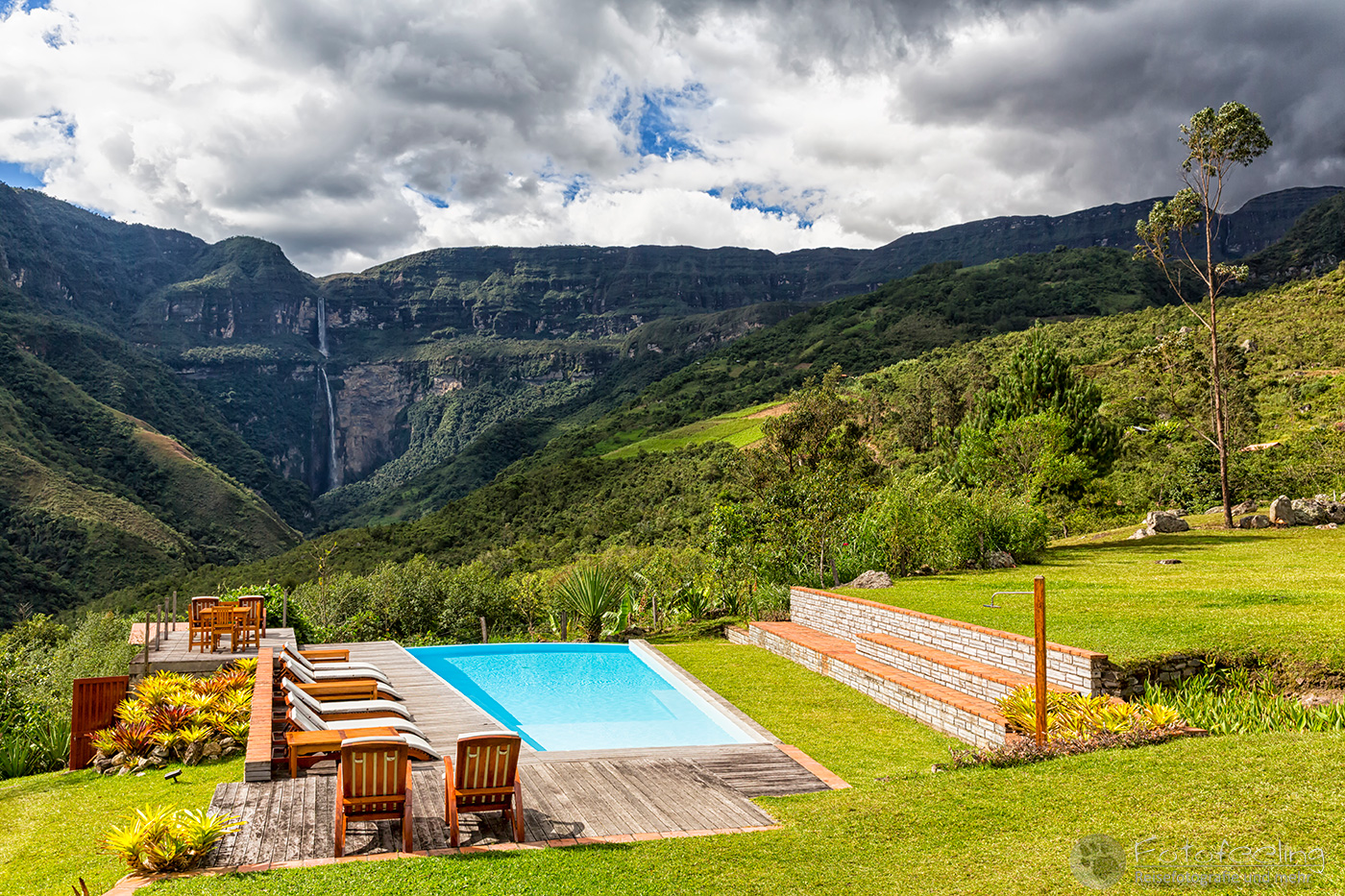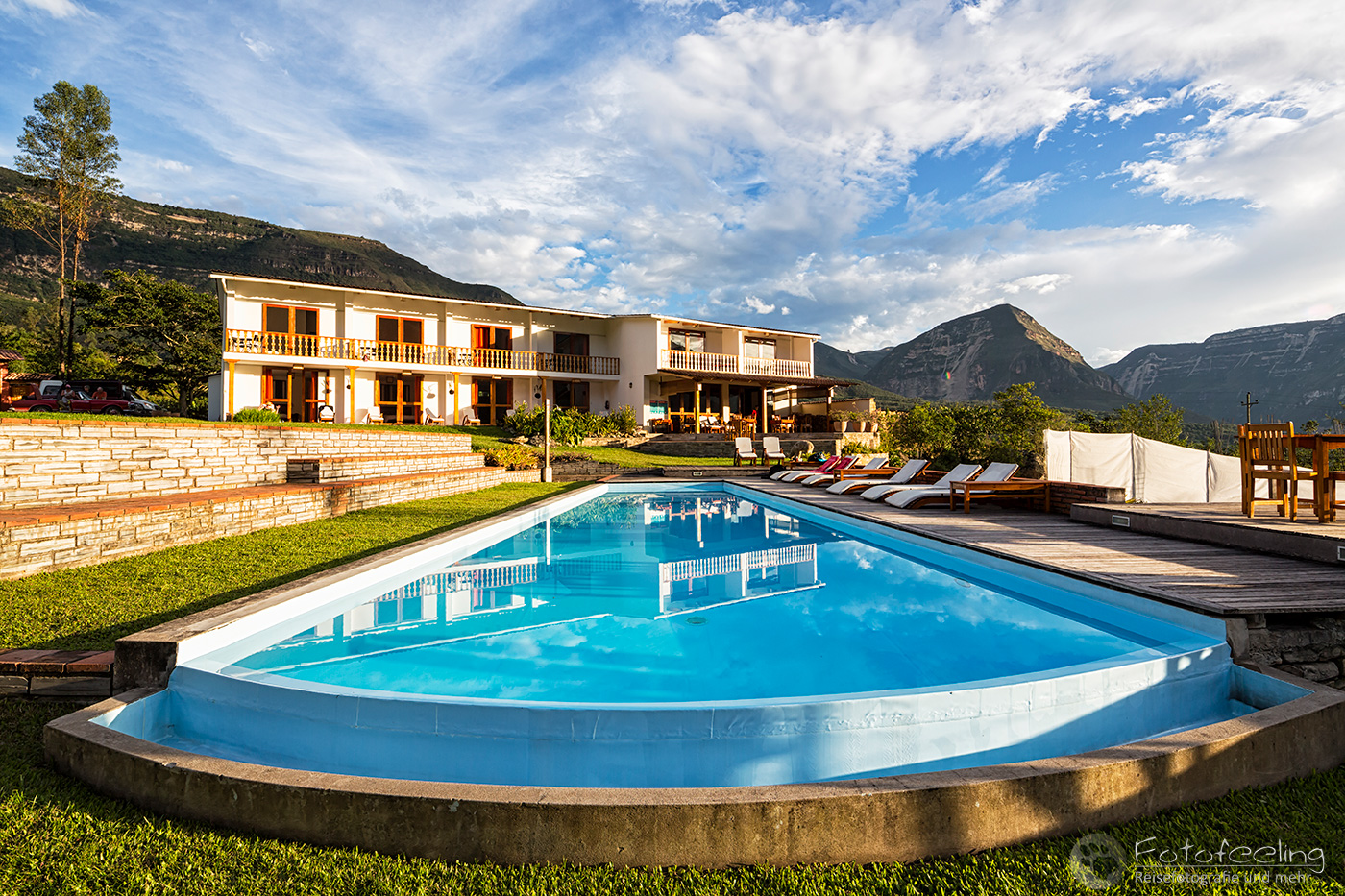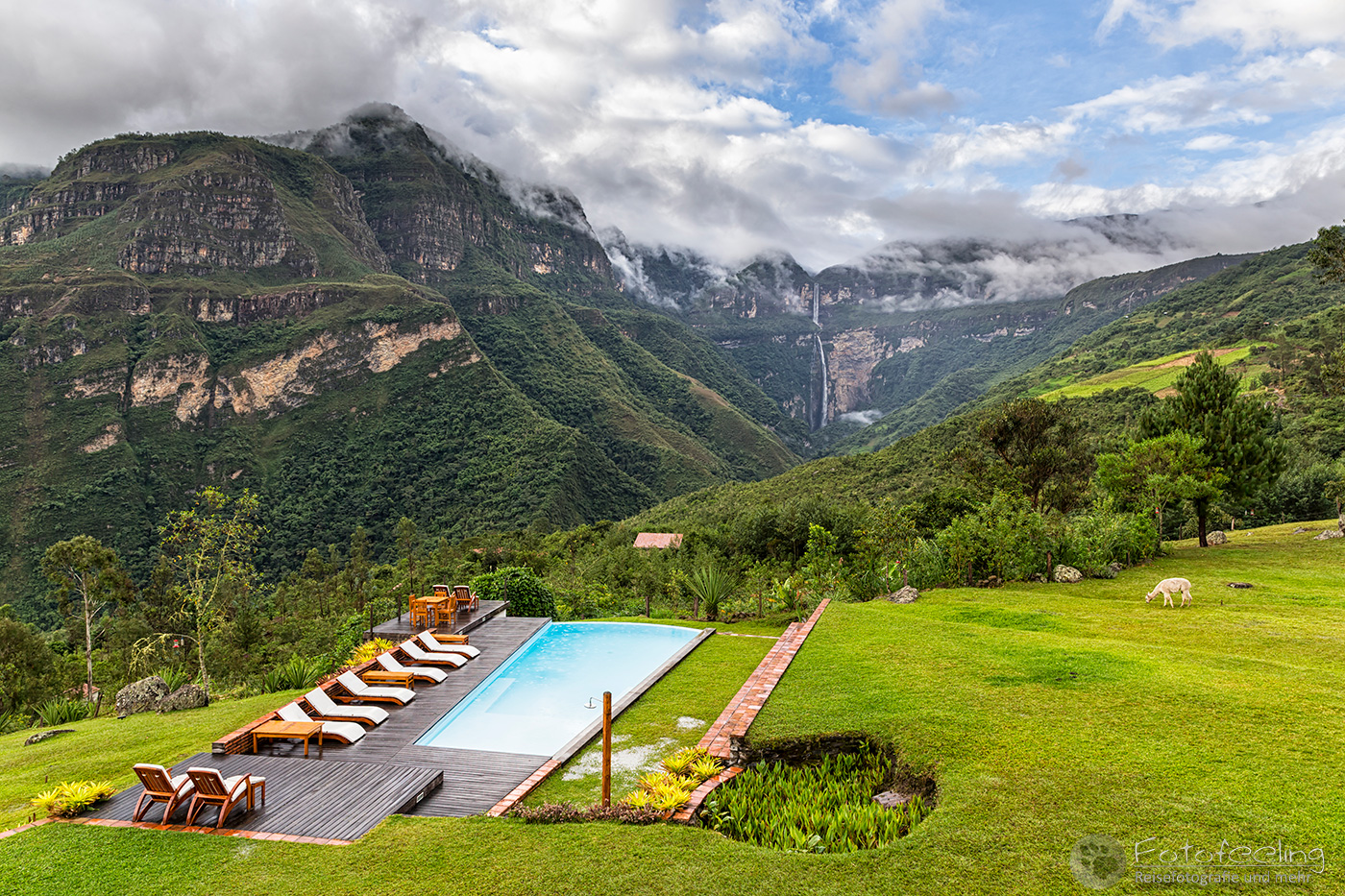 Wir verbrachten den Rest des Tages am Pool, lasen und genossen das sommerlich schöne Wetter. Auf der Wiese vor dem Haus grasten Lamas und vervollständigten das Bild einer idyllischen Berglandschaft. Ein weiterer Wasserfall rechts von der Lodge war wohl übergegangen und braunes Wasser schoss in die Tiefe. Später war er nur noch ein dünnes Rinnsal, aber an diesem Nachmittag sehr eindrucksvoll.