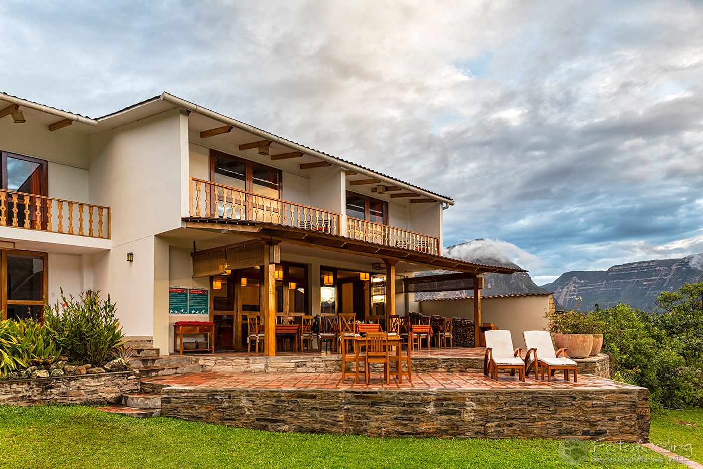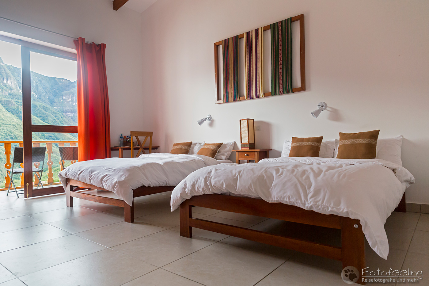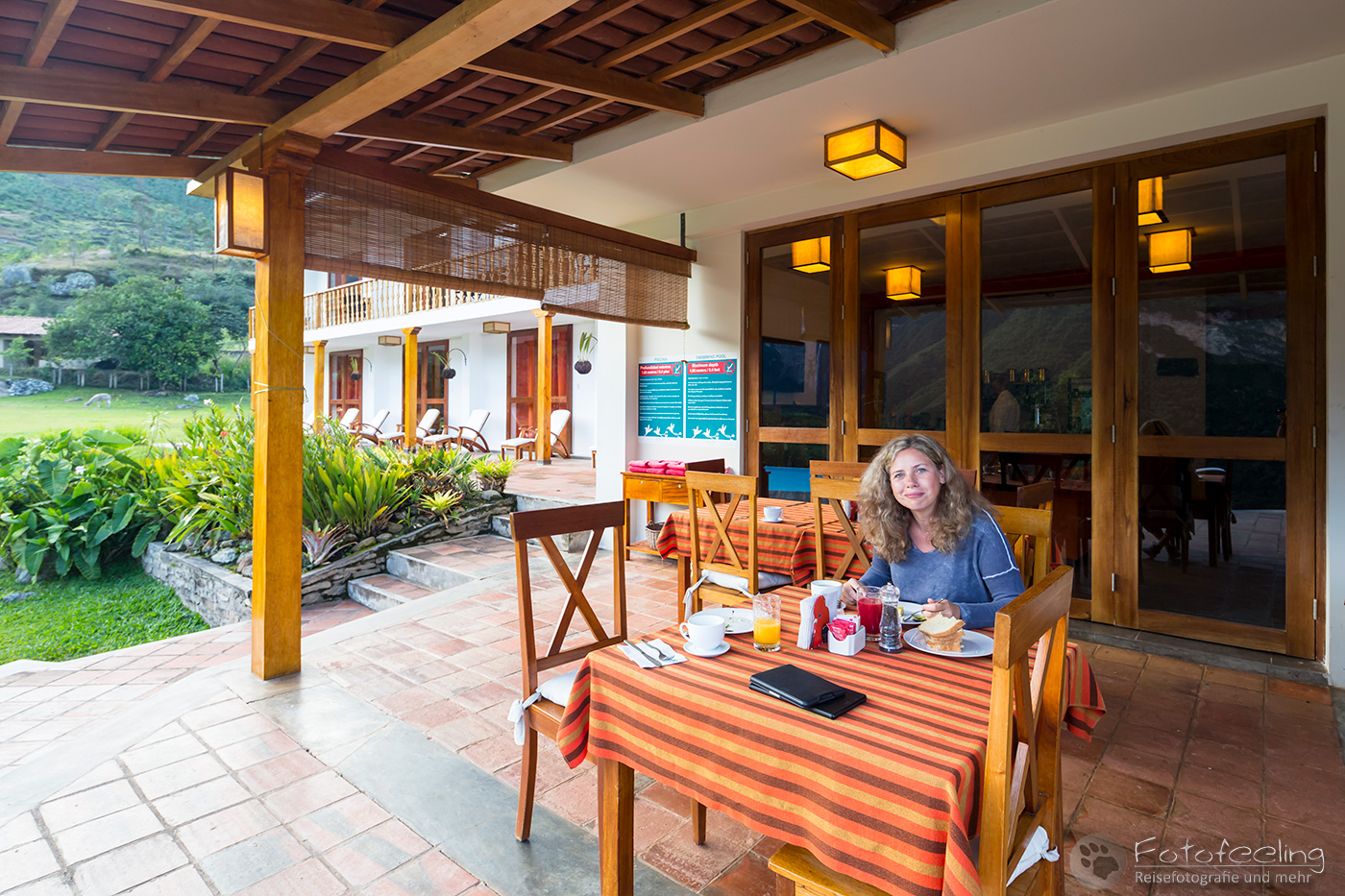Die Gocta Lodge war gar nicht so einfach zu finden. Gab es weiter vorne noch Schilder, war direkt an der kleinen Straße zur Lodge gar nichts und wir fuhren erst einmal vorbei. Der zweite Versuch klappte dann aber und wir erreichten unsere Bleibe. Ein netter zweistöckiger Bau lag vor uns. Wir schnappten unsere Taschen und checkten ein. Da wir noch etwas früh dran waren, war das Zimmer noch nicht fertig. So erkundeten wir erst einmal den Garten und Poolbereich. Hier war es wirklich idyllisch und wir fühlten uns sofort wohl. Hinter dem Pool entdeckten wir den Gocta Wasserfall, wunderschön in die zerklüftete Bergwelt eingebettet. Bei genauerer Betrachtung sahen wir noch zwei weitere kleinere Wasserfälle in den Bergen. Wir tranken einen Kaffee und genossen die tolle Landschaft. Um 15.00 Uhr war dann unser Zimmer im 2. Stock fertig und wir konnten nach oben. Dummerweise fehlte jedoch die Balkontür bzw. das Glas, aber das sollte noch repariert werden.