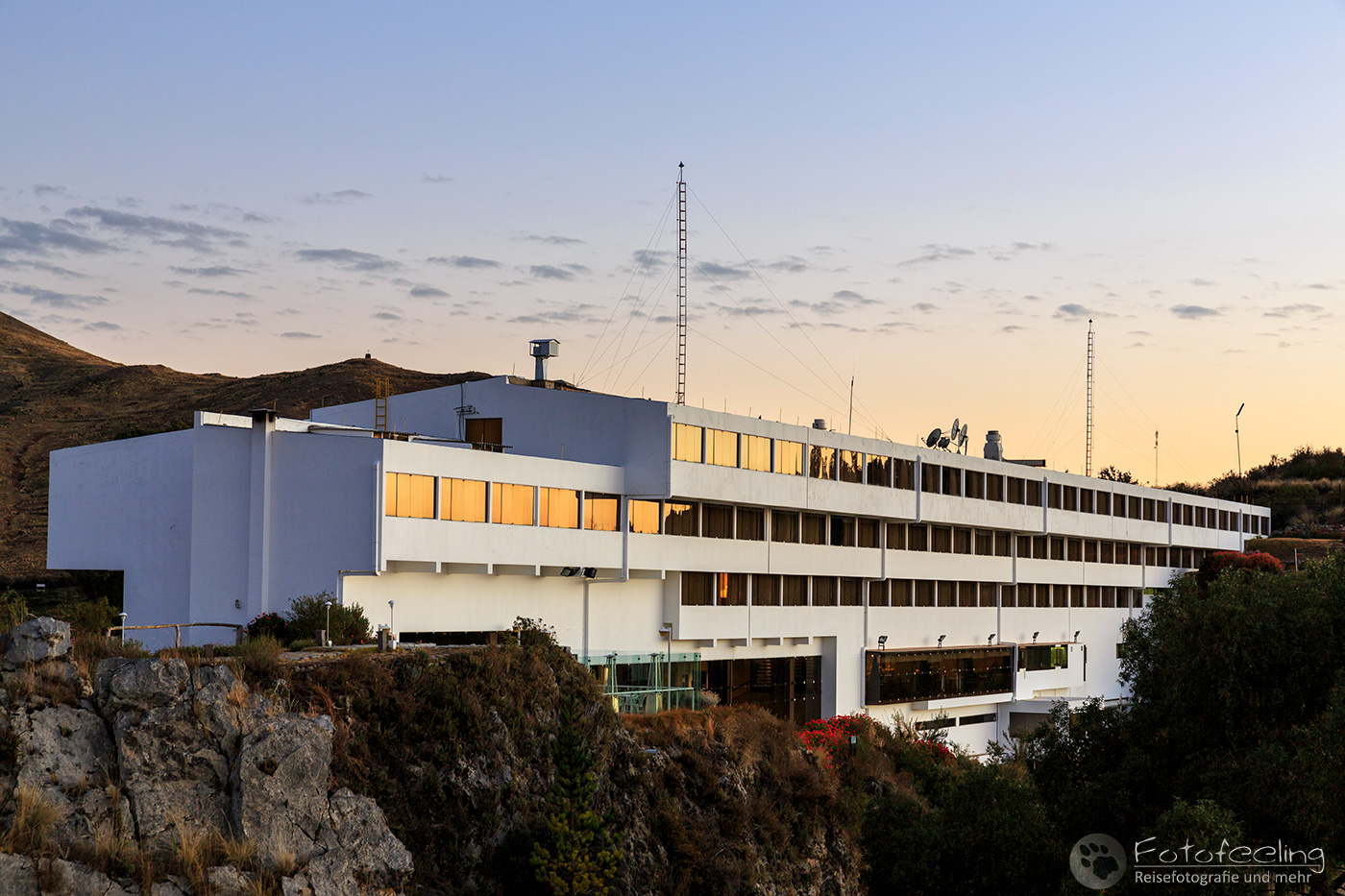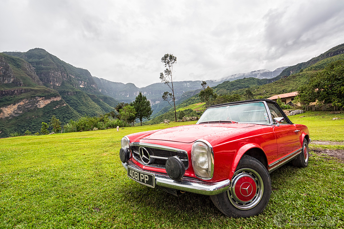Zum Sonnenuntergang genossen wir unseren Pisco Sour in dieser Idylle. Zwei weitere Autos fuhren auf den Hof. Das wäre ja eigentlich nicht so etwas Besonderes, aber der eine Wagen war ein knallrotes Mercedes 280 SL Cabriolet (Bj. 1956) und wir fragten uns, wie der Fahrer wohl durch die Baustelle gekommen sei. Chris war auf alle Fälle hin und weg und lief verzückt um das Auto herum. Dabei kam er mit dem Fahrer ins Gespräch und der erzählte ihm, dass er mit dem Wagen schon drei Mal in Indien, in Südafrika und Südamerika unterwegs gewesen ist. Diesmal ging es von Kolumbien über Ecuador nach Lima. Jetzt war sogar ich beeindruckt.