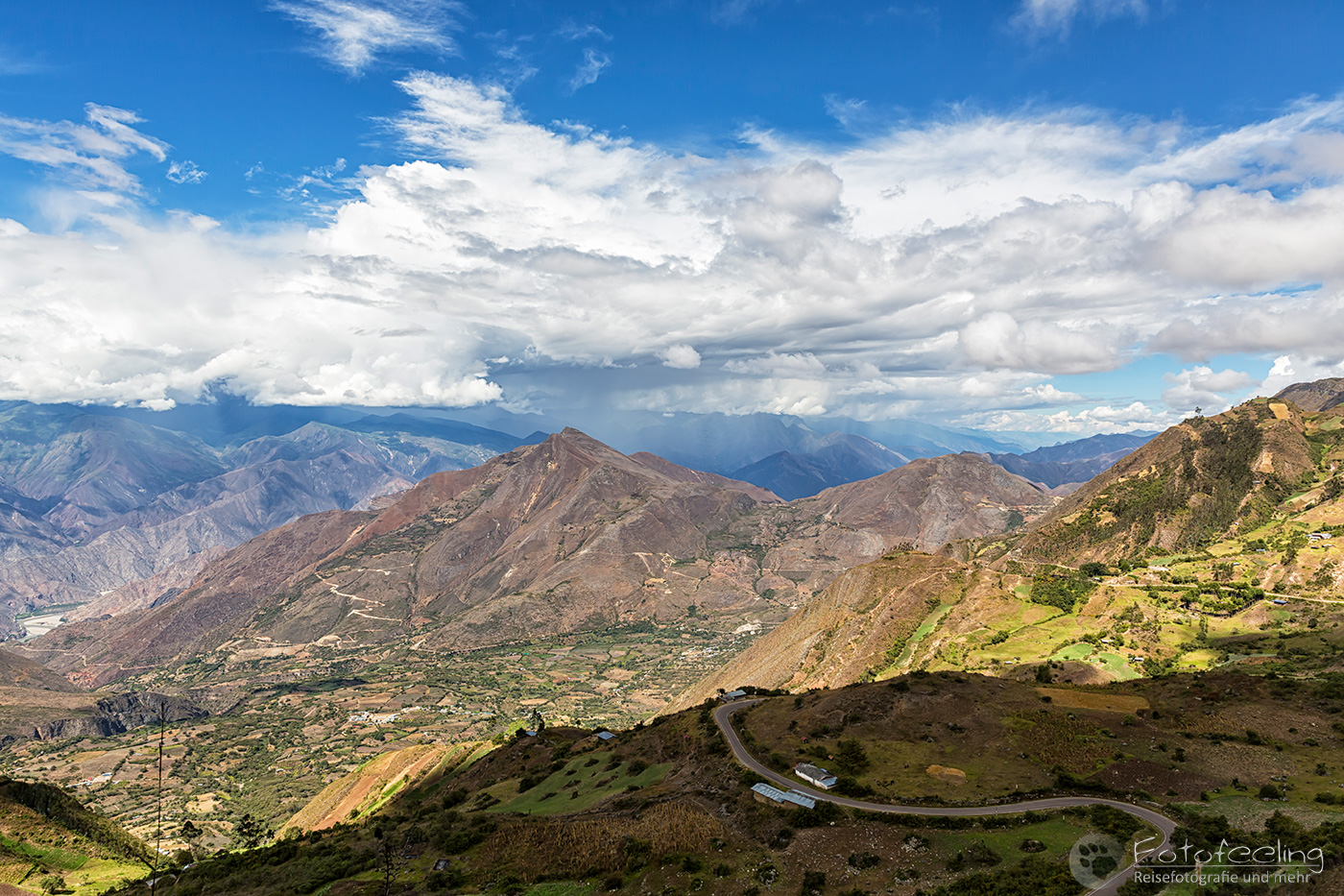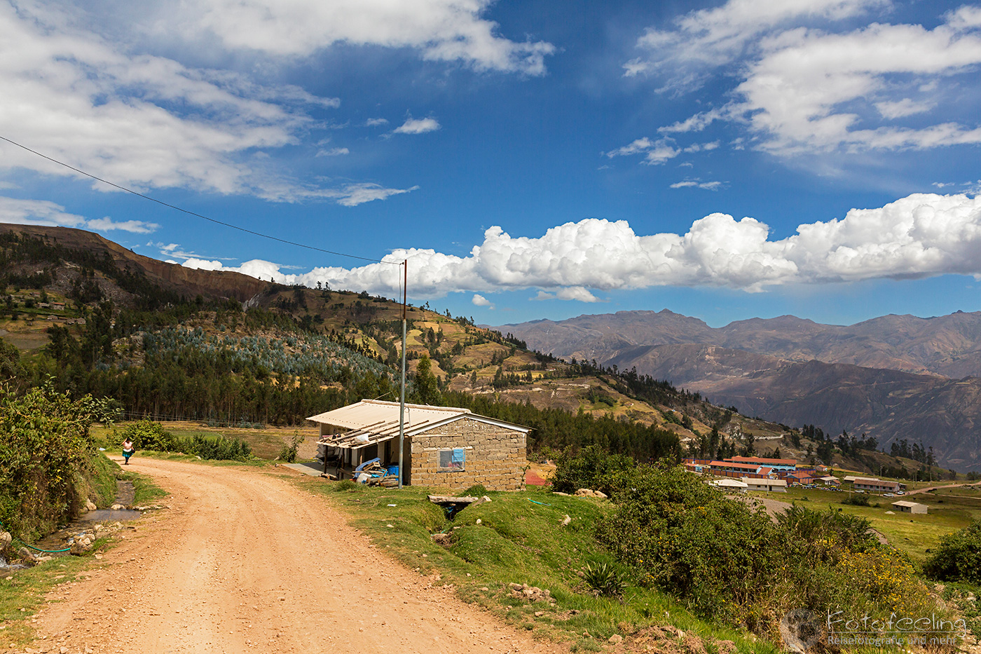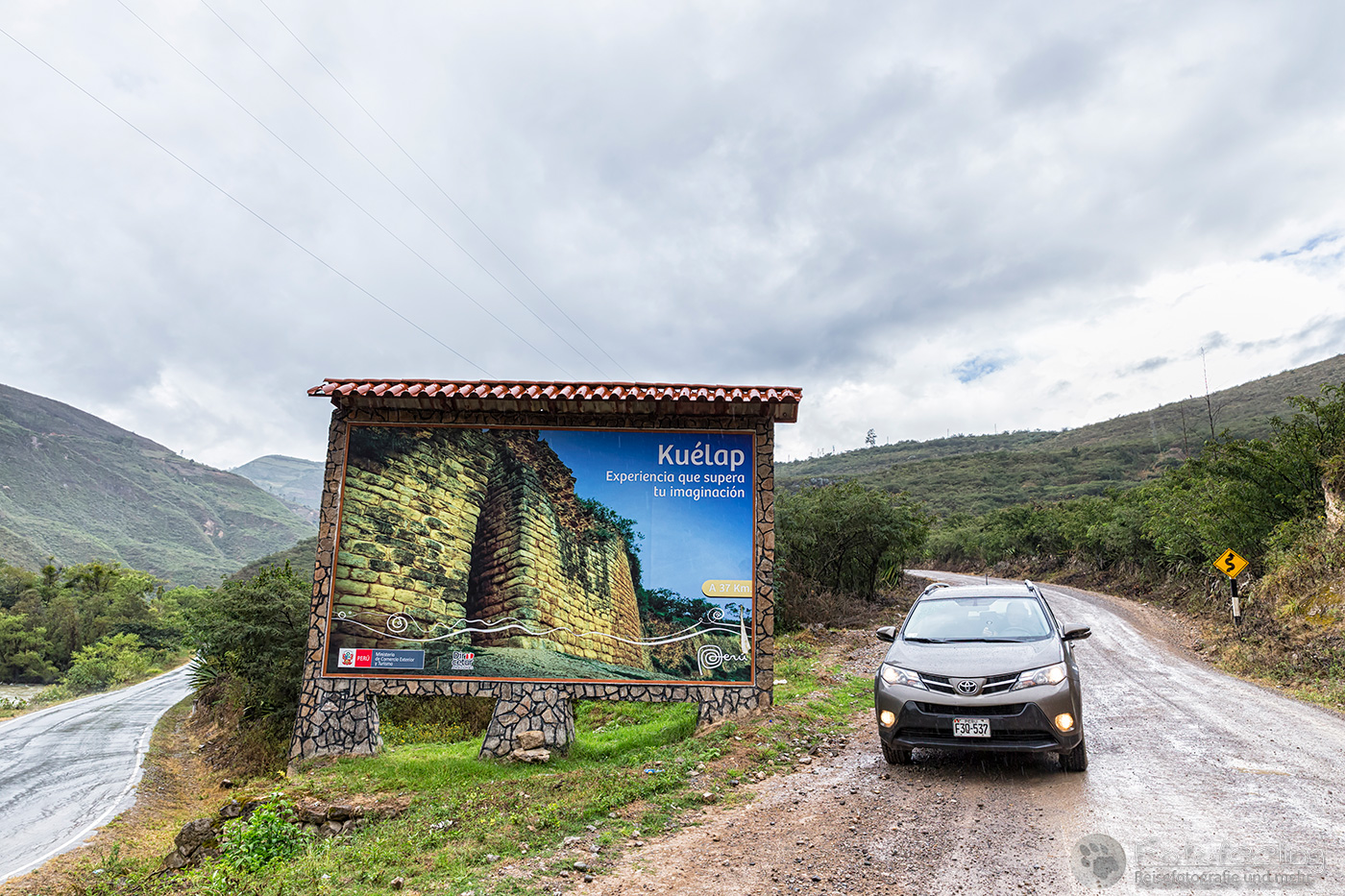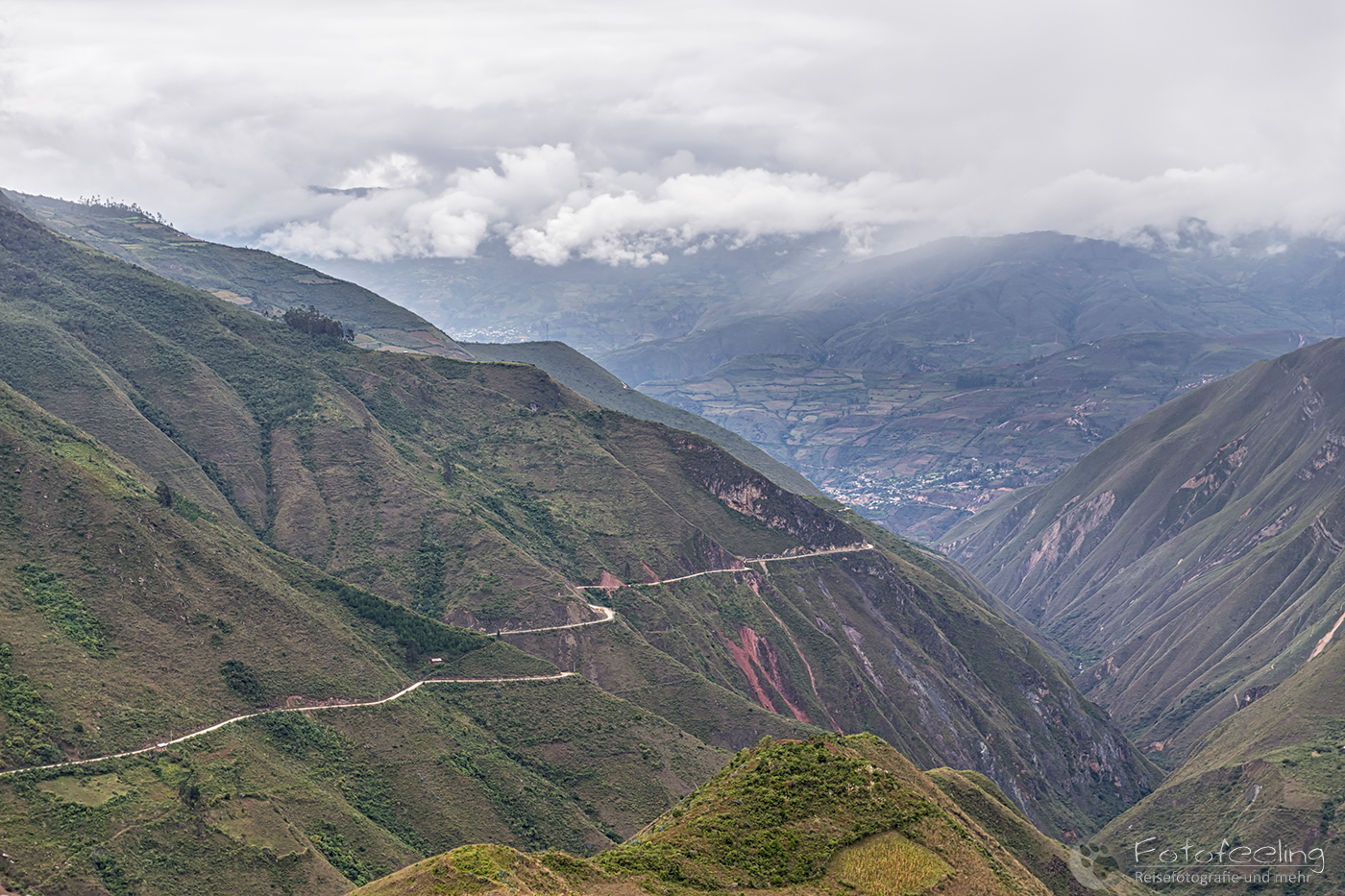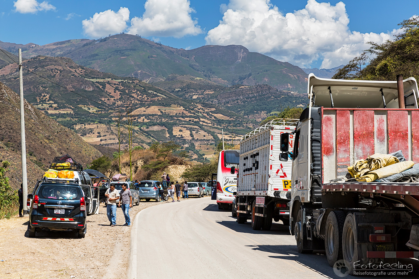 Alleine schon die Anfahrt war spektakulär. Anfangs fuhren wir auf der Teerstraße am Utcubamba Fluss entlang. Die Straße war schmal, aber zweispurig, dafür war sie stellenweise in die Felsen gehauen, so dass wir in einer Art Halbtunnel fuhren. Das war schon sehr beeindruckend. Immer wieder lagen herabgefallenen Steine und Felsbrocken auf der Straße und wir hoffte, dass unser Felsendach hielt. Später zweigten wir auf eine sehr schmale Straße ab, am Morgen war hier noch fast kein Verkehr. Dann kam der Abzweig nach Kuélap. Auf einer einspurigen Straße schraubten wir uns in zahlreichen Serpentinen 37 km die Anden hinauf. Vor jeder Kurve hupten und lauschten wir auf ein Gegenhupen. Trotzdem standen wir mehrfach Kühlerhaube an Kühlerhaube mit einem riesigen Baufahrzeug und mussten uns nach einem Ausweichplatz umschauen, denn nur selten hupten die Laster. Also reckten wir vor jeder Kurve die Hälse, um notfalls schnell bremsen zu können. Je höher wir kamen, desto tiefer lag das Tal unter uns. Wir kamen an der Baustelle für die neue Seilbahn vorbei, die demnächst die Strecke von ca. 30 km auf Luftlinie 2 km verkürzen soll. Irgendwie waren wir hin und hergerissen zwischen dem Gedanken, dass es gut für die Touristen sei, denn bisher kamen sie nur mit dem eigenen Auto, per Taxi oder Kleinbus zur Anlage und dem Gedanken, dass diese Festungsanlage in Zukunft vielleicht ähnlich überlaufen sein wird wie Machu Picchu.