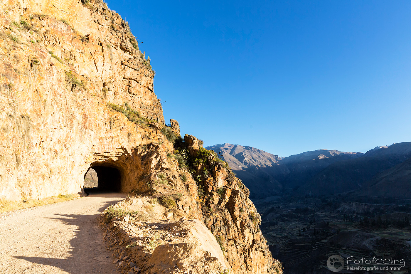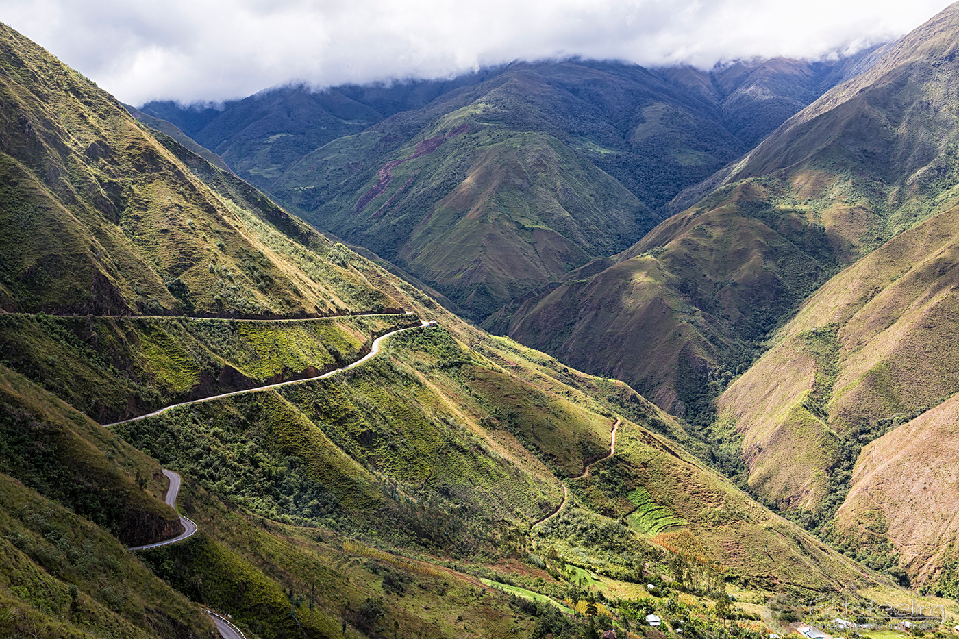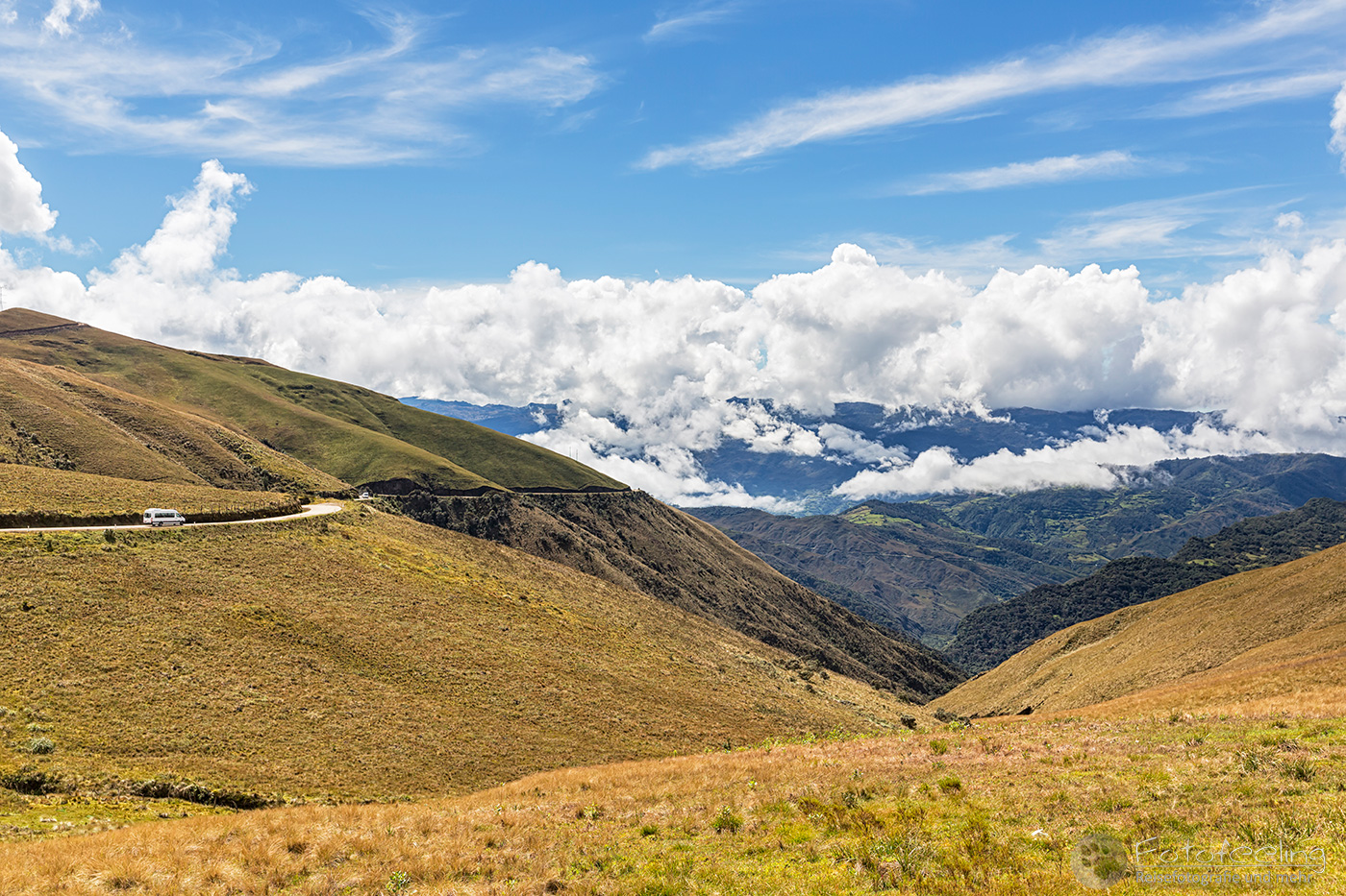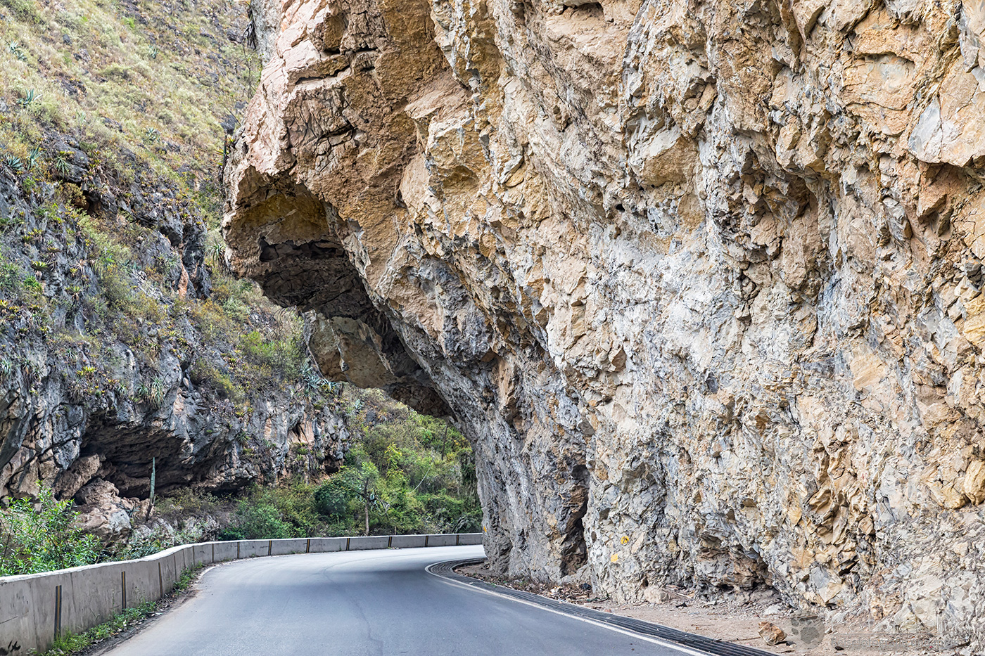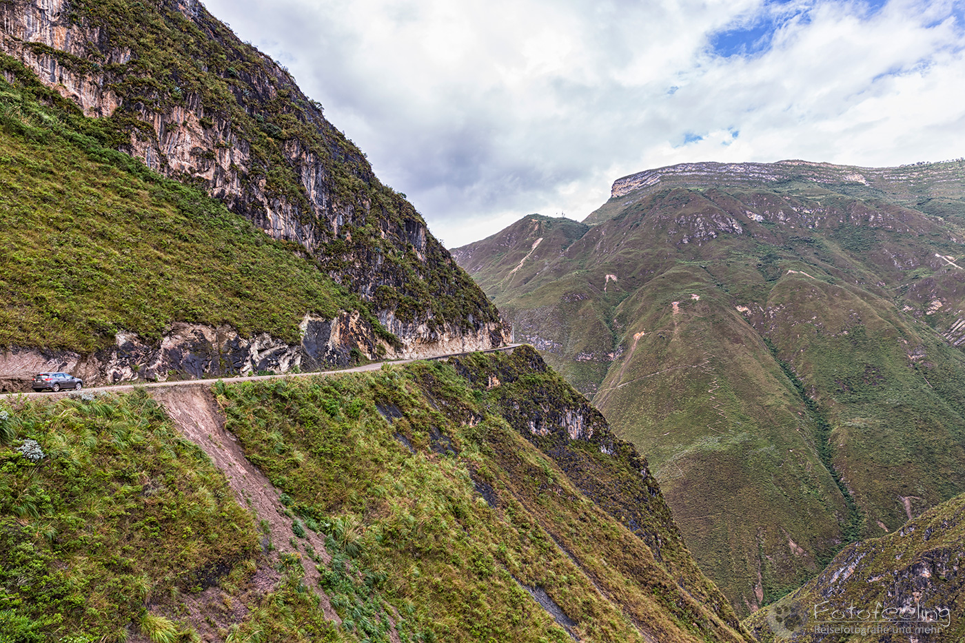 Alleine schon die Anfahrt war spektakulär. Anfangs fuhren wir auf der Teerstraße am Utcubamba Fluss entlang. Die Straße war schmal, aber zweispurig, dafür war sie stellenweise in die Felsen gehauen, so dass wir in einer Art Halbtunnel fuhren. Das war schon sehr beeindruckend. Immer wieder lagen herabgefallenen Steine und Felsbrocken auf der Straße und wir hoffte, dass unser Felsendach hielt. Später zweigten wir auf eine sehr schmale Straße ab, am Morgen war hier noch fast kein Verkehr. Dann kam der Abzweig nach Kuélap. Auf einer einspurigen Straße schraubten wir uns in zahlreichen Serpentinen 37 km die Anden hinauf. Vor jeder Kurve hupten und lauschten wir auf ein Gegenhupen. Trotzdem standen wir mehrfach Kühlerhaube an Kühlerhaube mit einem riesigen Baufahrzeug und mussten uns nach einem Ausweichplatz umschauen, denn nur selten hupten die Laster. Also reckten wir vor jeder Kurve die Hälse, um notfalls schnell bremsen zu können. Je höher wir kamen, desto tiefer lag das Tal unter uns. Wir kamen an der Baustelle für die neue Seilbahn vorbei, die demnächst die Strecke von ca. 30 km auf Luftlinie 2 km verkürzen soll. Irgendwie waren wir hin und hergerissen zwischen dem Gedanken, dass es gut für die Touristen sei, denn bisher kamen sie nur mit dem eigenen Auto, per Taxi oder Kleinbus zur Anlage und dem Gedanken, dass diese Festungsanlage in Zukunft vielleicht ähnlich überlaufen sein wird wie Machu Picchu.