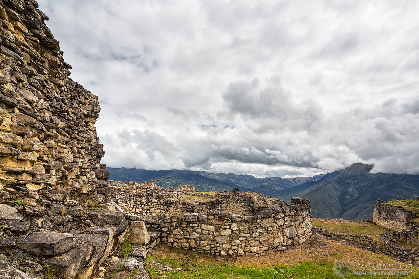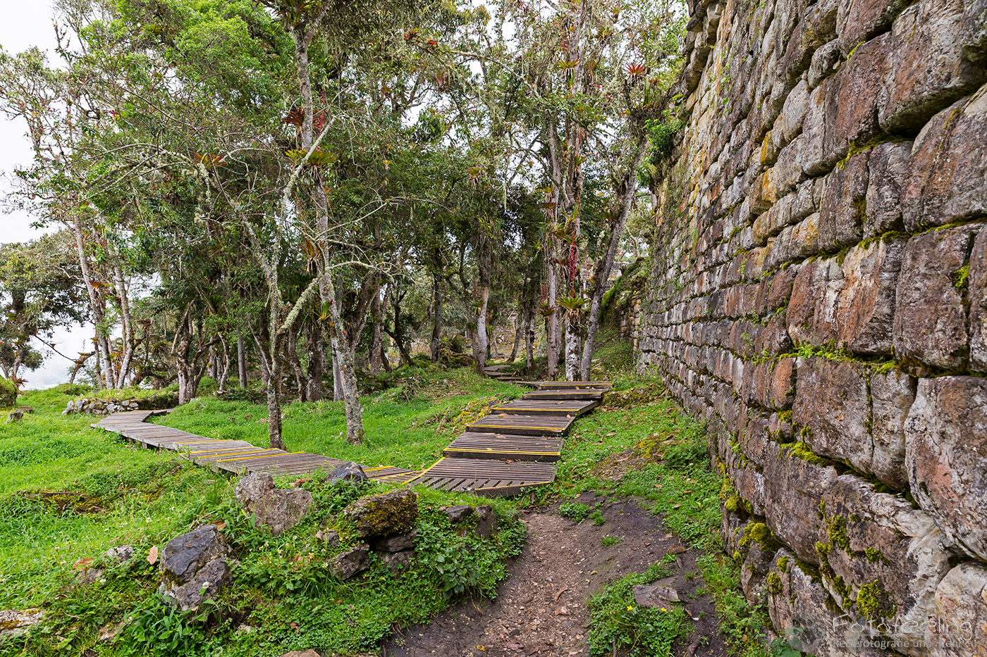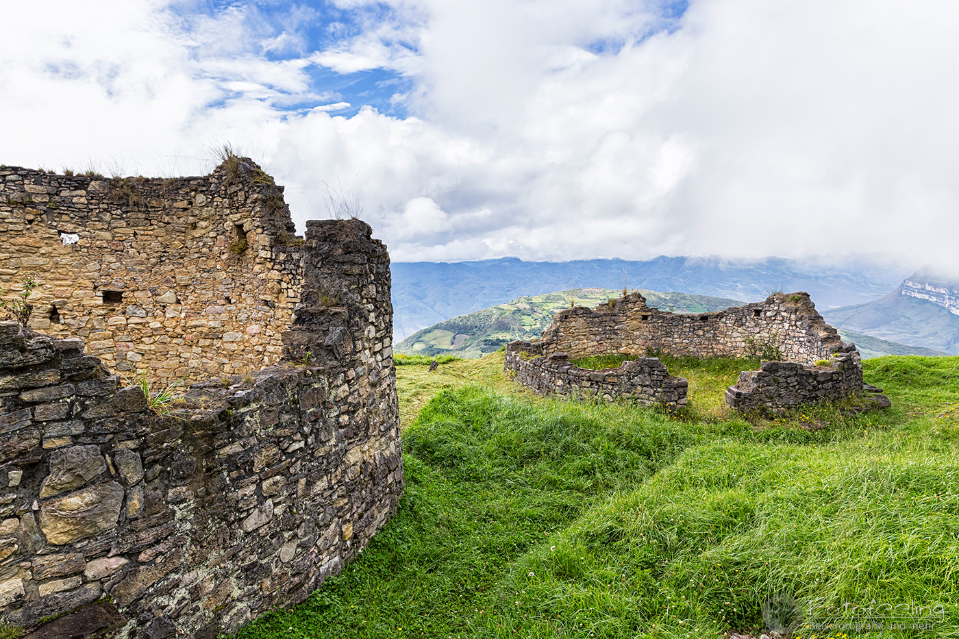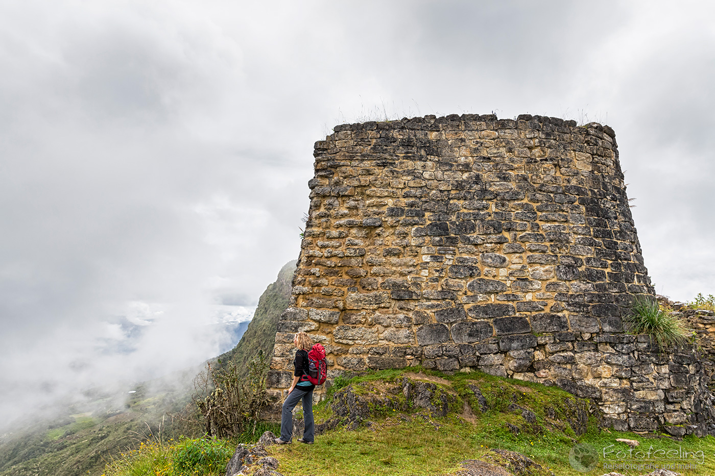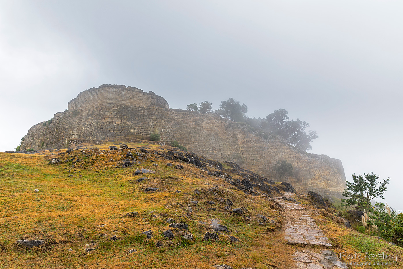 Der Weg war schon atemberaubend. Es ging stetig leicht bergauf und das in einer Höhe von über 3000 m. Nach einer Weile konnten wir die Festungsmauern erblicken. Sie waren von tiefhängenden Wolkenfetzen eingerahmt und es nieselte leicht. Ab und zu kam ein „Wolkenloch“ und die Umrisse der Mauern wurden etwas klarer. Ehrfurchtsvoll blieben wir stehen und betrachteten diese riesige Festungsanlage. Während die Augen die Mauern erkundeten, erwartete man fast, die Umrisse eines Chachapoya Kriegers zu erblicken, der nach Feinden Ausschau hält.