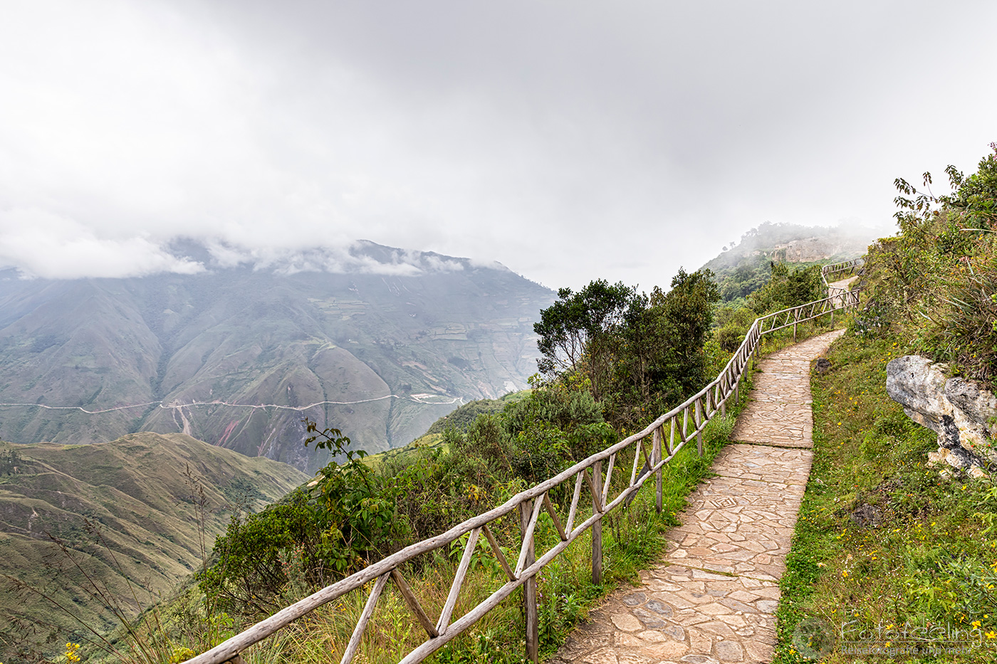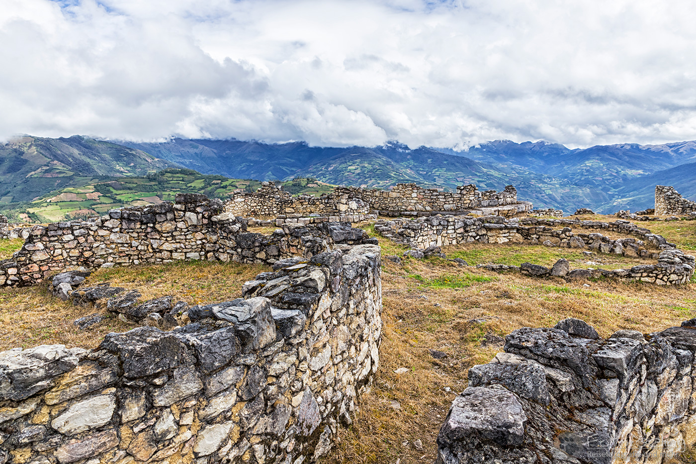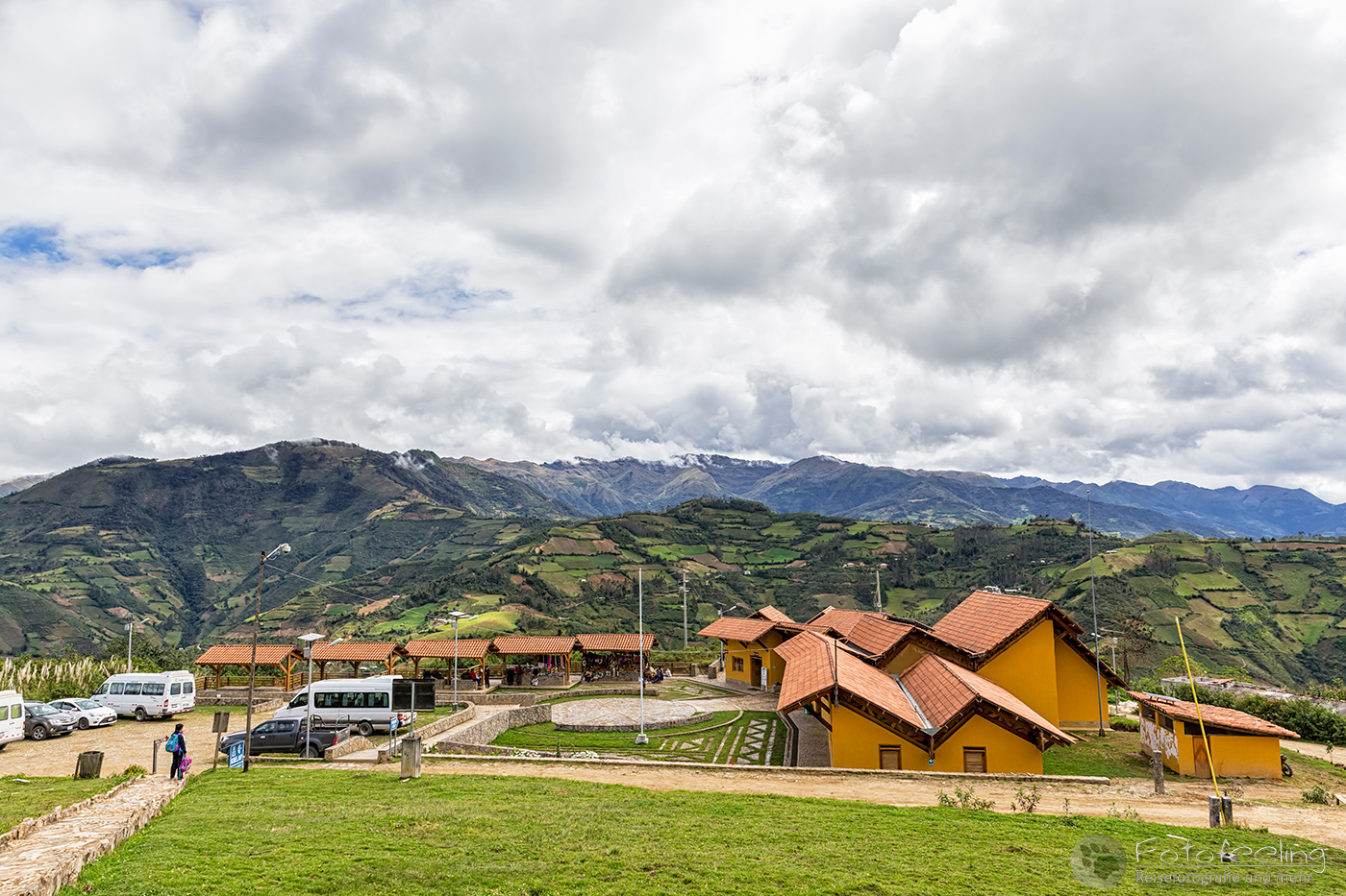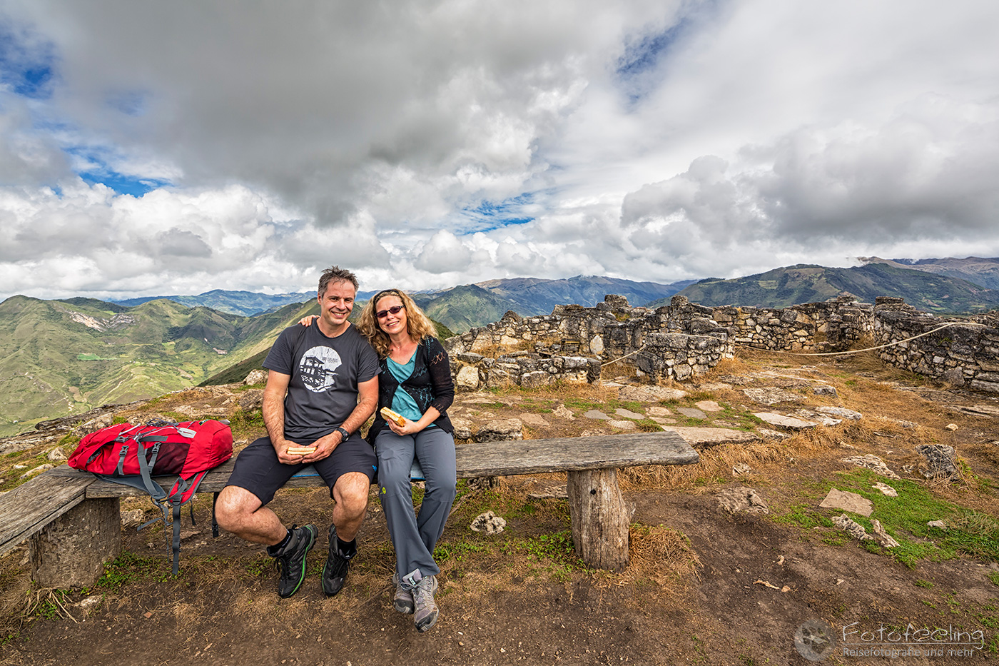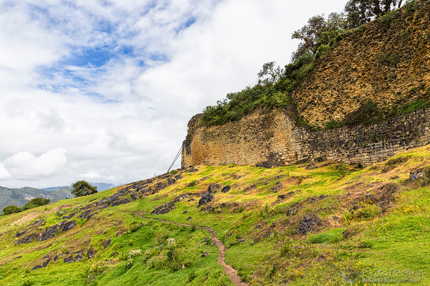 Der Weg war schon atemberaubend. Es ging stetig leicht bergauf und das in einer Höhe von über 3000 m. Nach einer Weile konnten wir die Festungsmauern erblicken. Sie waren von tiefhängenden Wolkenfetzen eingerahmt und es nieselte leicht. Ab und zu kam ein „Wolkenloch“ und die Umrisse der Mauern wurden etwas klarer. Ehrfurchtsvoll blieben wir stehen und betrachteten diese riesige Festungsanlage. Während die Augen die Mauern erkundeten, erwartete man fast, die Umrisse eines Chachapoya Kriegers zu erblicken, der nach Feinden Ausschau hält.