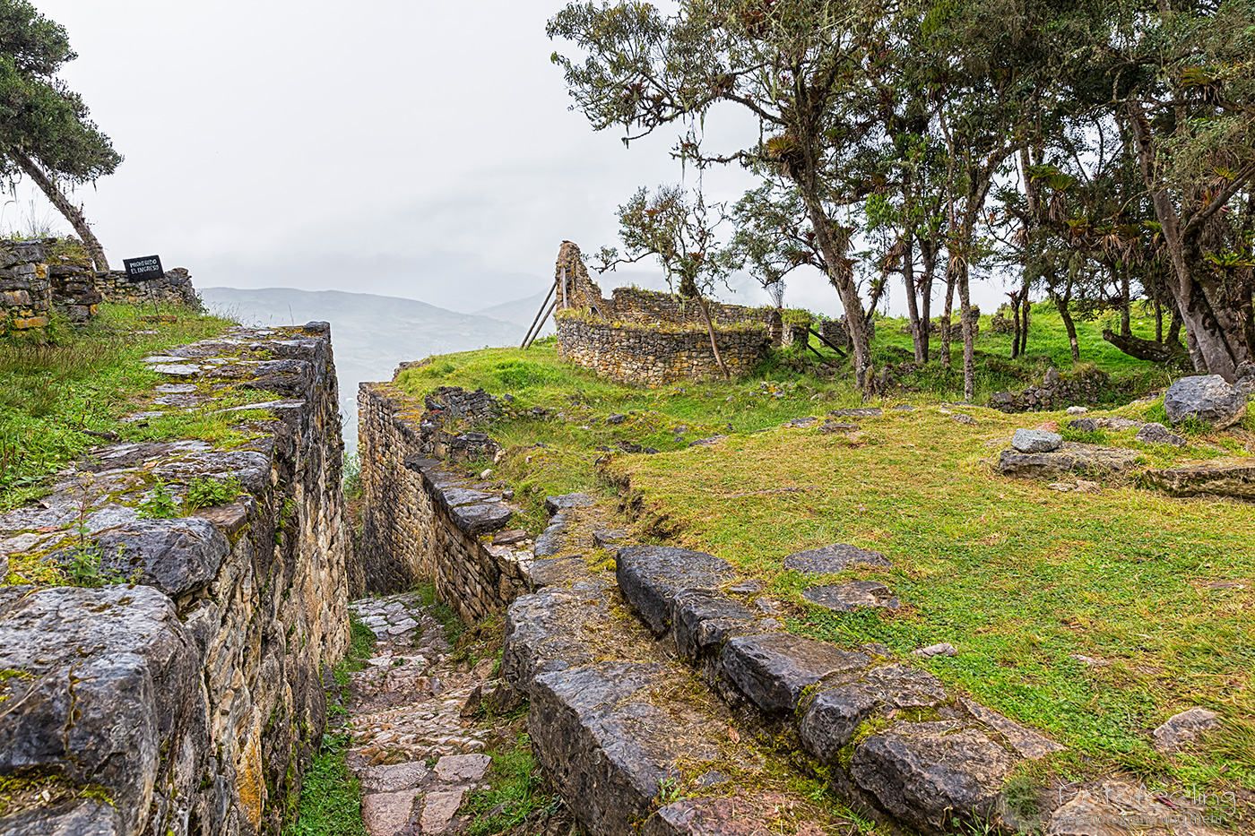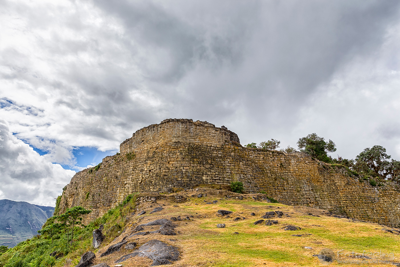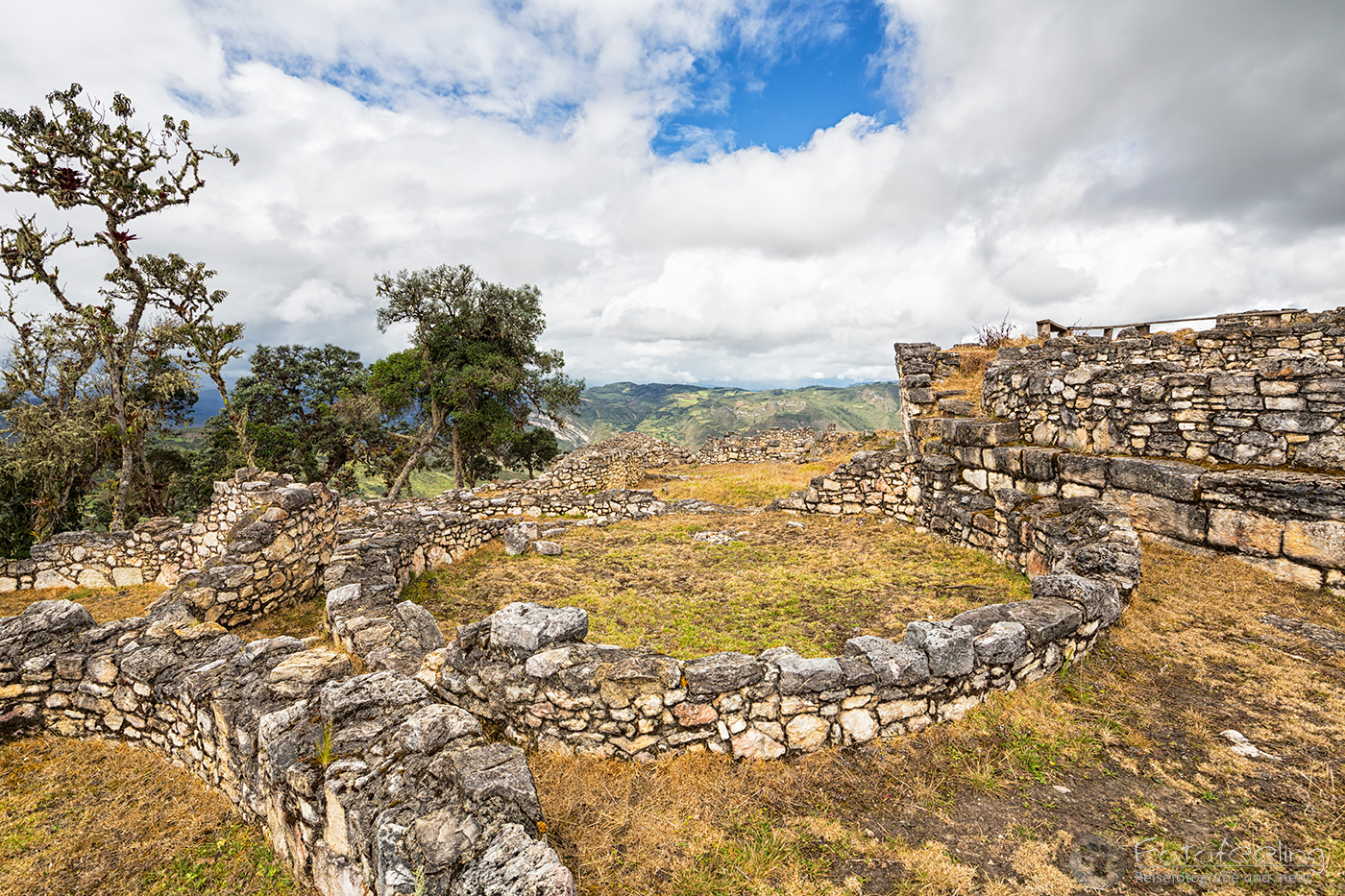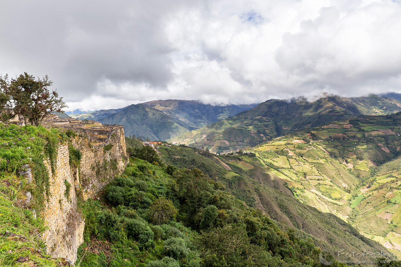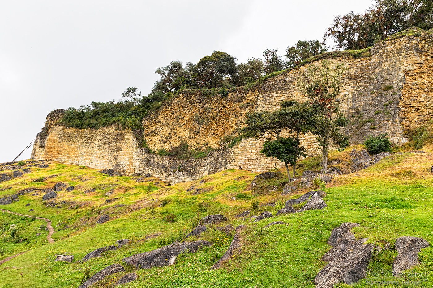 Der Weg war schon atemberaubend. Es ging stetig leicht bergauf und das in einer Höhe von über 3000 m. Nach einer Weile konnten wir die Festungsmauern erblicken. Sie waren von tiefhängenden Wolkenfetzen eingerahmt und es nieselte leicht. Ab und zu kam ein „Wolkenloch“ und die Umrisse der Mauern wurden etwas klarer. Ehrfurchtsvoll blieben wir stehen und betrachteten diese riesige Festungsanlage. Während die Augen die Mauern erkundeten, erwartete man fast, die Umrisse eines Chachapoya Kriegers zu erblicken, der nach Feinden Ausschau hält.
