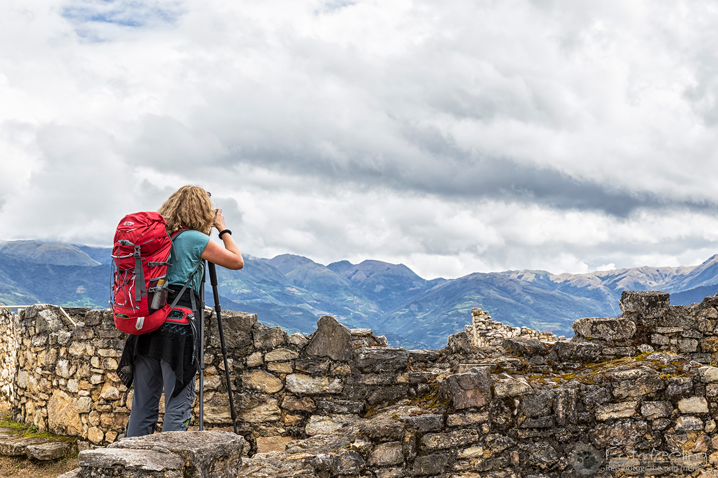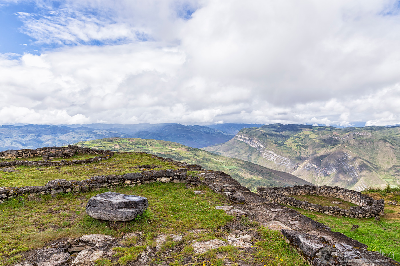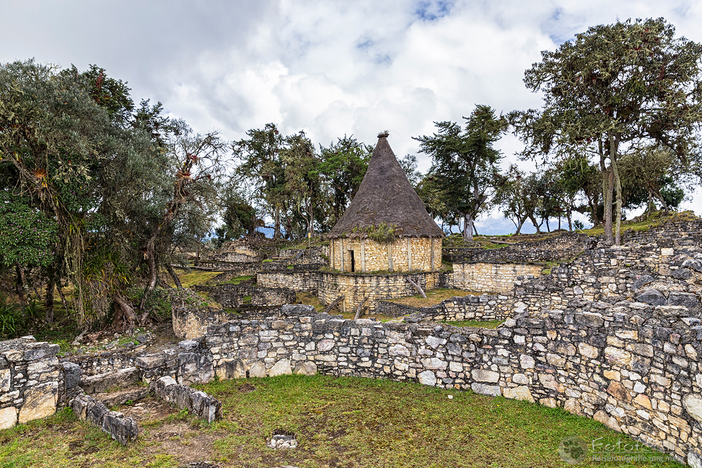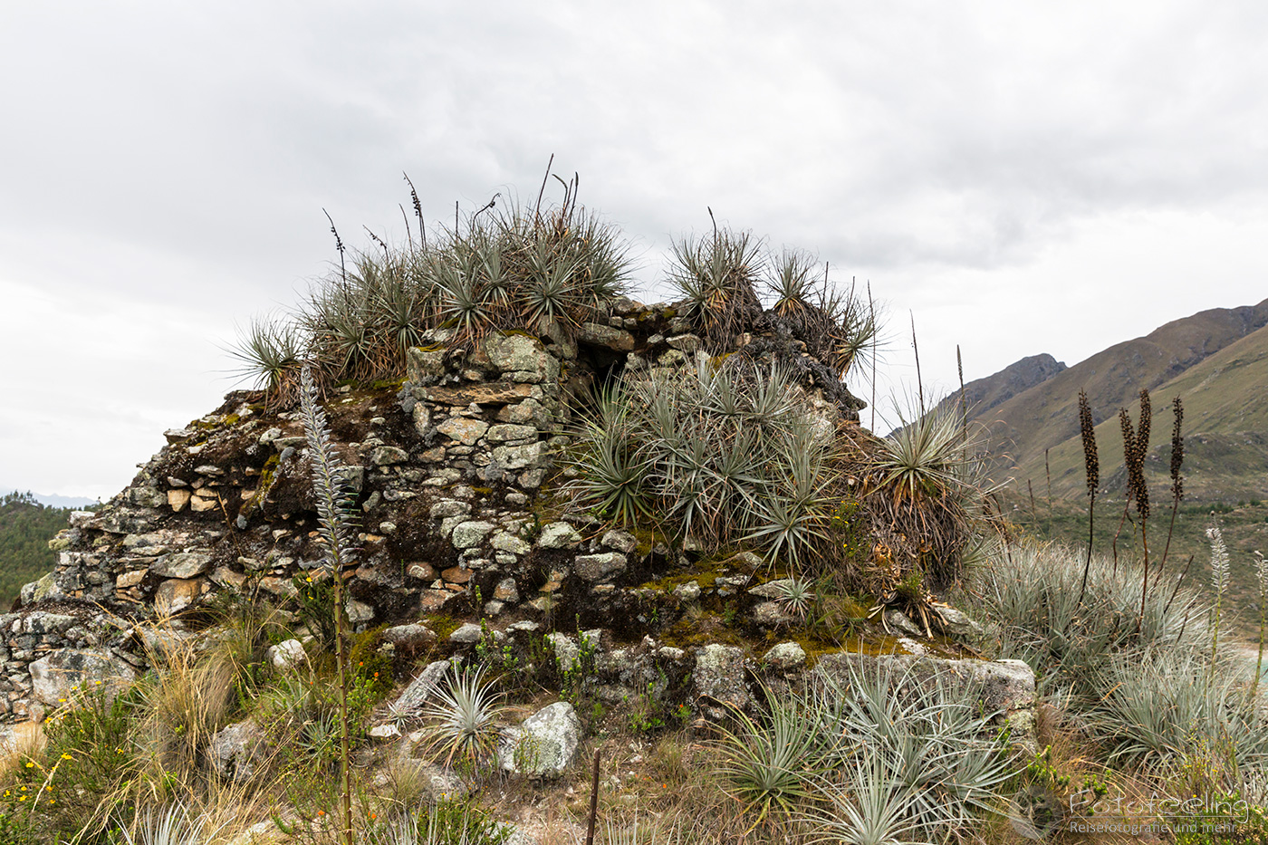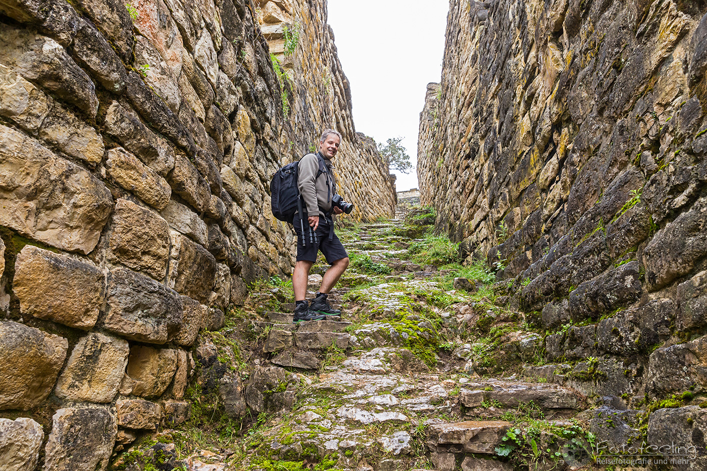 Der Weg war schon atemberaubend. Es ging stetig leicht bergauf und das in einer Höhe von über 3000 m. Nach einer Weile konnten wir die Festungsmauern erblicken. Sie waren von tiefhängenden Wolkenfetzen eingerahmt und es nieselte leicht. Ab und zu kam ein „Wolkenloch“ und die Umrisse der Mauern wurden etwas klarer. Ehrfurchtsvoll blieben wir stehen und betrachteten diese riesige Festungsanlage. Während die Augen die Mauern erkundeten, erwartete man fast, die Umrisse eines Chachapoya Kriegers zu erblicken, der nach Feinden Ausschau hält.