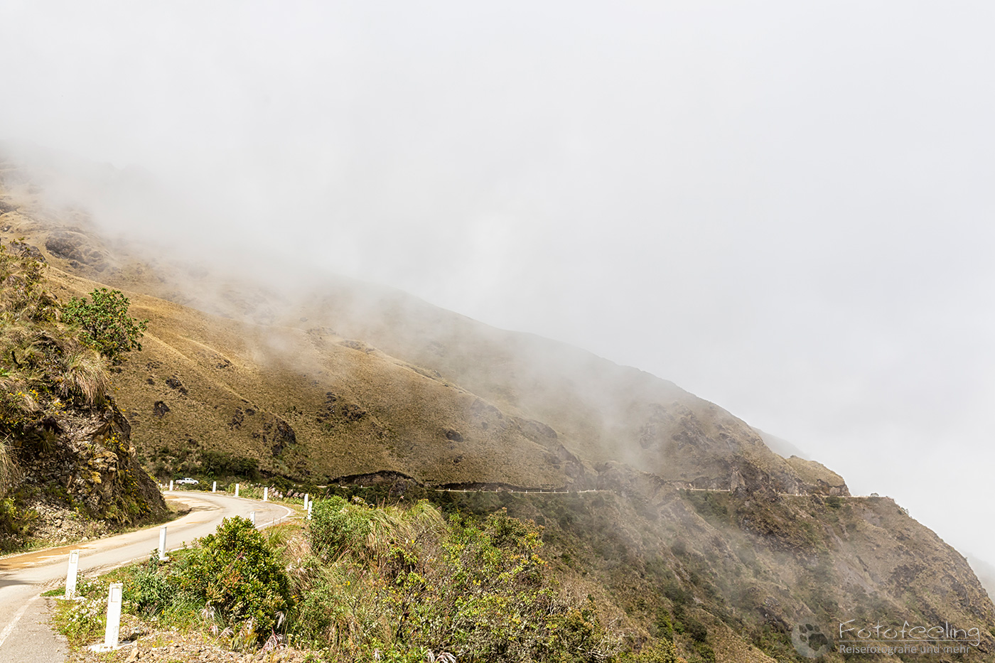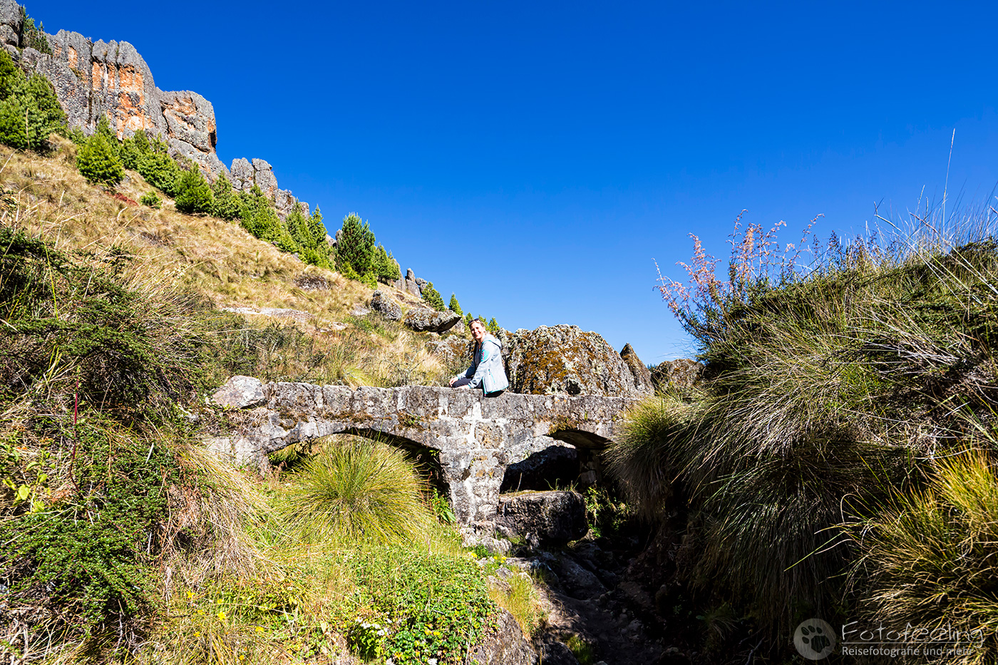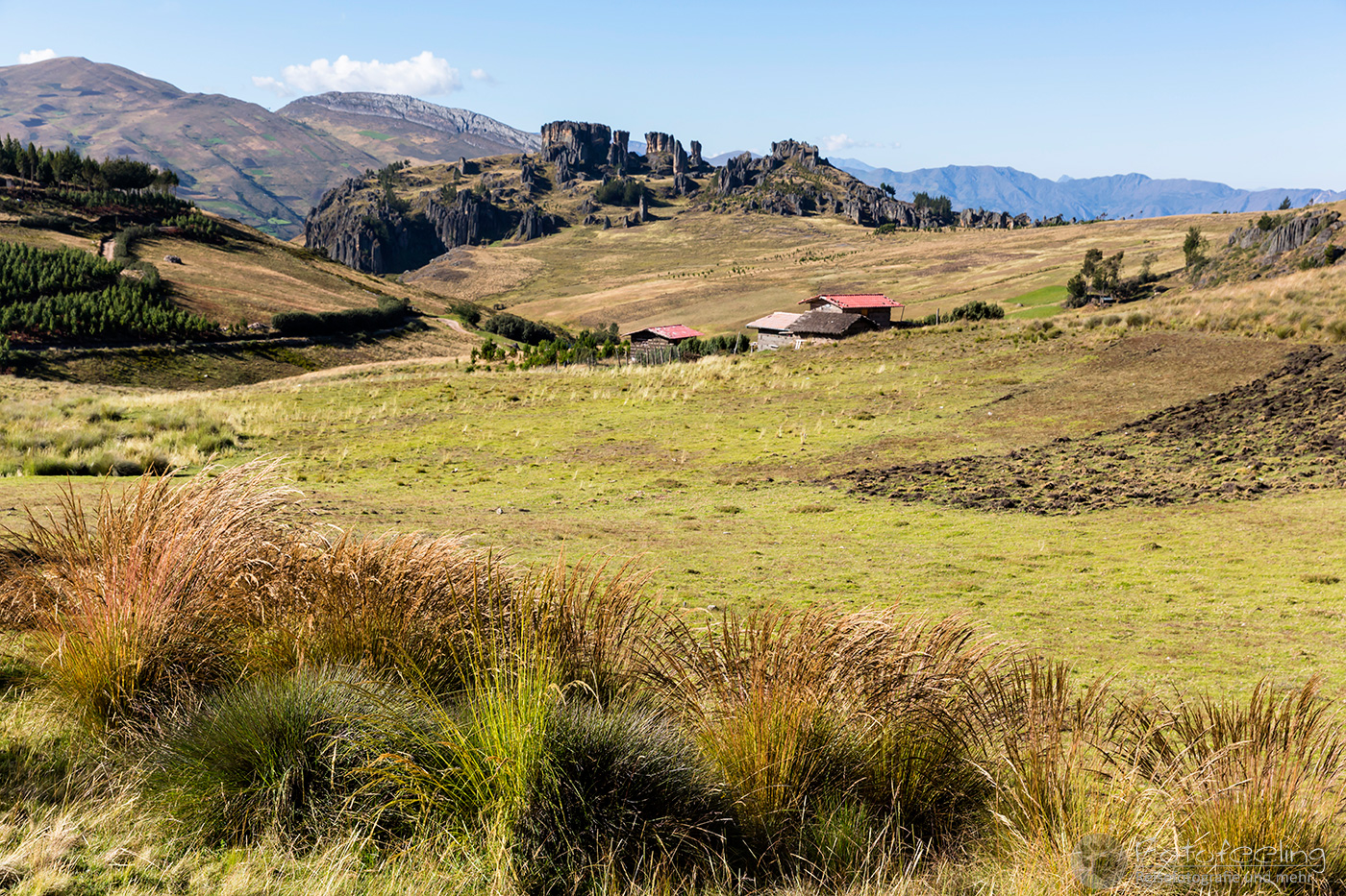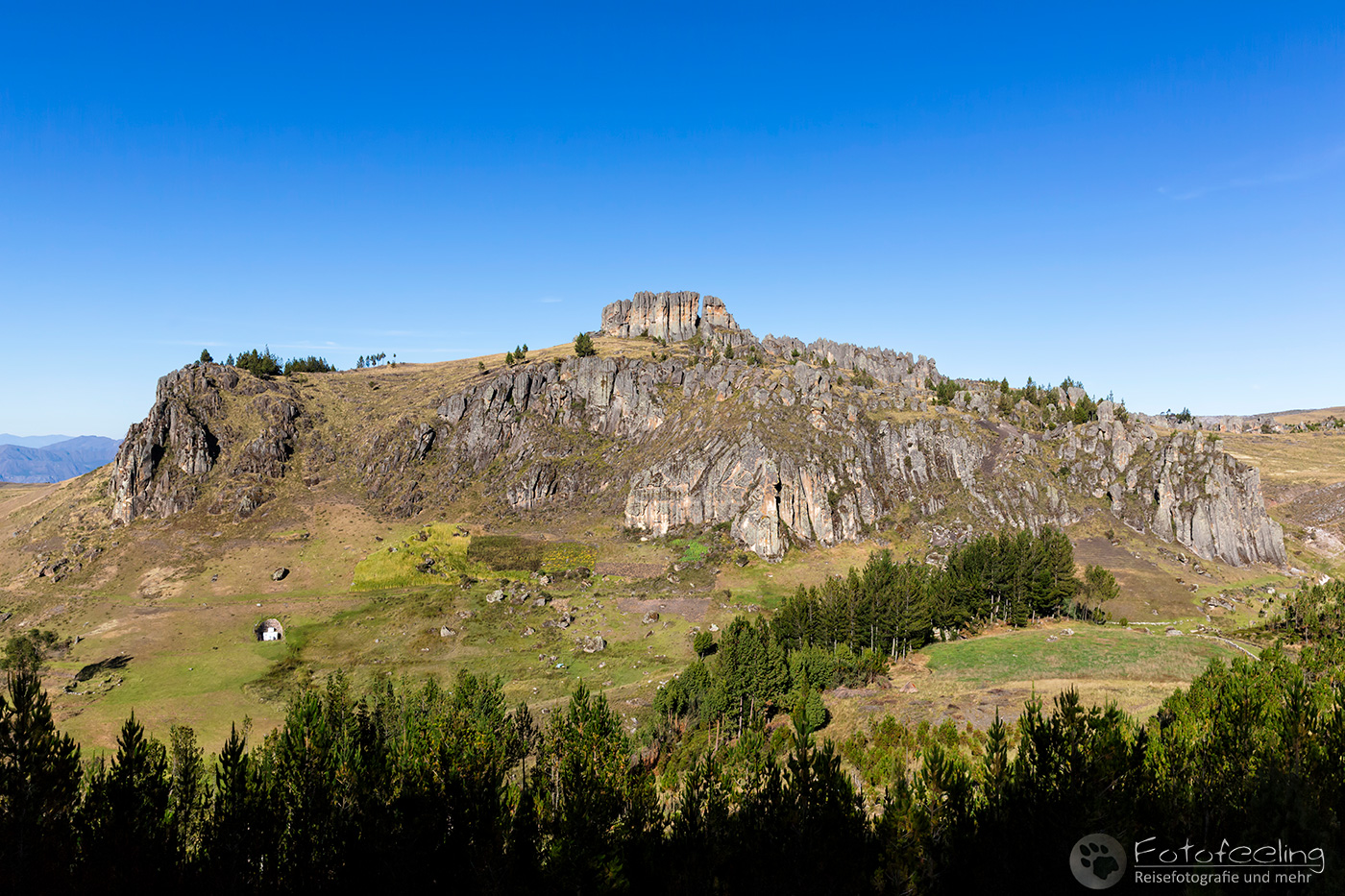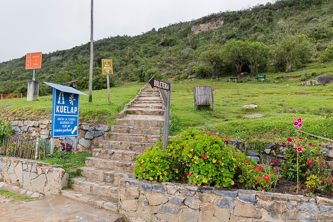 Der Weg war schon atemberaubend. Es ging stetig leicht bergauf und das in einer Höhe von über 3000 m. Nach einer Weile konnten wir die Festungsmauern erblicken. Sie waren von tiefhängenden Wolkenfetzen eingerahmt und es nieselte leicht. Ab und zu kam ein „Wolkenloch“ und die Umrisse der Mauern wurden etwas klarer. Ehrfurchtsvoll blieben wir stehen und betrachteten diese riesige Festungsanlage. Während die Augen die Mauern erkundeten, erwartete man fast, die Umrisse eines Chachapoya Kriegers zu erblicken, der nach Feinden Ausschau hält.
