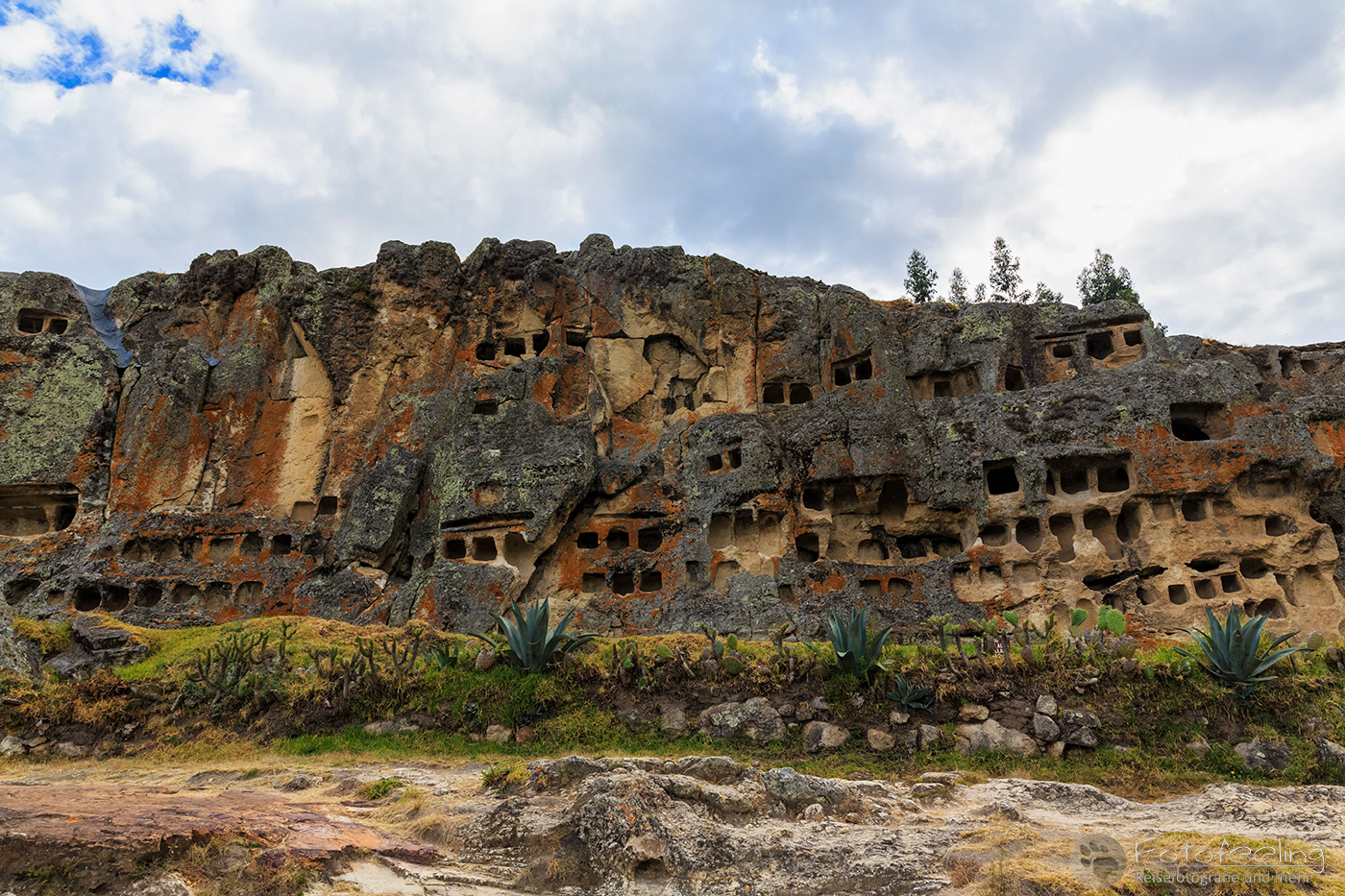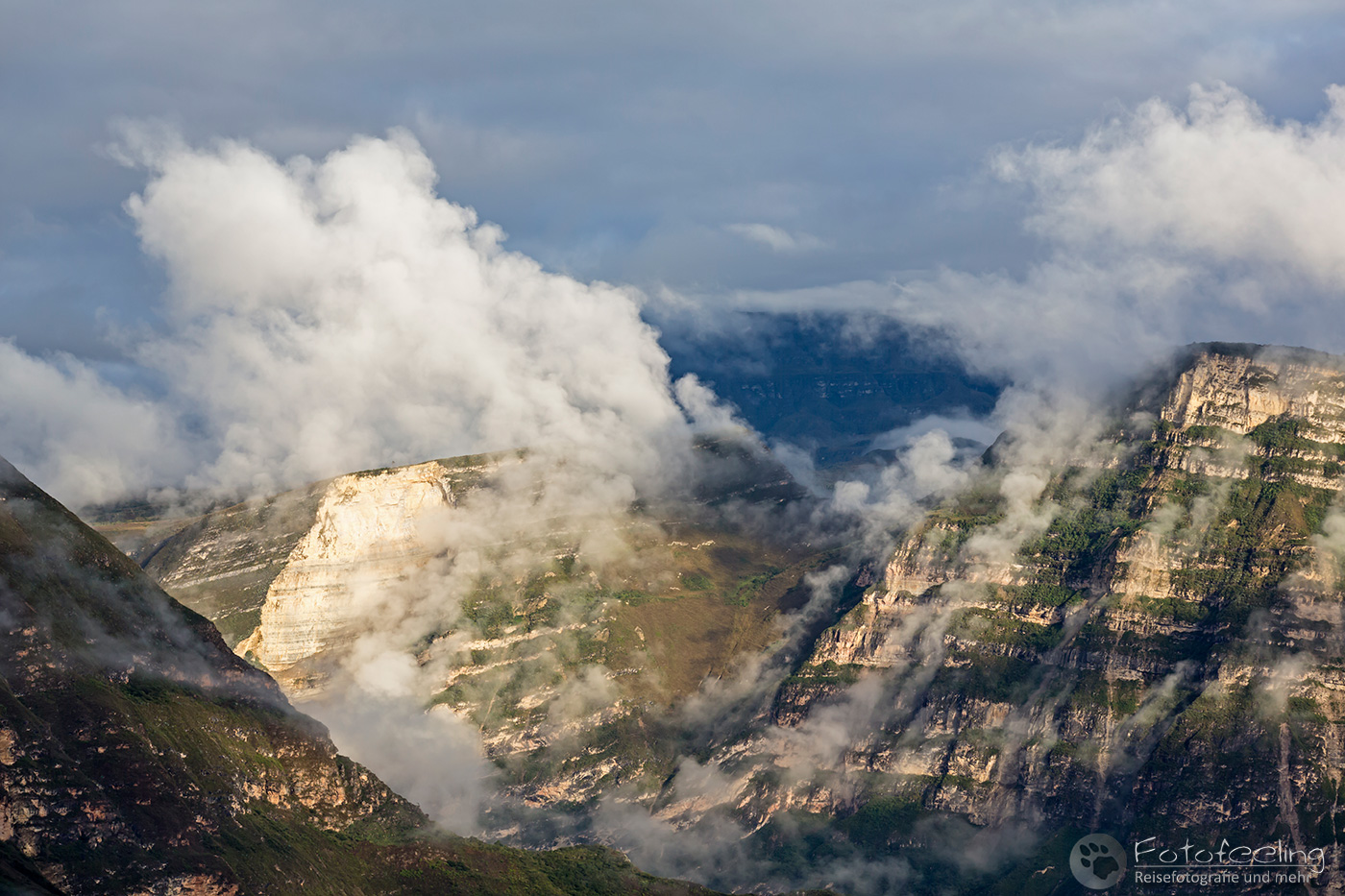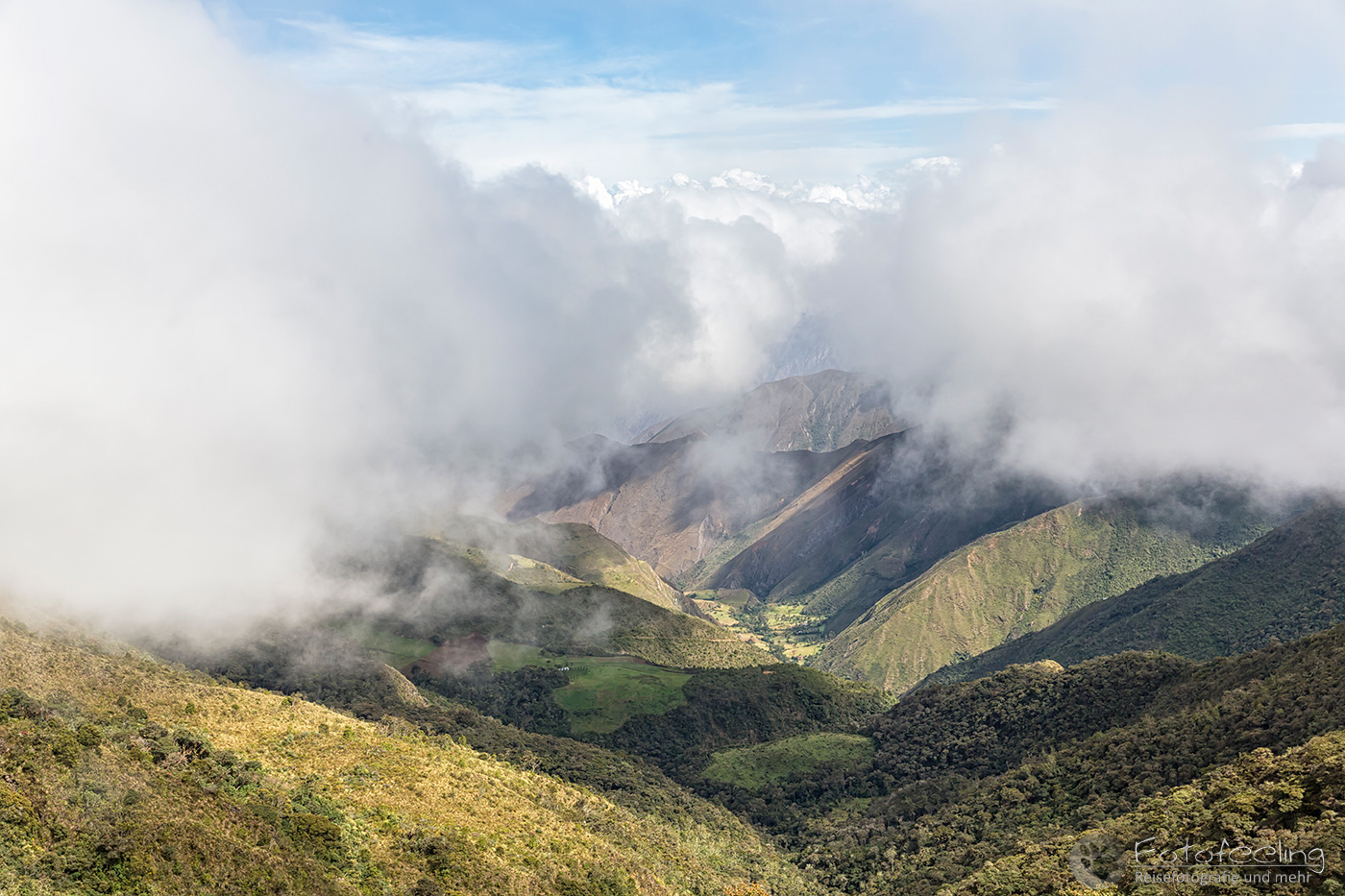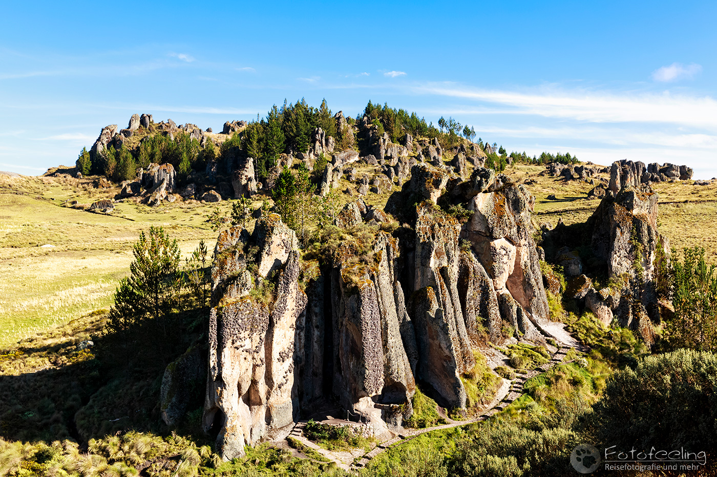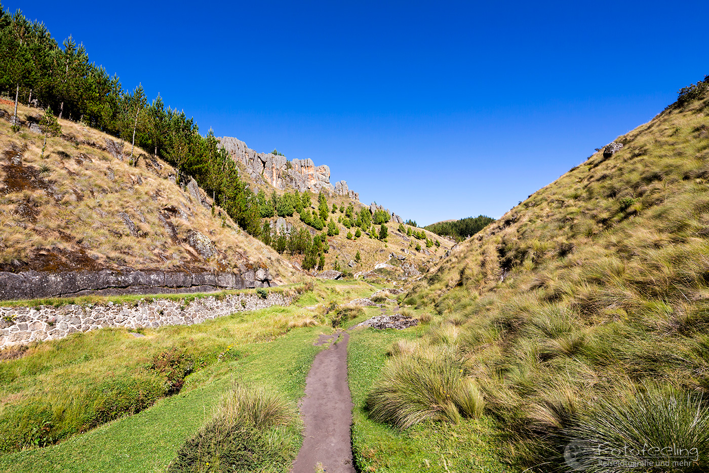 Der Weg war schon atemberaubend. Es ging stetig leicht bergauf und das in einer Höhe von über 3000 m. Nach einer Weile konnten wir die Festungsmauern erblicken. Sie waren von tiefhängenden Wolkenfetzen eingerahmt und es nieselte leicht. Ab und zu kam ein „Wolkenloch“ und die Umrisse der Mauern wurden etwas klarer. Ehrfurchtsvoll blieben wir stehen und betrachteten diese riesige Festungsanlage. Während die Augen die Mauern erkundeten, erwartete man fast, die Umrisse eines Chachapoya Kriegers zu erblicken, der nach Feinden Ausschau hält.