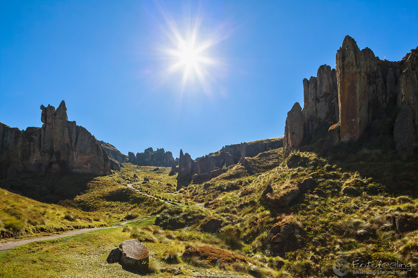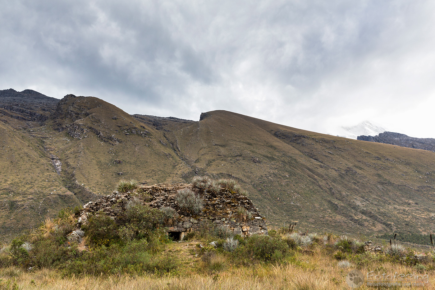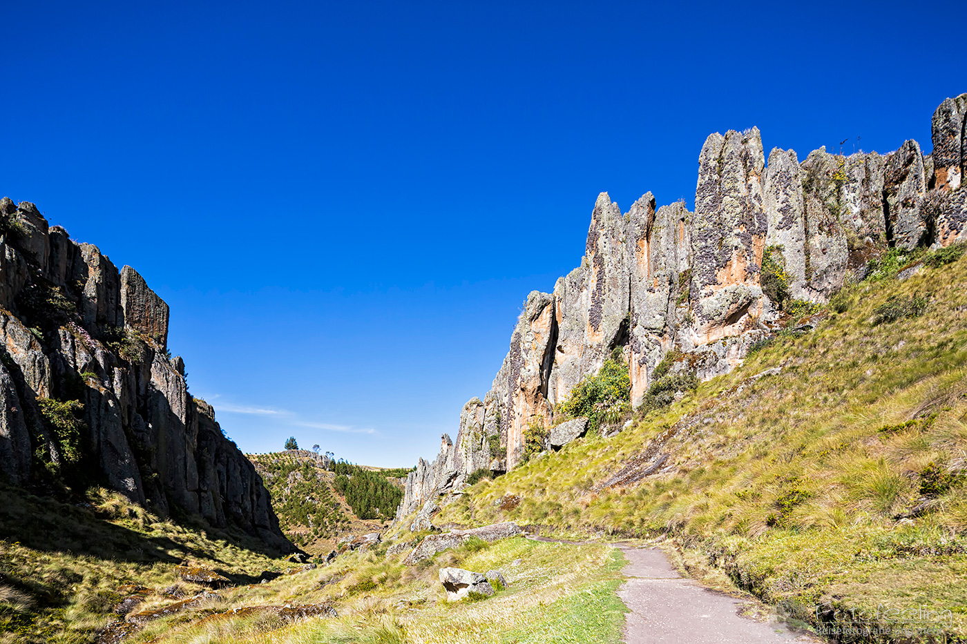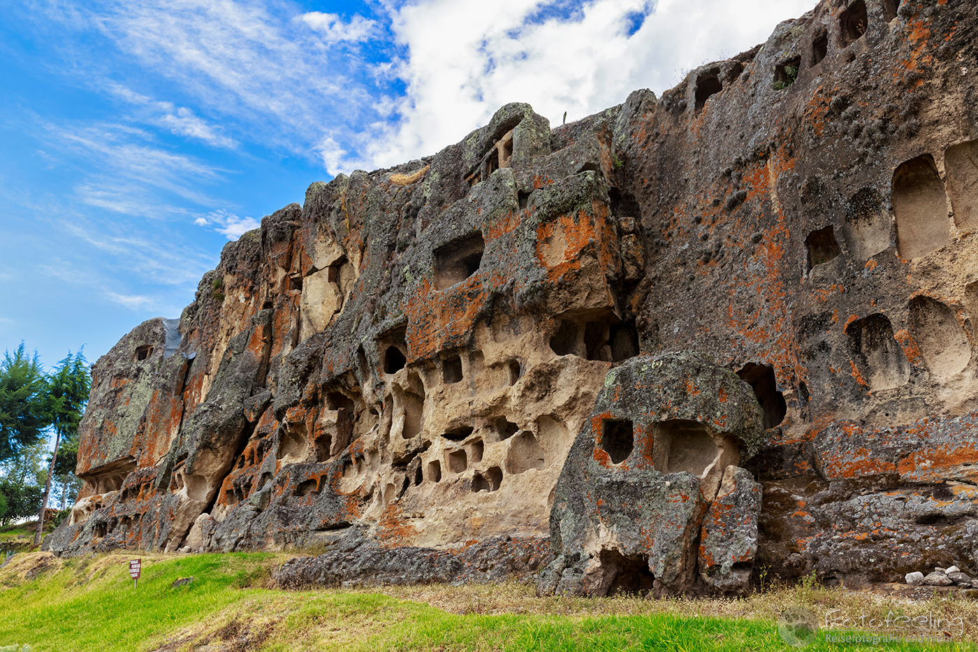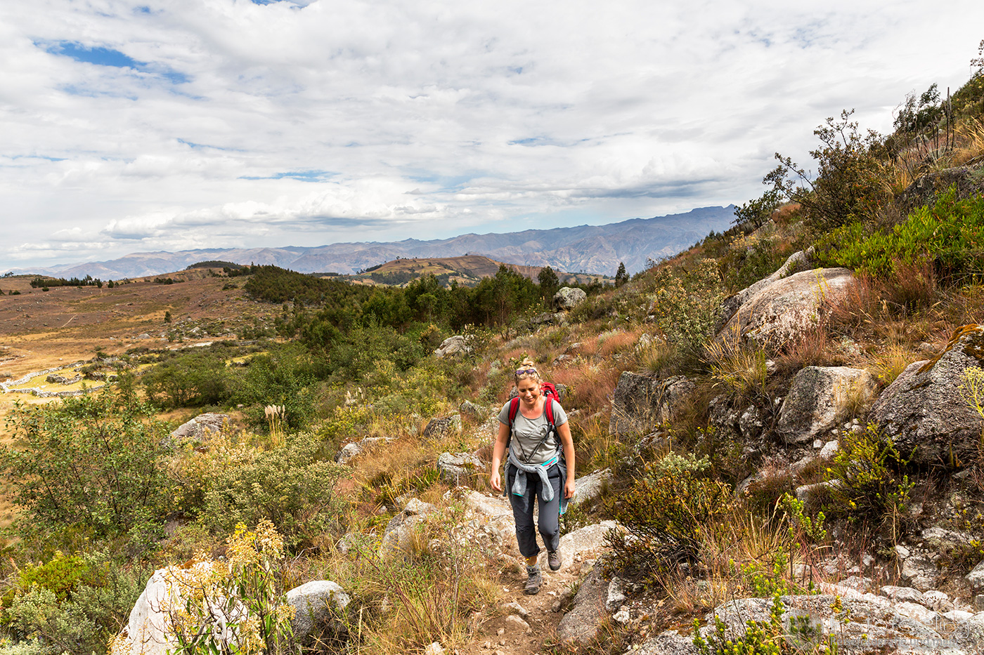 Der Weg war schon atemberaubend. Es ging stetig leicht bergauf und das in einer Höhe von über 3000 m. Nach einer Weile konnten wir die Festungsmauern erblicken. Sie waren von tiefhängenden Wolkenfetzen eingerahmt und es nieselte leicht. Ab und zu kam ein „Wolkenloch“ und die Umrisse der Mauern wurden etwas klarer. Ehrfurchtsvoll blieben wir stehen und betrachteten diese riesige Festungsanlage. Während die Augen die Mauern erkundeten, erwartete man fast, die Umrisse eines Chachapoya Kriegers zu erblicken, der nach Feinden Ausschau hält.