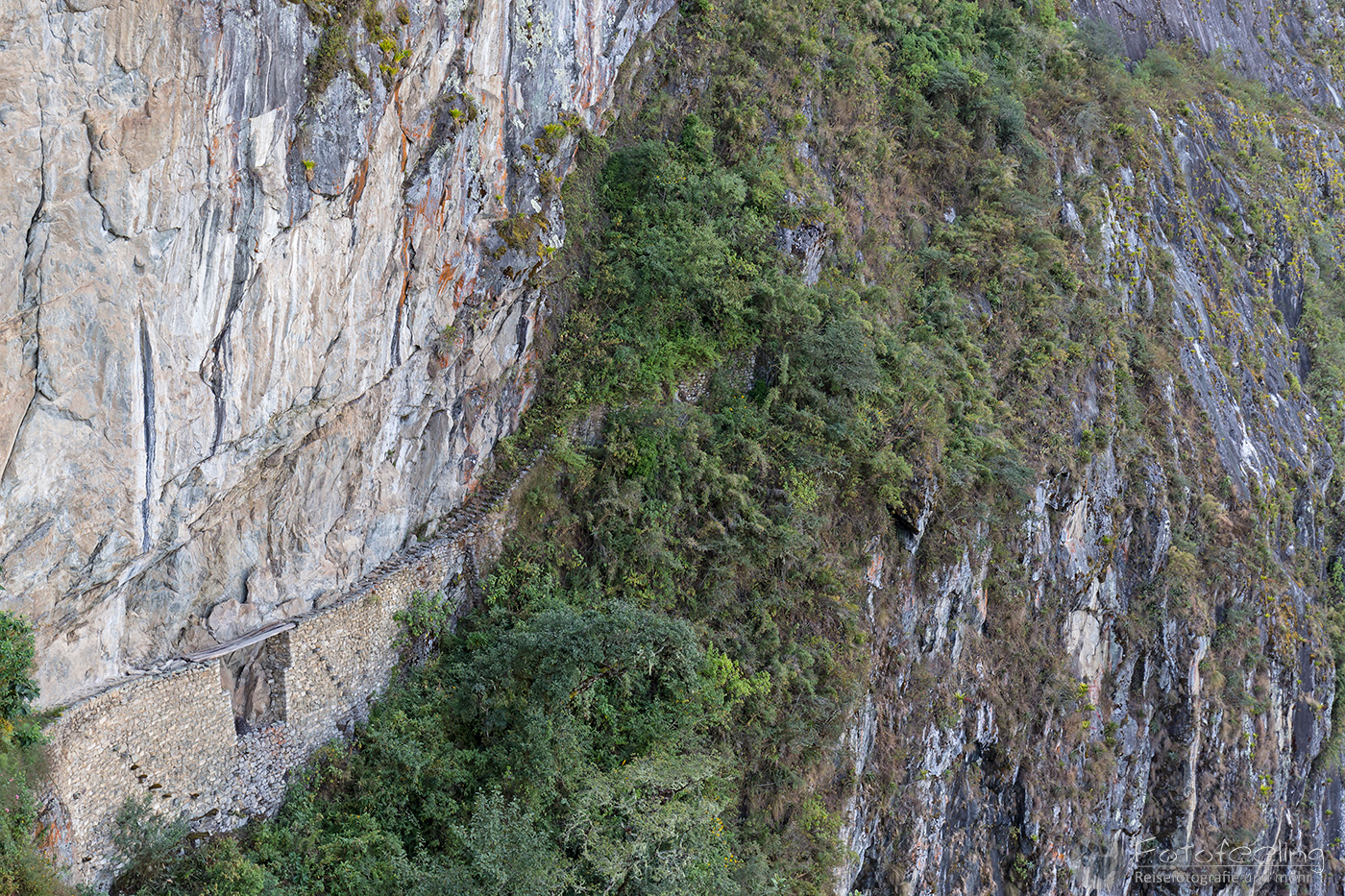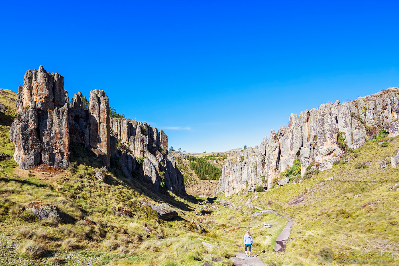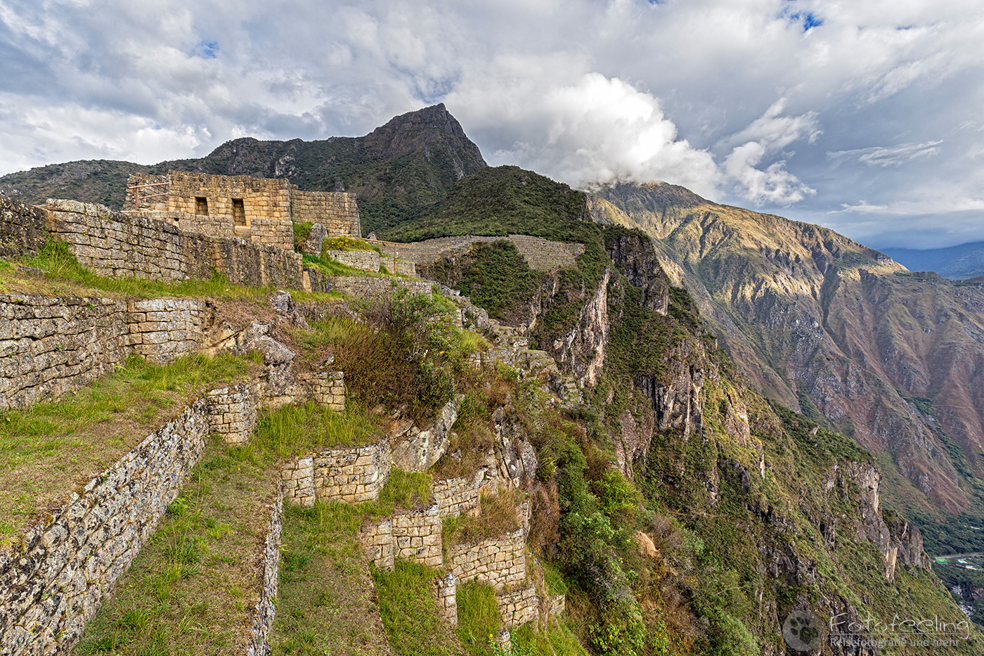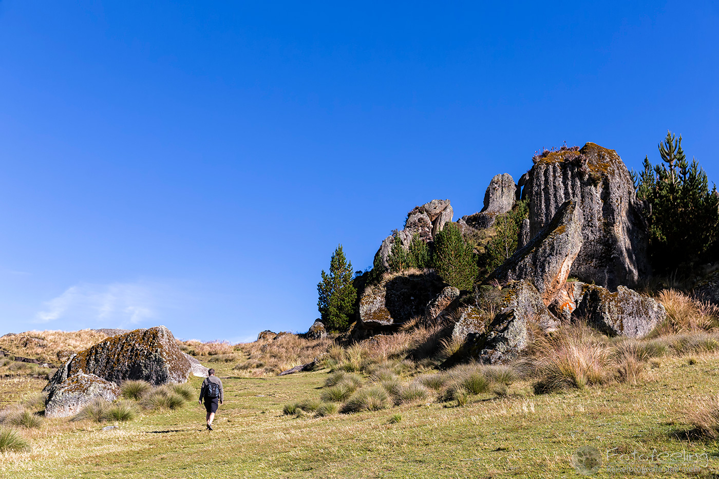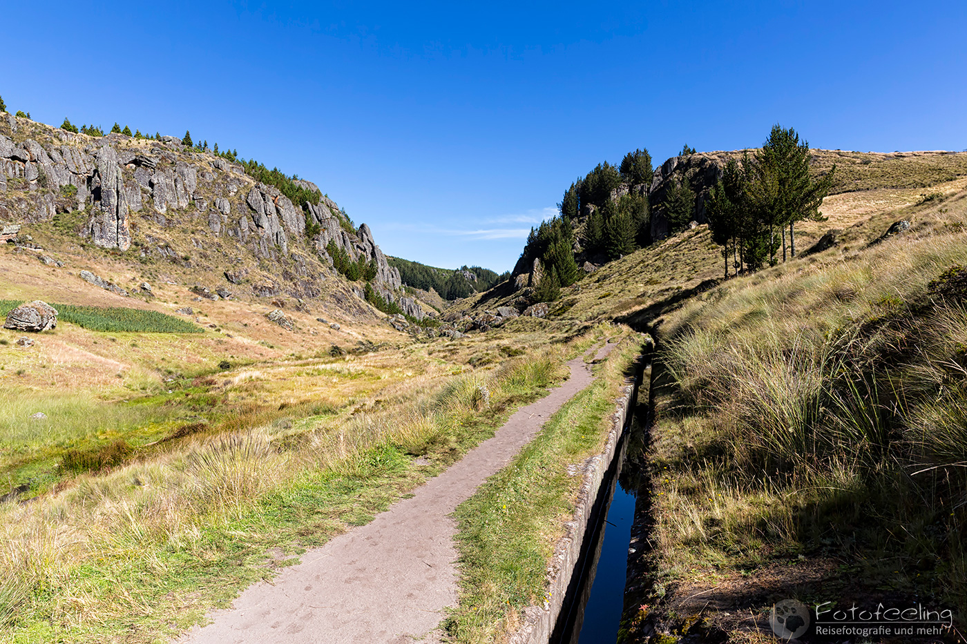 Der Weg war schon atemberaubend. Es ging stetig leicht bergauf und das in einer Höhe von über 3000 m. Nach einer Weile konnten wir die Festungsmauern erblicken. Sie waren von tiefhängenden Wolkenfetzen eingerahmt und es nieselte leicht. Ab und zu kam ein „Wolkenloch“ und die Umrisse der Mauern wurden etwas klarer. Ehrfurchtsvoll blieben wir stehen und betrachteten diese riesige Festungsanlage. Während die Augen die Mauern erkundeten, erwartete man fast, die Umrisse eines Chachapoya Kriegers zu erblicken, der nach Feinden Ausschau hält.