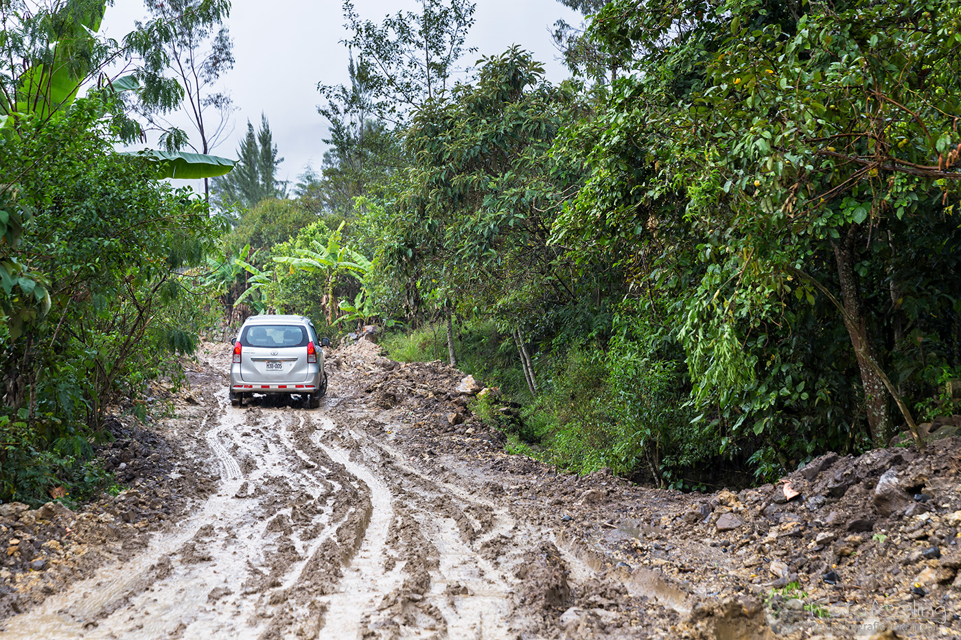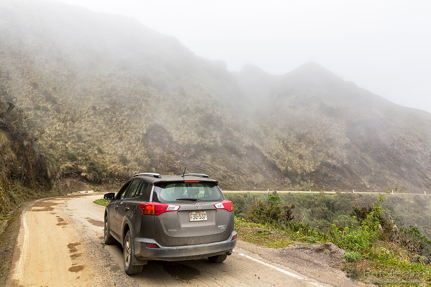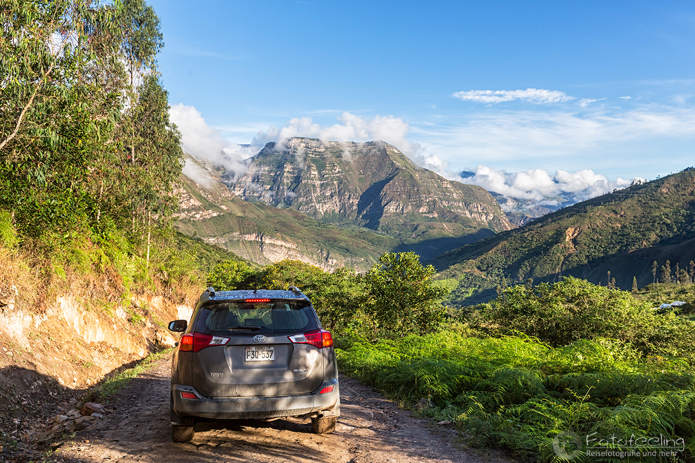 Die Rückfahrt wurde heftig und wir brauchten für die 37 km gut eine Stunde. Es regnete immer wieder und das zum Teil sehr stark. Zu einer Herausforderung wurde die Zufahrt zum Hotel, denn die lockere Erde der Baustelle hatte sich in eine Schlammsuhle verwandelt. Natürlich ging es auch noch bergauf. Vor uns hing ein Wagen im Schlamm fest und wir mussten warten. Der Wagen hatte kein Allrad und schlingerte den verschlammten Weg hinauf um kurz darauf steckenzubleiben. Der Fahrer kletterte aus dem Wagen und stand bis zu den Knöcheln im Schlamm. Hinter uns hatte sich ein weiteres Fahrzeug eingefunden, ein Kleinbus aus dem unsere vier Engländer kletterten, die wir auch schon kurz in Kuélap gesehen hatten. Sie sahen sehr lustig aus, denn die Frauen hatten sich bunte Plastiktüten um die Schuhe gewickelt und gingen damit durch dem Schlamm. Sie wollten zu Fuß die knapp 2 Kilometer zum Hotel zurücklegen, da der Kleinbus keine Chance hatte, durch den Schlamm zu kommen. Zum Glück konnte der Wagen, der vor uns den Weg versperrte, zurücksetzten und machte uns den Weg frei. Dann versuchte Chris sein Glück. Er fuhr an und unser Auto kämpfte sich ohne Mühe durch den Schlamm. Nach der ersten Steigung kamen wir um die Kurve und gleich zur nächsten Herausforderung, denn mitten auf dem Weg stand ein Laster quer. Chris scherte geschickt aus und wir schlingerten gekonnt um den Laster herum durch den Schlamm. Etwas weiter den Berg hinauf sammelten wir die zwei „Mercedes SL Fahrer“ auf, die dankbar einstiegen. Die anderen Zwei passierten wir kurz darauf, aber für sie hatten wir leider keinen Platz mehr im Auto. Chris holte sie später schnell noch ab, denn bis zum Hotel bei aufgeweichter schlammiger Straße und Nieselregen war die Wanderung kein Vergnügen.