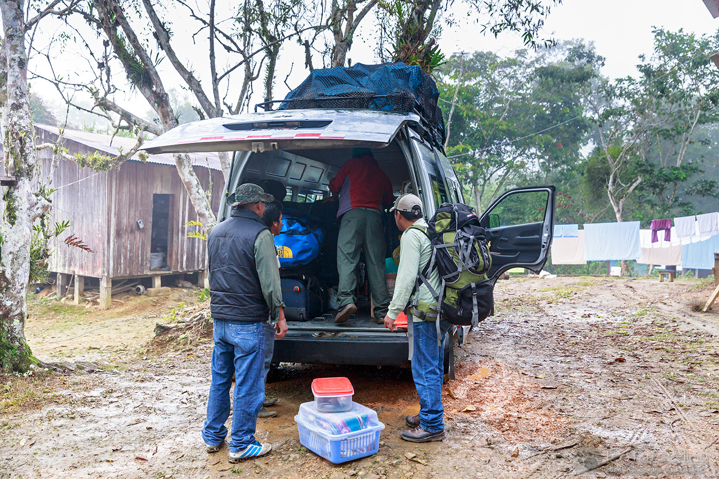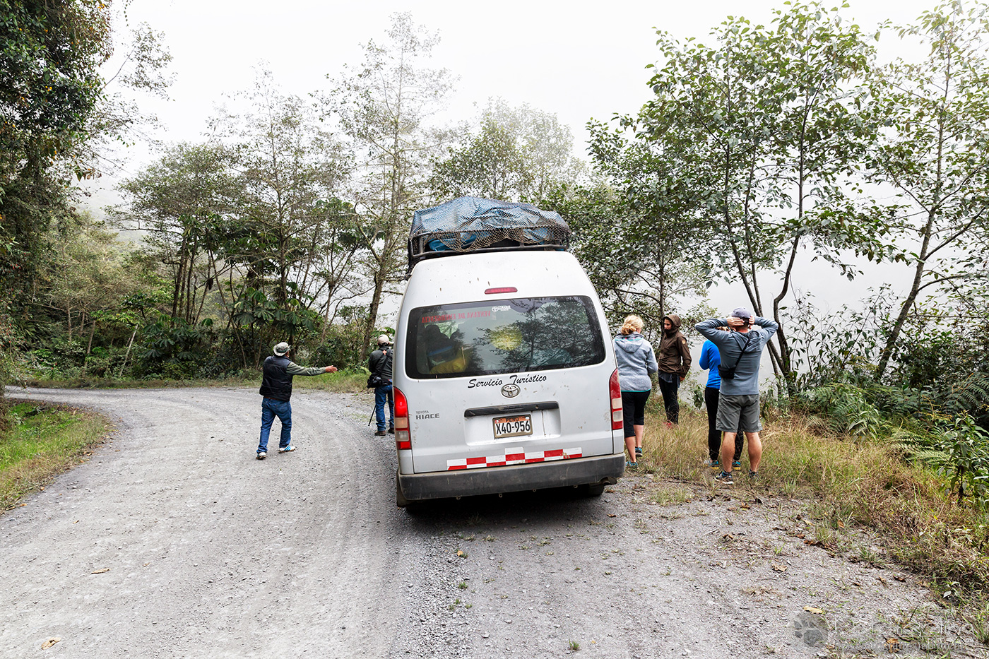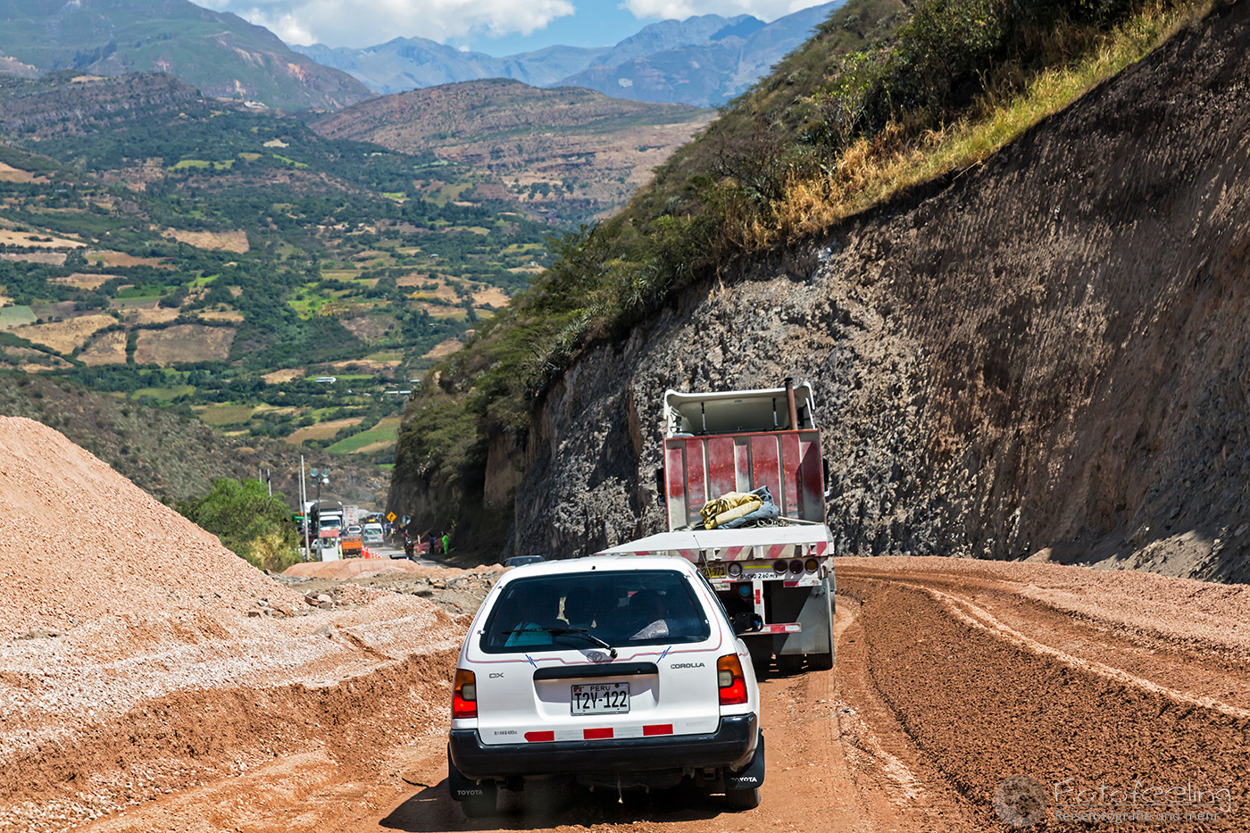 Die Rückfahrt wurde heftig und wir brauchten für die 37 km gut eine Stunde. Es regnete immer wieder und das zum Teil sehr stark. Zu einer Herausforderung wurde die Zufahrt zum Hotel, denn die lockere Erde der Baustelle hatte sich in eine Schlammsuhle verwandelt. Natürlich ging es auch noch bergauf. Vor uns hing ein Wagen im Schlamm fest und wir mussten warten. Der Wagen hatte kein Allrad und schlingerte den verschlammten Weg hinauf um kurz darauf steckenzubleiben. Der Fahrer kletterte aus dem Wagen und stand bis zu den Knöcheln im Schlamm. Hinter uns hatte sich ein weiteres Fahrzeug eingefunden, ein Kleinbus aus dem unsere vier Engländer kletterten, die wir auch schon kurz in Kuélap gesehen hatten. Sie sahen sehr lustig aus, denn die Frauen hatten sich bunte Plastiktüten um die Schuhe gewickelt und gingen damit durch dem Schlamm. Sie wollten zu Fuß die knapp 2 Kilometer zum Hotel zurücklegen, da der Kleinbus keine Chance hatte, durch den Schlamm zu kommen. Zum Glück konnte der Wagen, der vor uns den Weg versperrte, zurücksetzten und machte uns den Weg frei. Dann versuchte Chris sein Glück. Er fuhr an und unser Auto kämpfte sich ohne Mühe durch den Schlamm. Nach der ersten Steigung kamen wir um die Kurve und gleich zur nächsten Herausforderung, denn mitten auf dem Weg stand ein Laster quer. Chris scherte geschickt aus und wir schlingerten gekonnt um den Laster herum durch den Schlamm. Etwas weiter den Berg hinauf sammelten wir die zwei „Mercedes SL Fahrer“ auf, die dankbar einstiegen. Die anderen Zwei passierten wir kurz darauf, aber für sie hatten wir leider keinen Platz mehr im Auto. Chris holte sie später schnell noch ab, denn bis zum Hotel bei aufgeweichter schlammiger Straße und Nieselregen war die Wanderung kein Vergnügen.