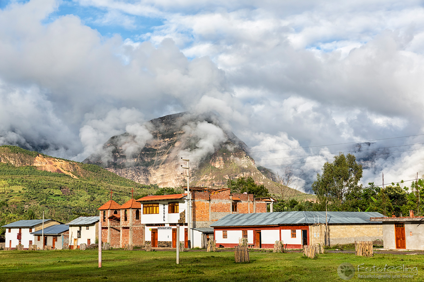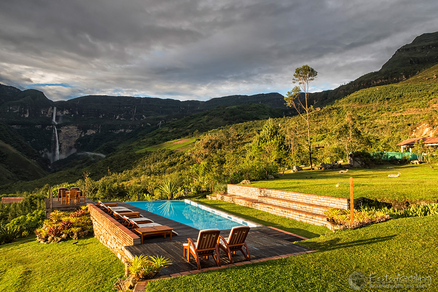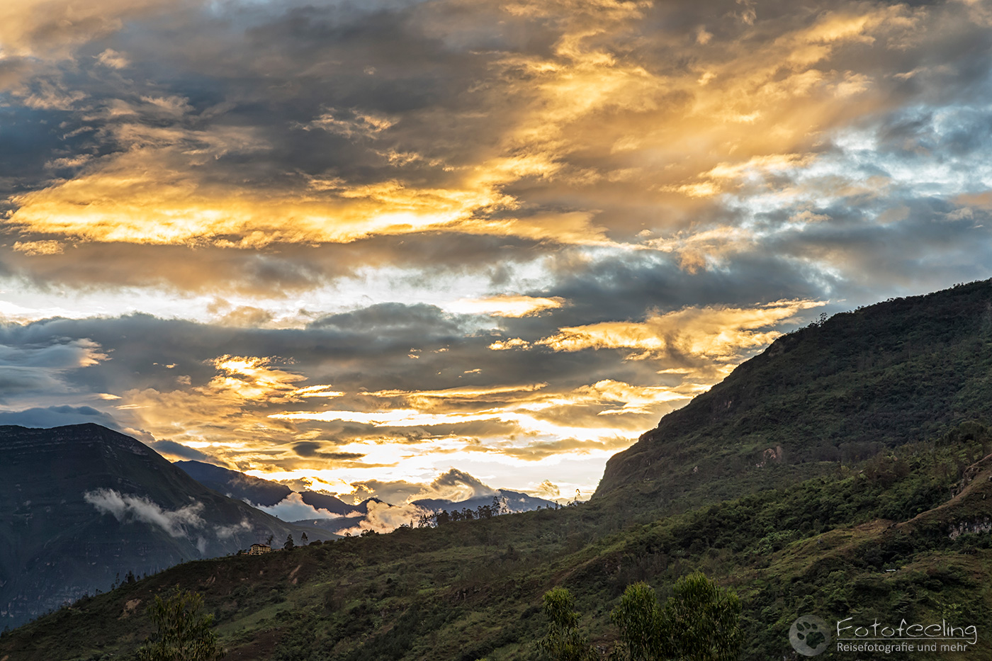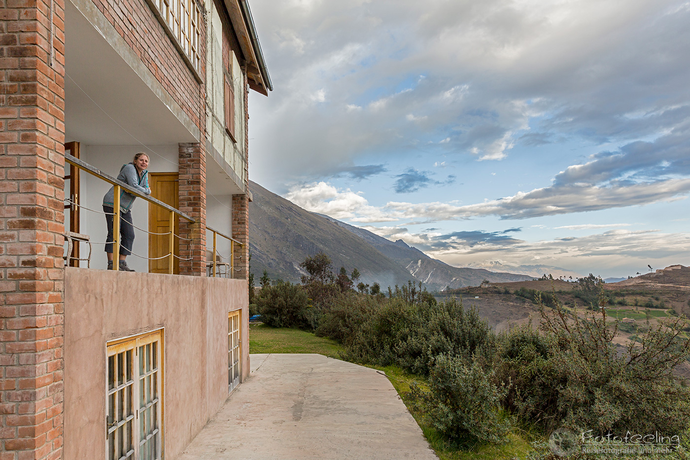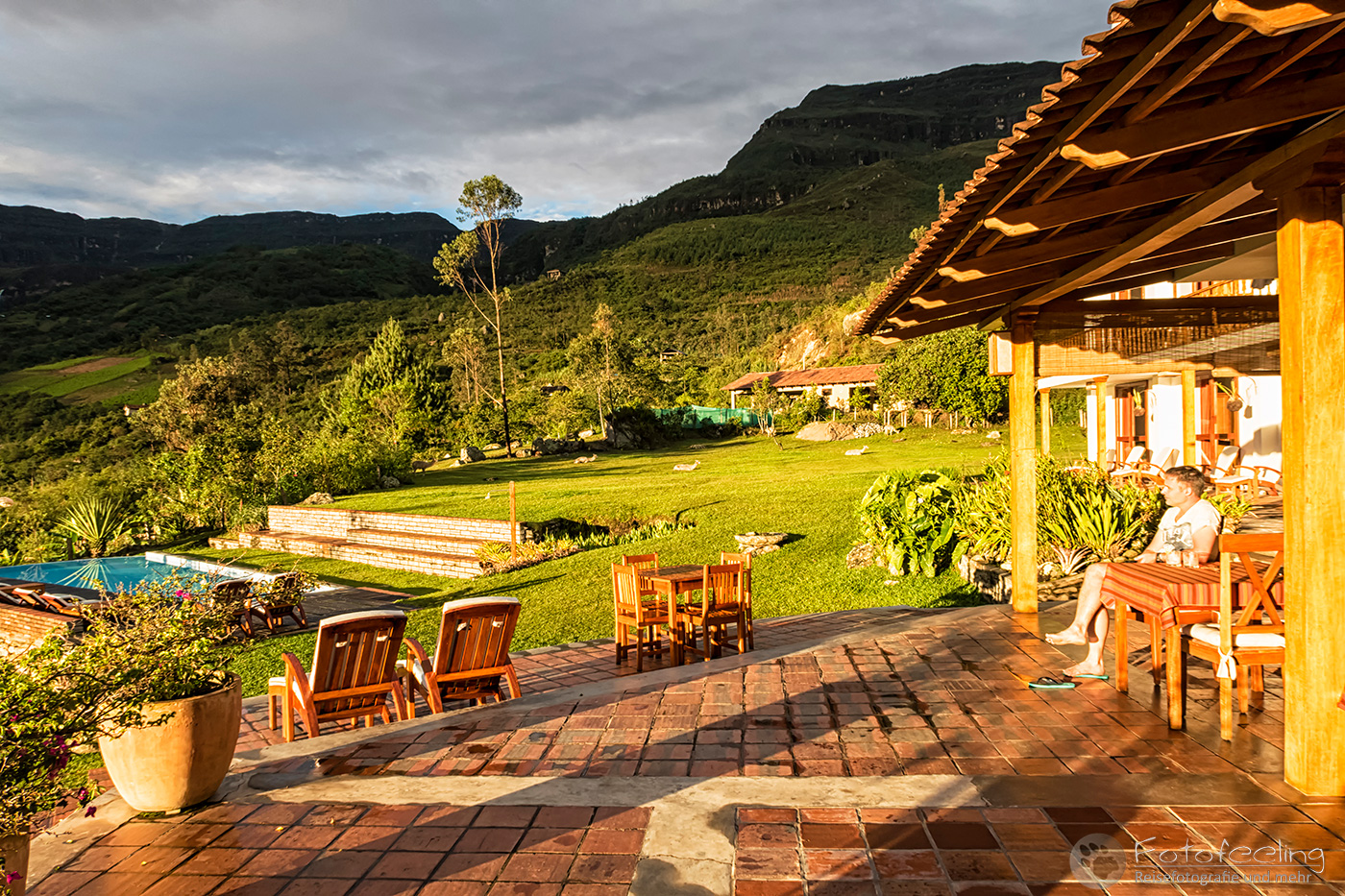 Es war so friedlich hier. Grillen zirpten, Vögel zwitscherten und ein paar Hähne krähten. Wir saßen frühmorgens auf unserem Balkon und genossen diese Idylle. Unter uns lagen die Lamas im Gras. Es schien, als ob sie die morgendliche Ruhe genauso genossen wie wir. In unserem Blick lag der Gocta Fall von dichten Wolken eingerahmt.