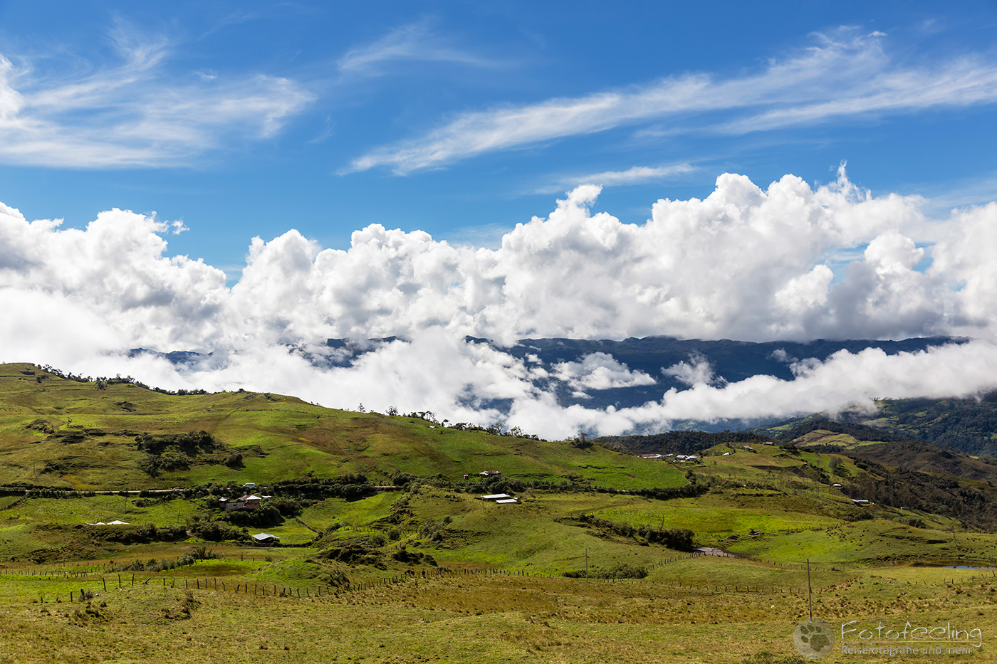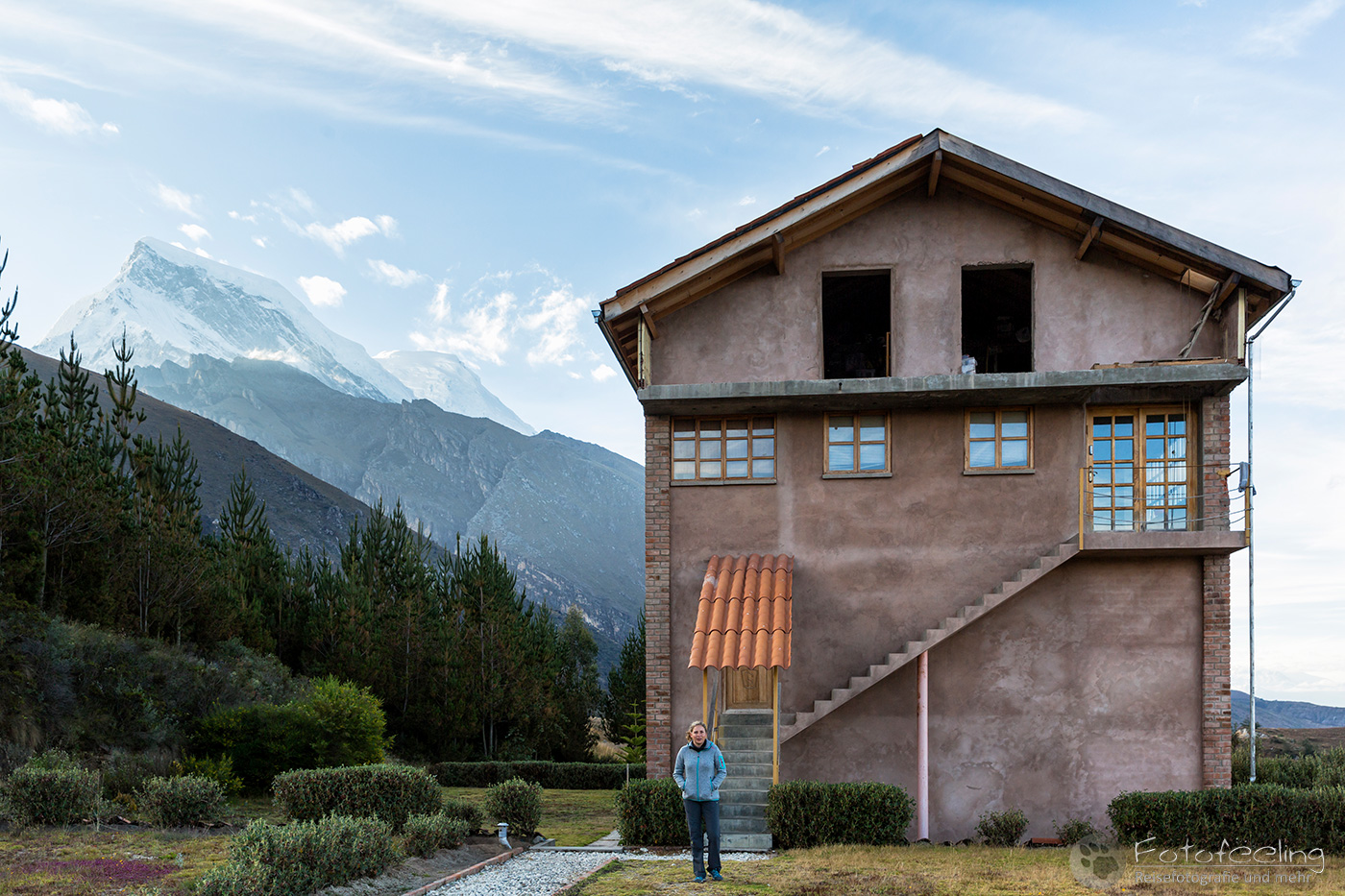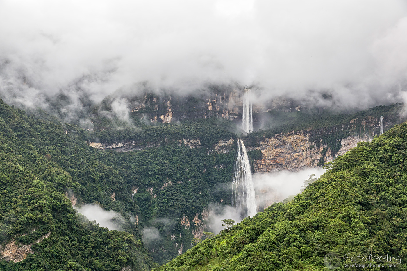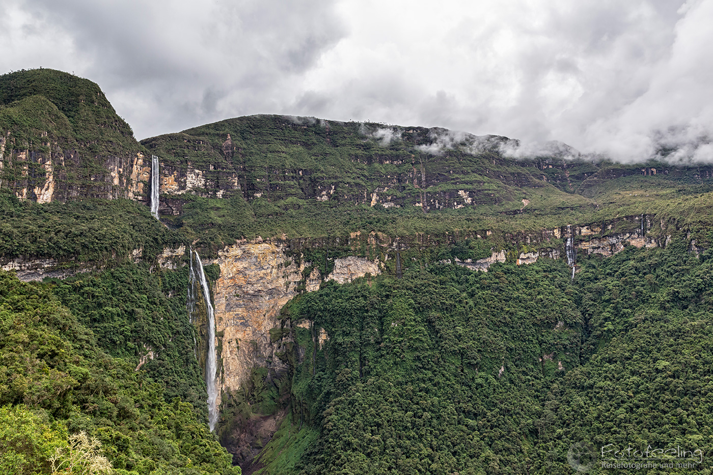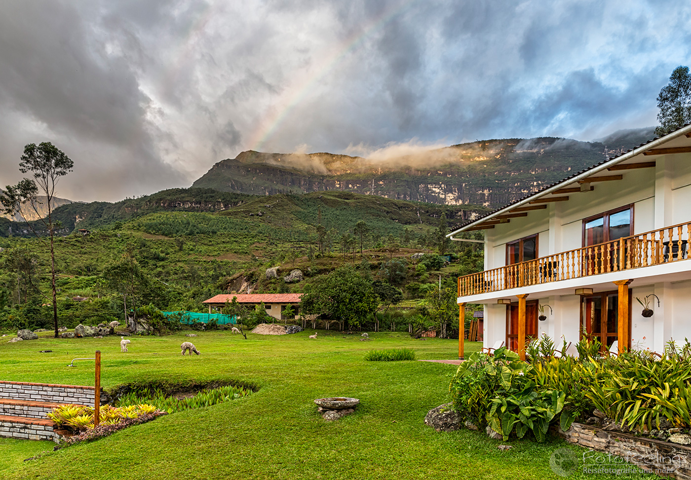 Es war so friedlich hier. Grillen zirpten, Vögel zwitscherten und ein paar Hähne krähten. Wir saßen frühmorgens auf unserem Balkon und genossen diese Idylle. Unter uns lagen die Lamas im Gras. Es schien, als ob sie die morgendliche Ruhe genauso genossen wie wir. In unserem Blick lag der Gocta Fall von dichten Wolken eingerahmt.