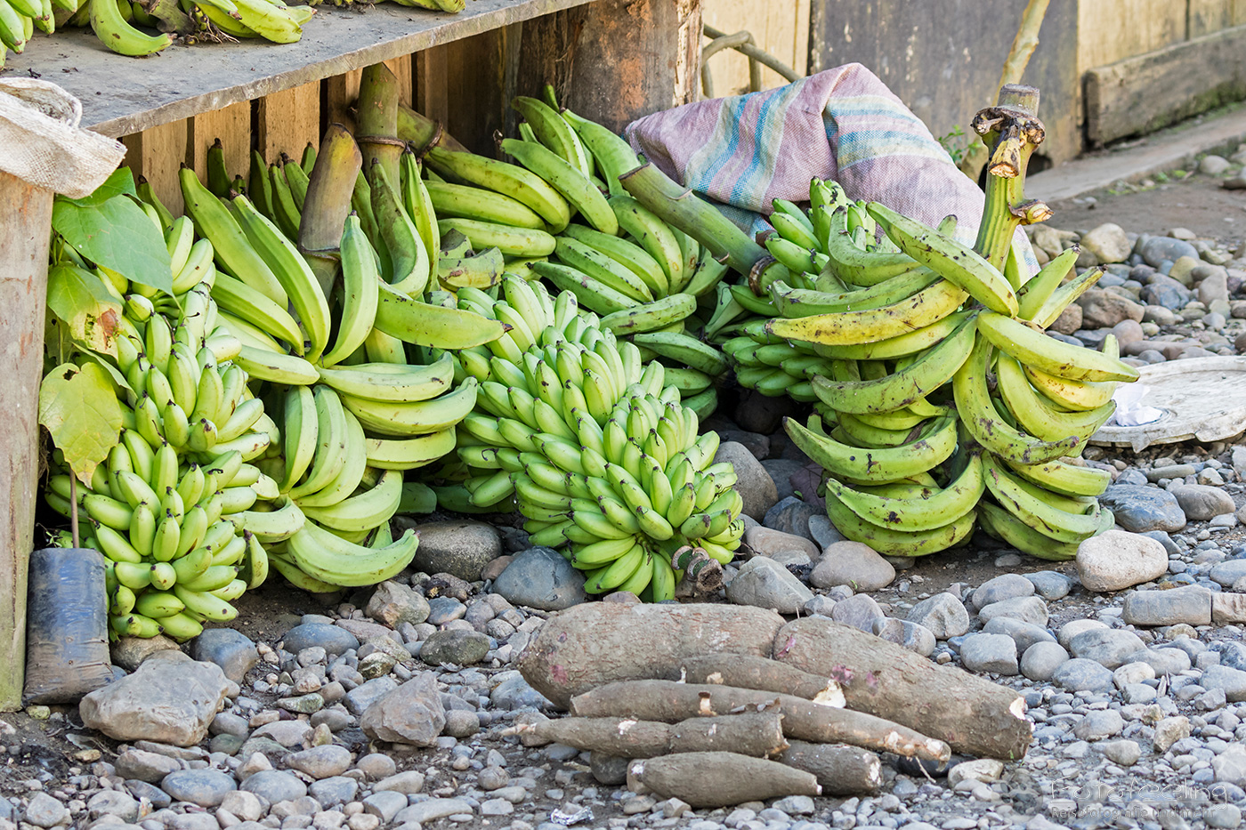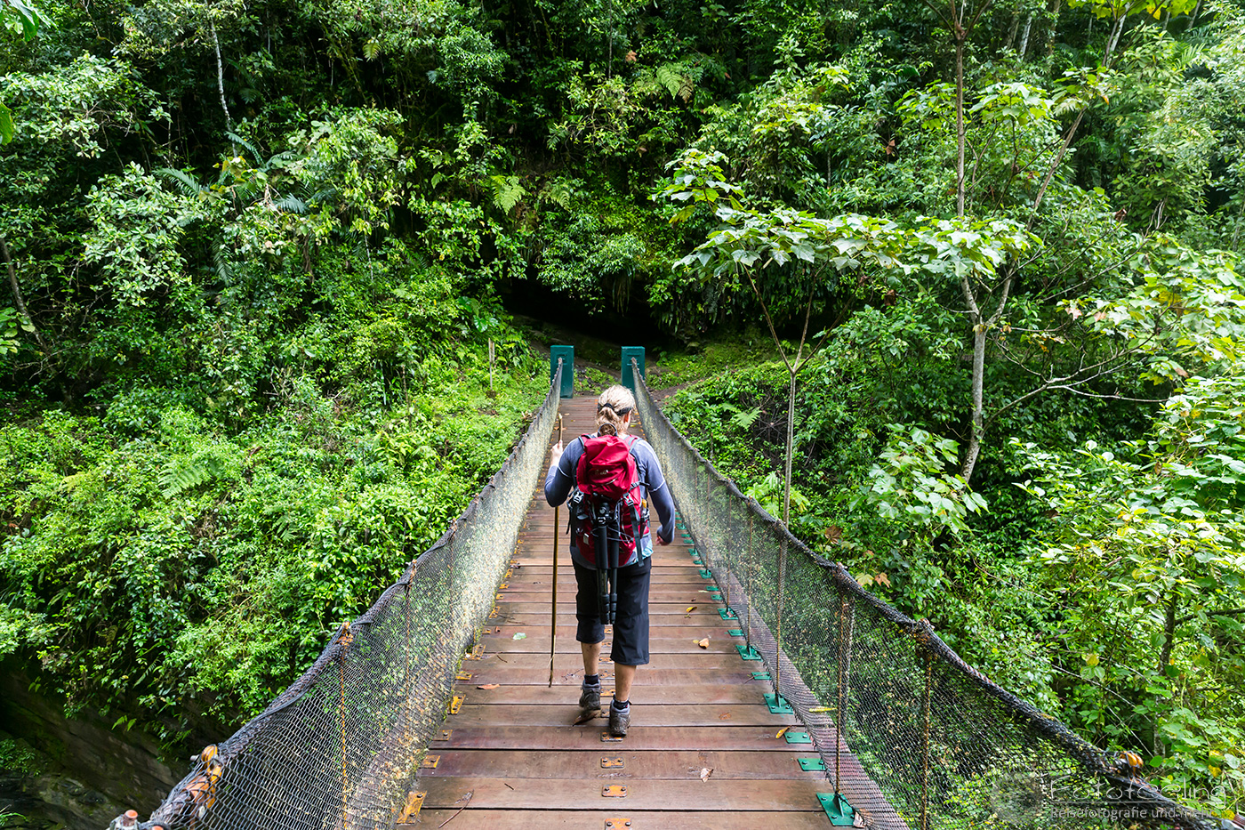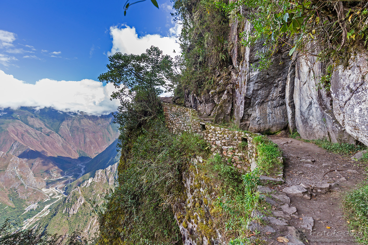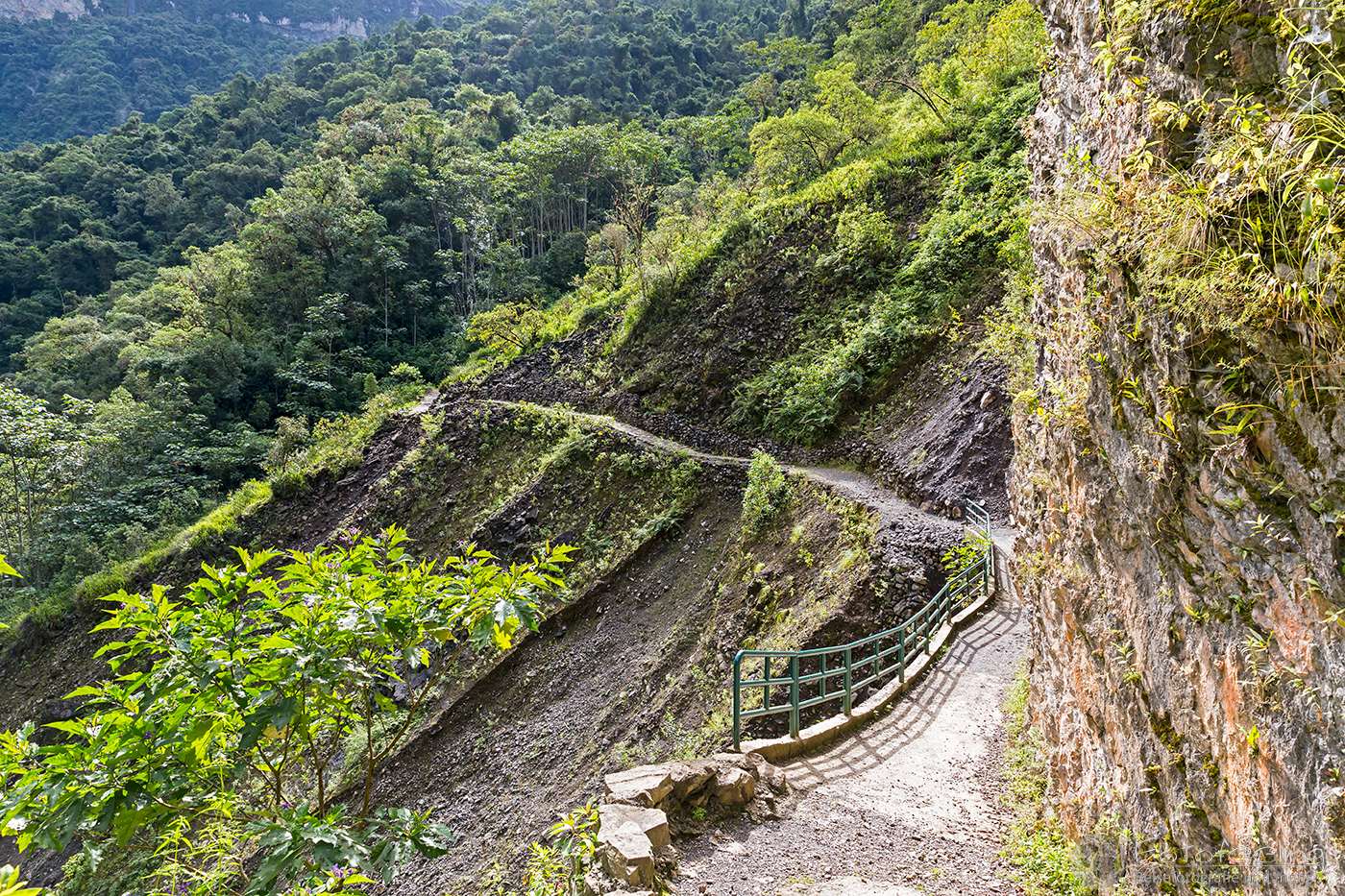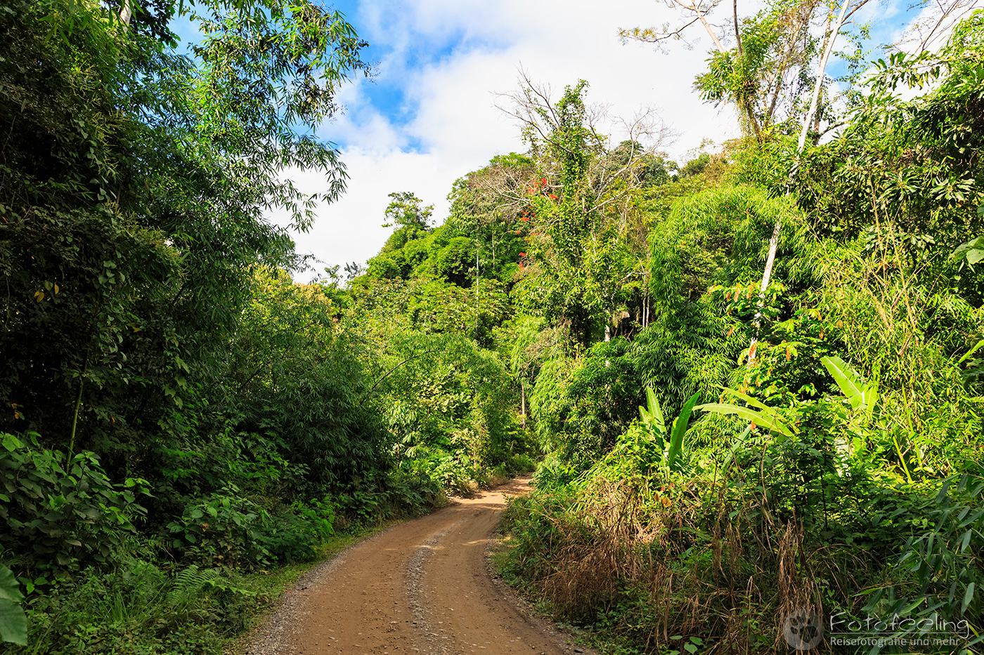 Anfangs liefen wir an zahlreichen Feldern mit Mais und Zuckerrohr vorbei. Unterwegs trafen wir immer wieder auf fleißige Bauern. Später führte der Weg durch üppigen Regenwald am Fluss entlang, um sich kurz darauf in luftige Höhe zu erheben und an einer Geröllwand entlang zu führen. Hier wurde auch vor Steinschlag gewarnt, aber das Wetter war gut und von eventuellen Gerölllawinen war weit und breit nichts zu sehen. Ein paar Arbeiter schleppten schwere Dachplatten zum Fuße des Wasserfalls, wo sie eine Hütte bauten. Da wir schon mit unserem leichten Gepäck zu kämpfen hatten, war das schon eine Leistung.