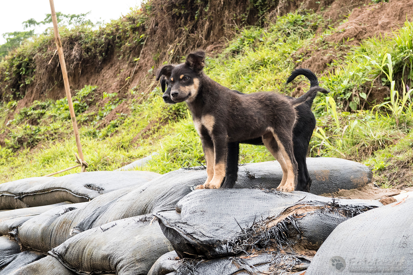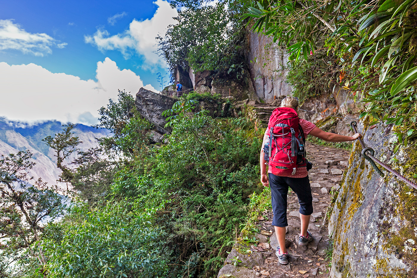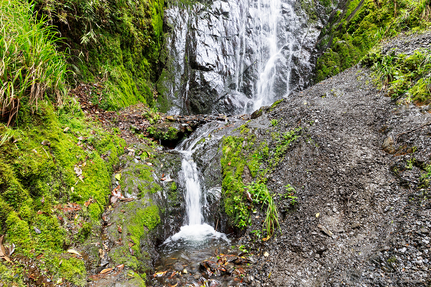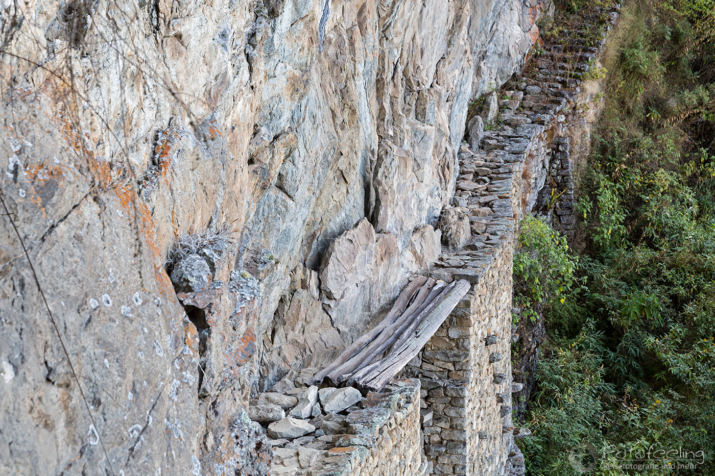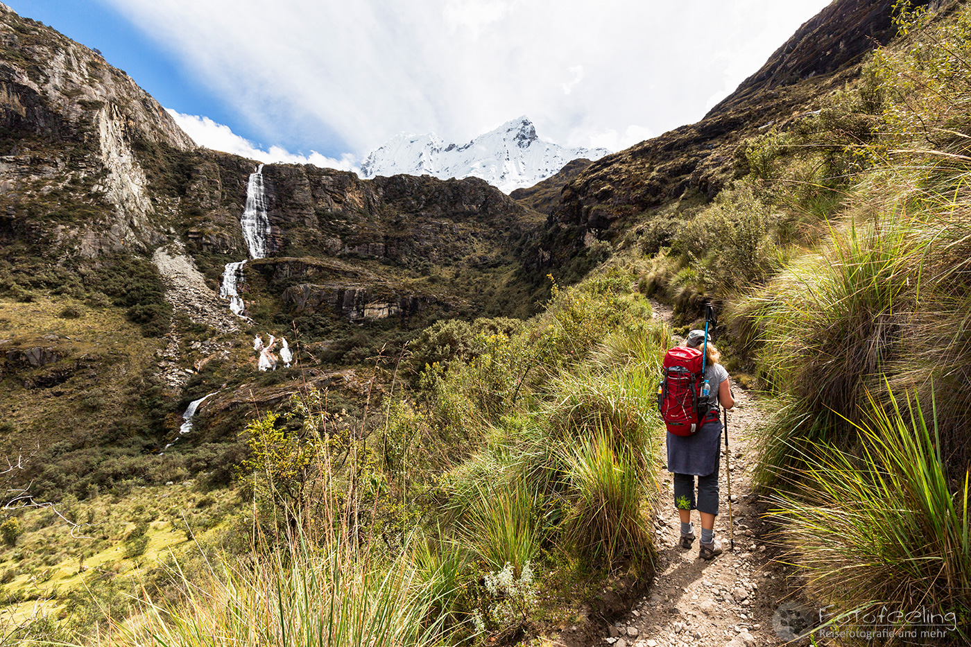 Anfangs liefen wir an zahlreichen Feldern mit Mais und Zuckerrohr vorbei. Unterwegs trafen wir immer wieder auf fleißige Bauern. Später führte der Weg durch üppigen Regenwald am Fluss entlang, um sich kurz darauf in luftige Höhe zu erheben und an einer Geröllwand entlang zu führen. Hier wurde auch vor Steinschlag gewarnt, aber das Wetter war gut und von eventuellen Gerölllawinen war weit und breit nichts zu sehen. Ein paar Arbeiter schleppten schwere Dachplatten zum Fuße des Wasserfalls, wo sie eine Hütte bauten. Da wir schon mit unserem leichten Gepäck zu kämpfen hatten, war das schon eine Leistung.