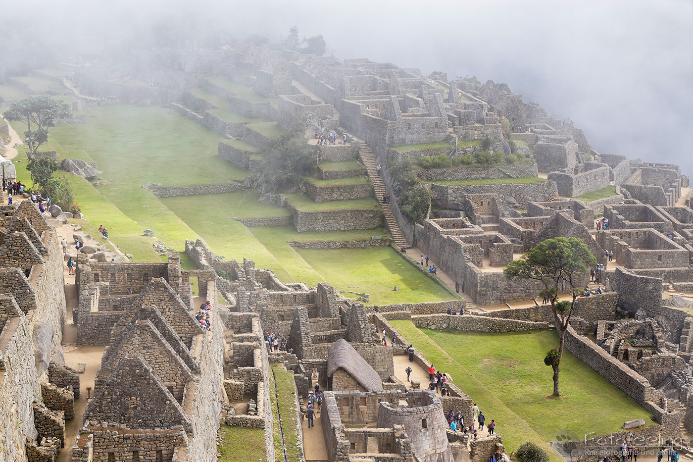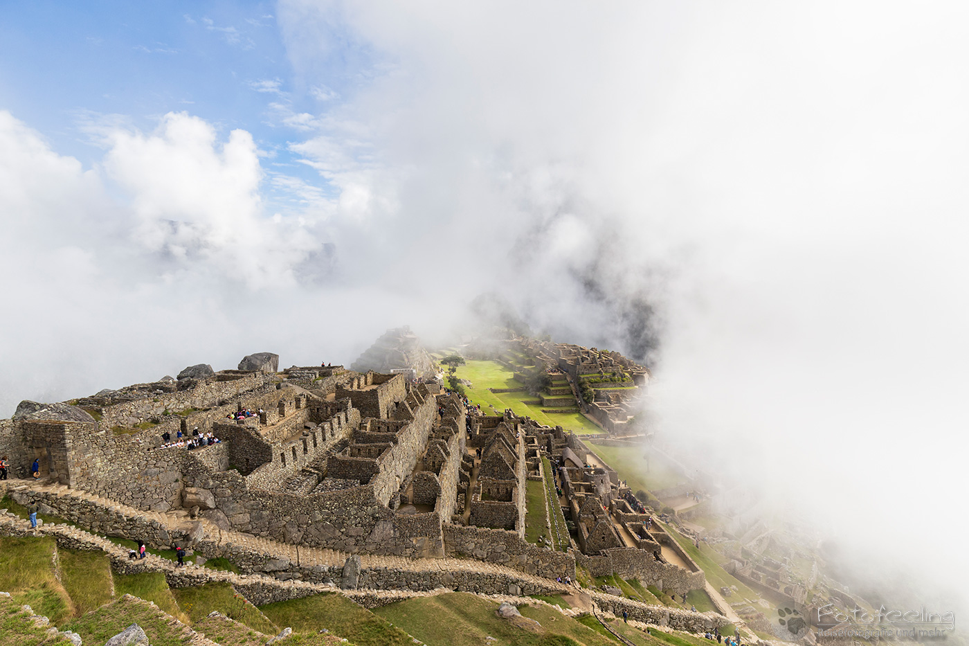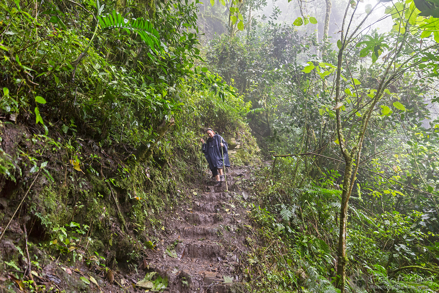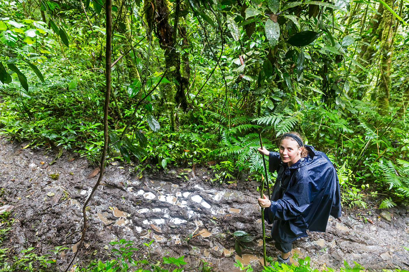 Da der erste Eingang gesperrt war, umrundeten wir die Mauern weiter bis zum zweiten Eingang. Hier begrüßte uns der Torwächter mit Handschlag und kontrollierte noch einmal unsere Karten. Dann durften wir passieren. Über eine sehr schmale Treppe mit schlüpfrigen Stufen kletterten wir langsam und sehr vorsichtig nach oben und erreichten die erste Ebene. In der Anlage sind 450 Ruinen von Rundhäusern auf zwei Ebenen zu entdecken. Darunter erkennt man Wohnstätten, öffentliche Gebäude und religiöse Plätze. Erst 1475 gelang es den Inka-Kriegern die Anlage einzunehmen, und das Volk der Chachapoya zu unterwerfen. Mächtige Bäume, Wurzeln und Bromelien haben im Laufe der Zeit die Anlage erobert, wie einst die Inkas, und verstärkten das mystische Bild zusammen mit den Nebel- und Wolkenfetzen, die tief über den Mauern hingen. Was für ein genialer Ort!