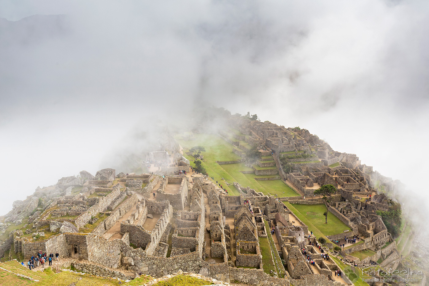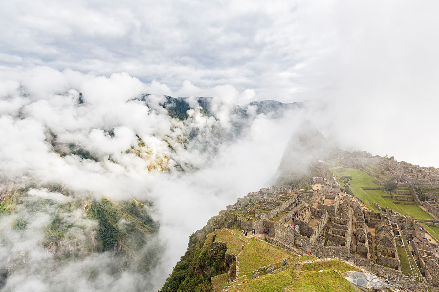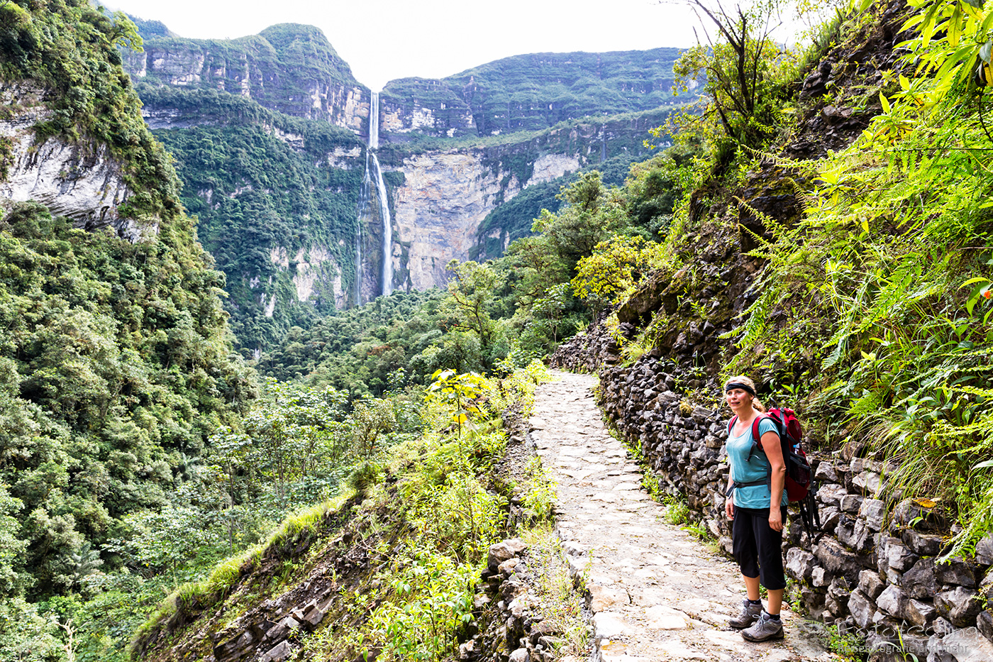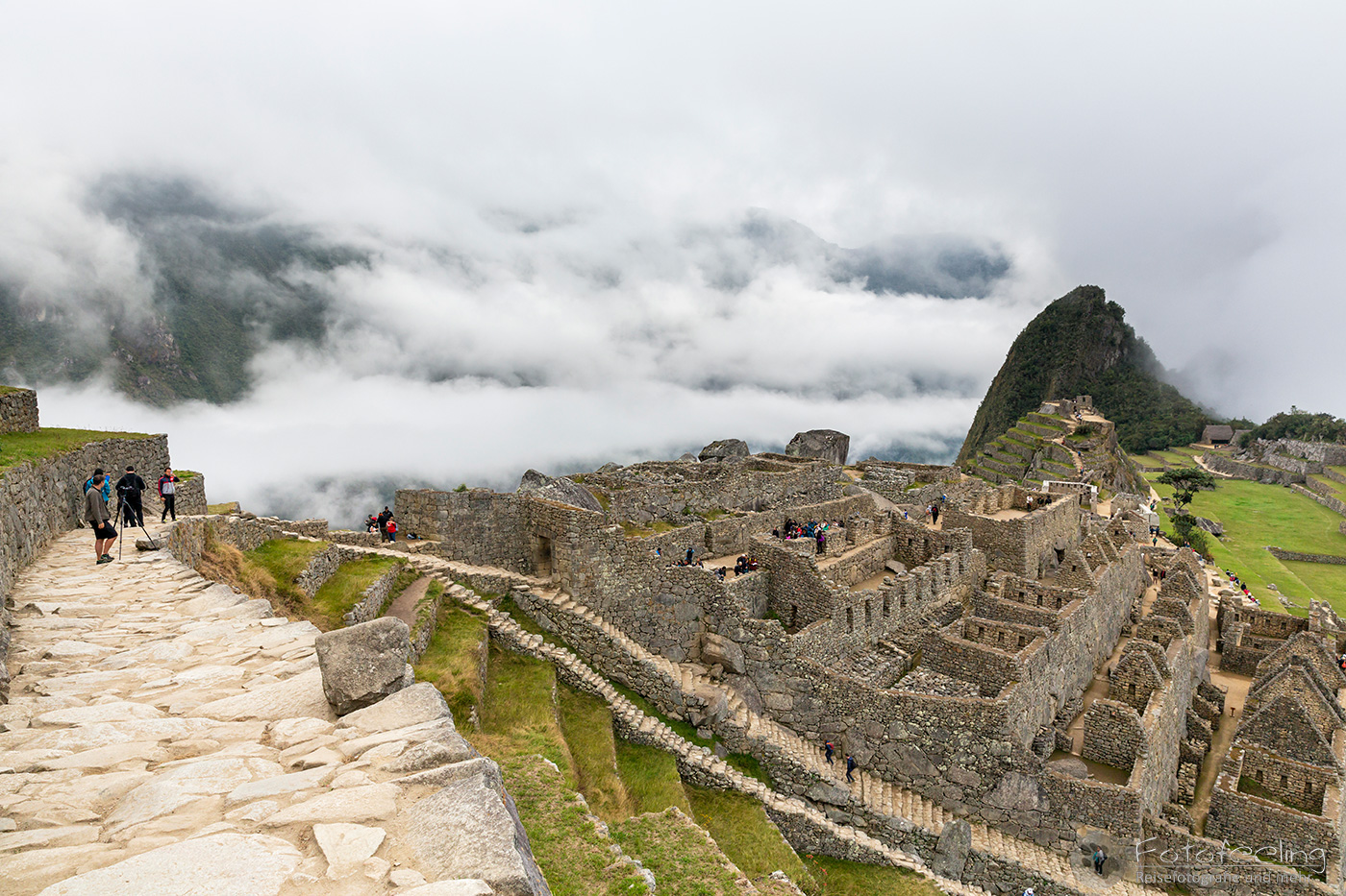 Da der erste Eingang gesperrt war, umrundeten wir die Mauern weiter bis zum zweiten Eingang. Hier begrüßte uns der Torwächter mit Handschlag und kontrollierte noch einmal unsere Karten. Dann durften wir passieren. Über eine sehr schmale Treppe mit schlüpfrigen Stufen kletterten wir langsam und sehr vorsichtig nach oben und erreichten die erste Ebene. In der Anlage sind 450 Ruinen von Rundhäusern auf zwei Ebenen zu entdecken. Darunter erkennt man Wohnstätten, öffentliche Gebäude und religiöse Plätze. Erst 1475 gelang es den Inka-Kriegern die Anlage einzunehmen, und das Volk der Chachapoya zu unterwerfen. Mächtige Bäume, Wurzeln und Bromelien haben im Laufe der Zeit die Anlage erobert, wie einst die Inkas, und verstärkten das mystische Bild zusammen mit den Nebel- und Wolkenfetzen, die tief über den Mauern hingen. Was für ein genialer Ort!