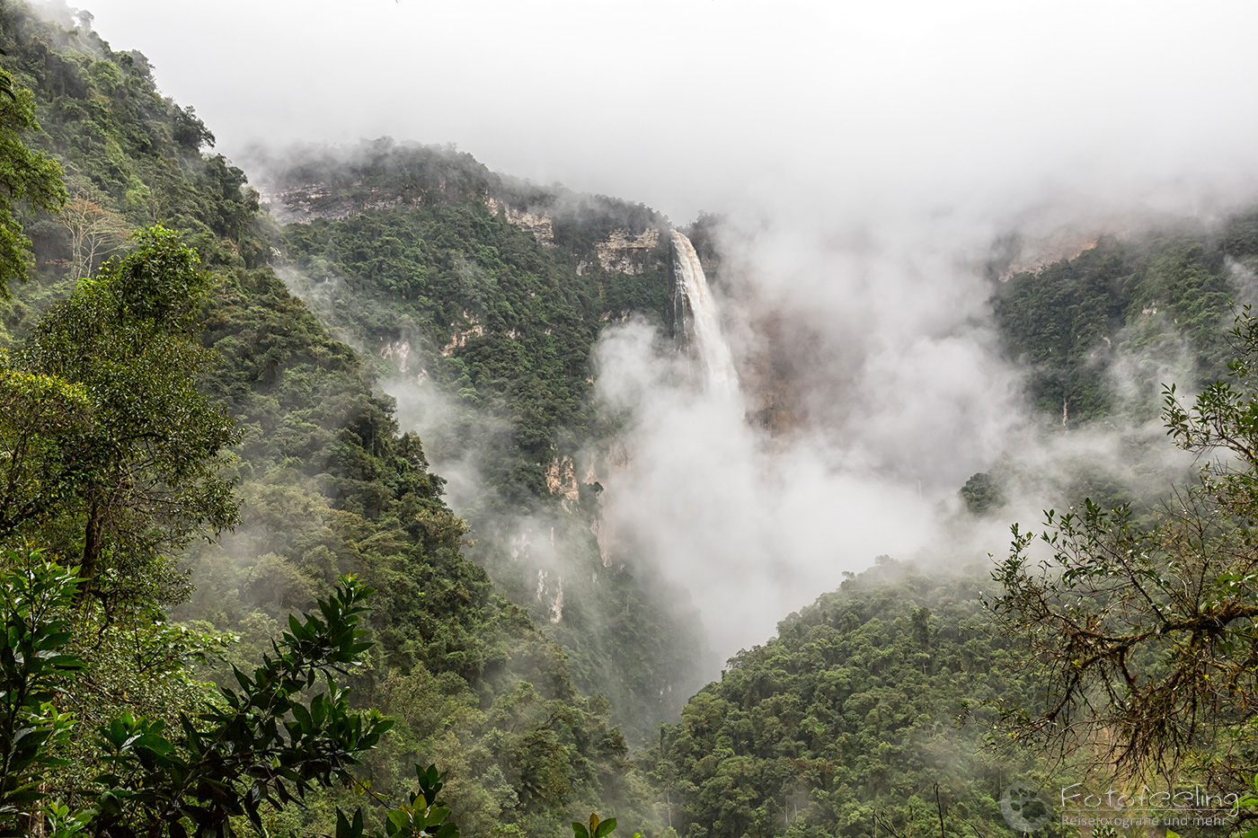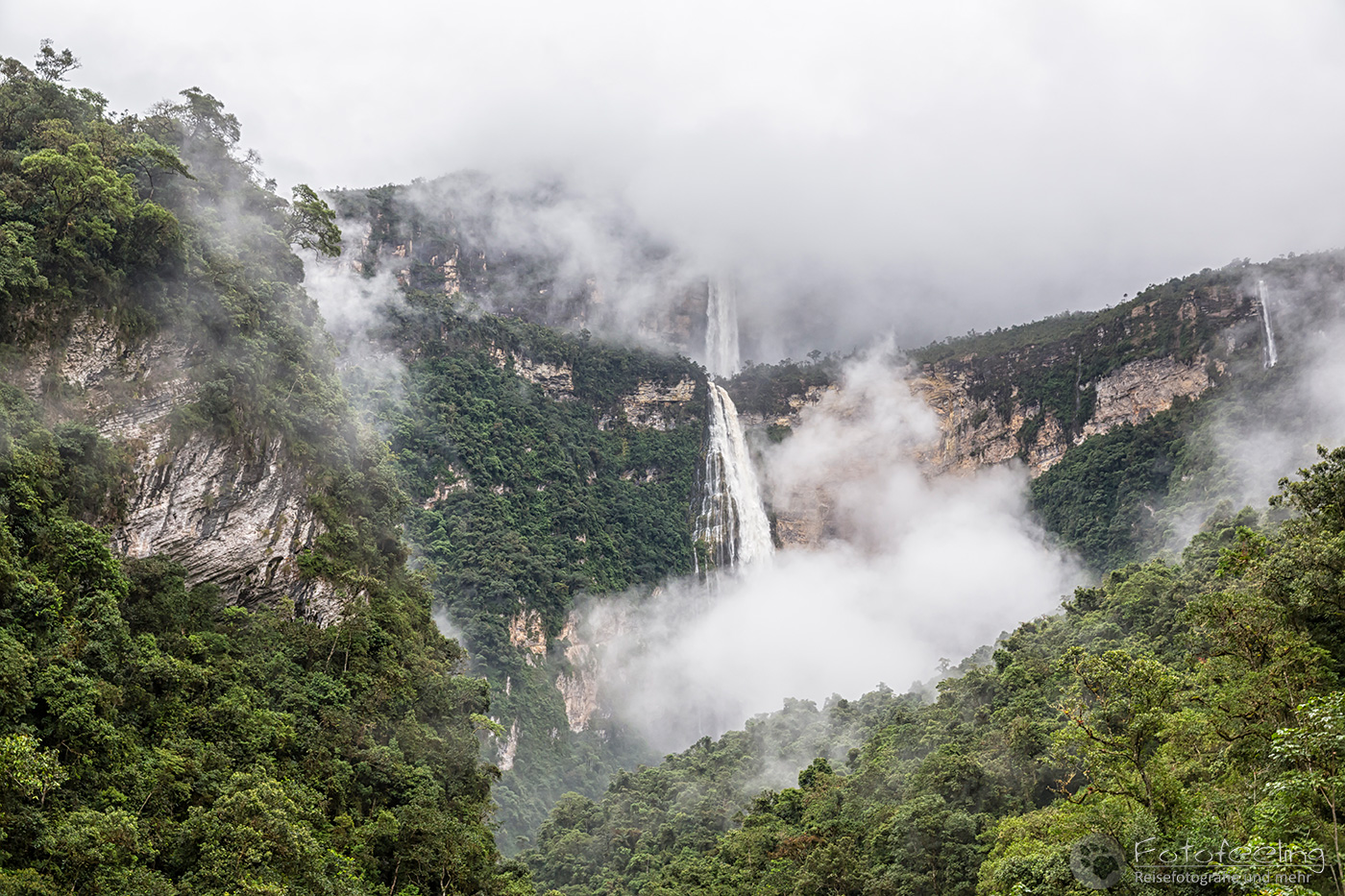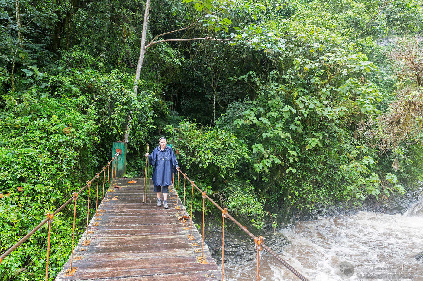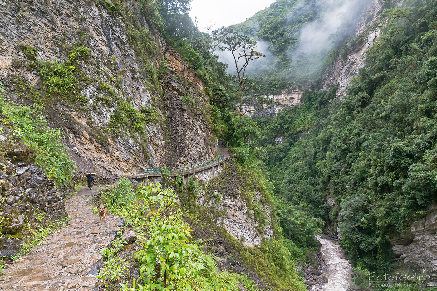 Als wir am Fuße des Wasserfalls ankamen, waren wir echt beeindruckt. Der Gocta Wasserfall gilt mit seinen 771 m als dritthöchster Wasserfall der Welt. Er hat zwei Stufen und wir standen nun an der unteren deutlich höheren Stufe und blickten hinauf. Die Gischt spritzte uns ins Gesicht und es war richtig kalt, aber auch sehr eindrucksvoll. Wir hielten uns eine Weile auf und genossen den mächtigen Wasserfall aus nächster Nähe, dann machten wir uns auf den Rückweg. Unterwegs trafen wir auf einen jungen Südamerikaner mit einer Führerin, die fragte Chris nach dem Weg hinauf zur Mittelstufe. Sie erklärte und der Junge übersetzte für uns ins Englische. Nach ca. einem Kilometer standen wir am Abzweig, den wir auf dem Hinweg überhaupt nicht gesehen hatten. Mir hätte eigentlich auch die 11 km-Tour gereicht, denn das viele Auf und Ab war schon kräftezehrend, aber Chris wollte unbedingt die mittlere Stufe sehen und überredete mich. Also kletterten wir den matschigen Weg erst einmal bergab zum Fluss hinab, den wir über eine fetzige Hängebrücke überquerten. Das Wasser floss über die mächtigen Steine und schäumte weiß unter uns. Da war jetzt schon so eine Geschwindigkeit drin, wie würde es dann erst nach einem heftigen Regenguss sein, fragte ich mich. Zu dem Zeitpunkt wusste ich noch nicht, dass ich das noch herausfinden würde…