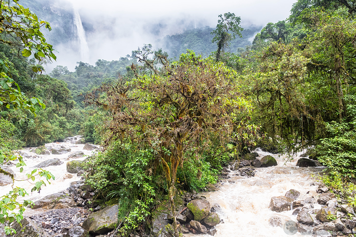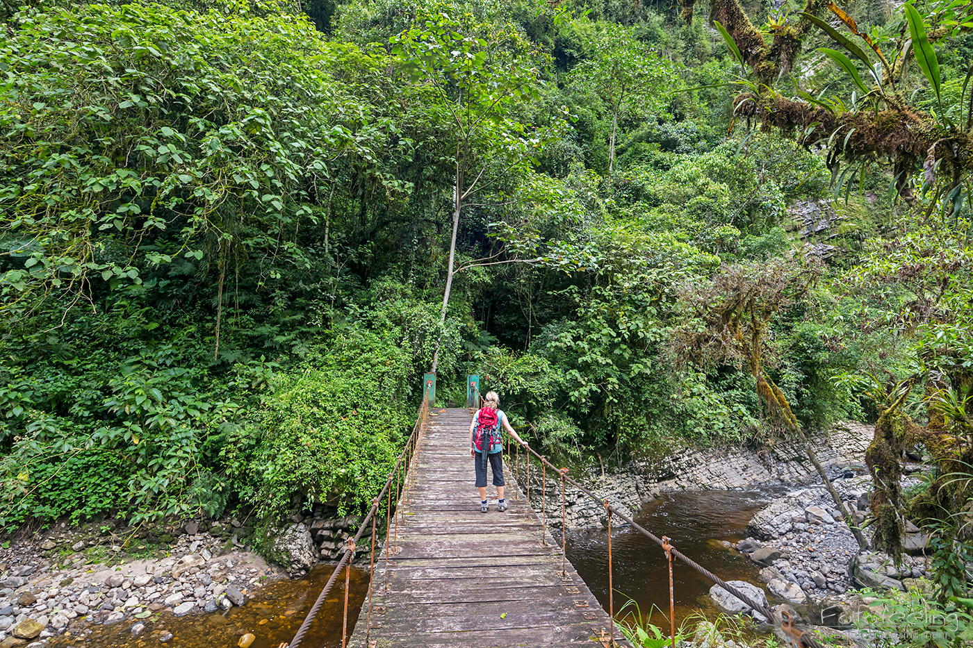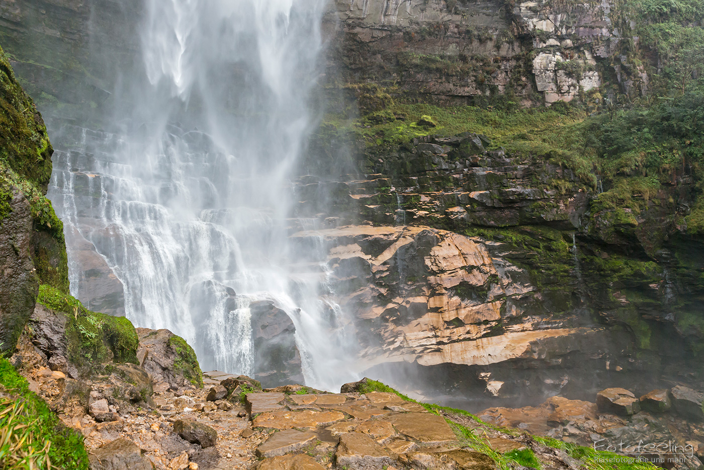 Als wir am Fuße des Wasserfalls ankamen, waren wir echt beeindruckt. Der Gocta Wasserfall gilt mit seinen 771 m als dritthöchster Wasserfall der Welt. Er hat zwei Stufen und wir standen nun an der unteren deutlich höheren Stufe und blickten hinauf. Die Gischt spritzte uns ins Gesicht und es war richtig kalt, aber auch sehr eindrucksvoll. Wir hielten uns eine Weile auf und genossen den mächtigen Wasserfall aus nächster Nähe, dann machten wir uns auf den Rückweg. Unterwegs trafen wir auf einen jungen Südamerikaner mit einer Führerin, die fragte Chris nach dem Weg hinauf zur Mittelstufe. Sie erklärte und der Junge übersetzte für uns ins Englische. Nach ca. einem Kilometer standen wir am Abzweig, den wir auf dem Hinweg überhaupt nicht gesehen hatten. Mir hätte eigentlich auch die 11 km-Tour gereicht, denn das viele Auf und Ab war schon kräftezehrend, aber Chris wollte unbedingt die mittlere Stufe sehen und überredete mich. Also kletterten wir den matschigen Weg erst einmal bergab zum Fluss hinab, den wir über eine fetzige Hängebrücke überquerten. Das Wasser floss über die mächtigen Steine und schäumte weiß unter uns. Da war jetzt schon so eine Geschwindigkeit drin, wie würde es dann erst nach einem heftigen Regenguss sein, fragte ich mich. Zu dem Zeitpunkt wusste ich noch nicht, dass ich das noch herausfinden würde…