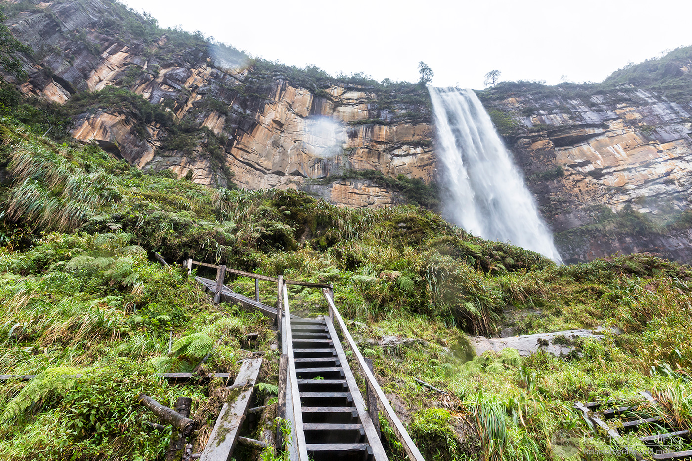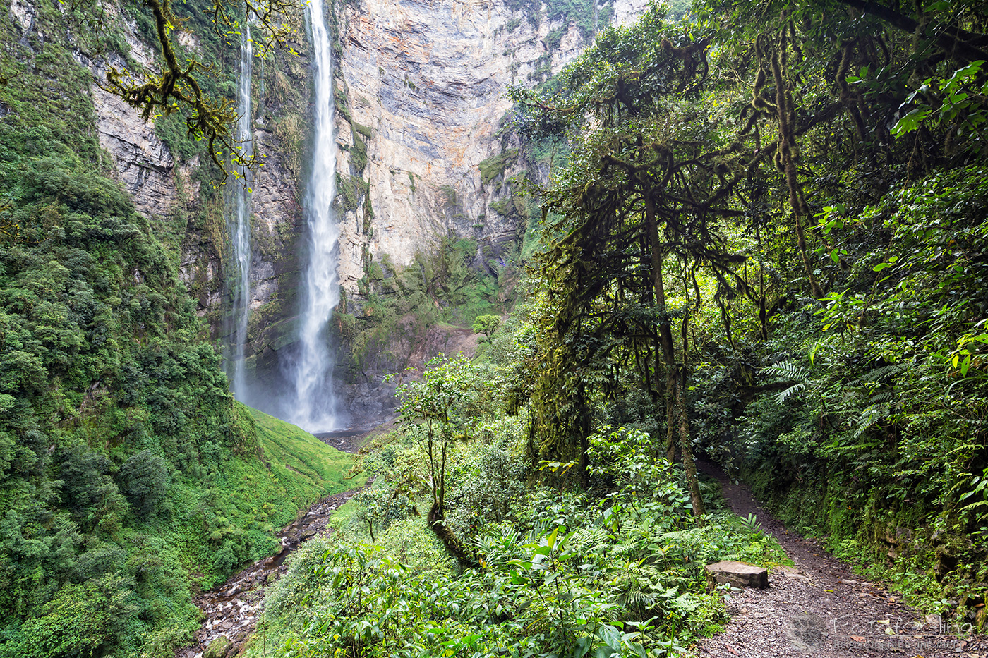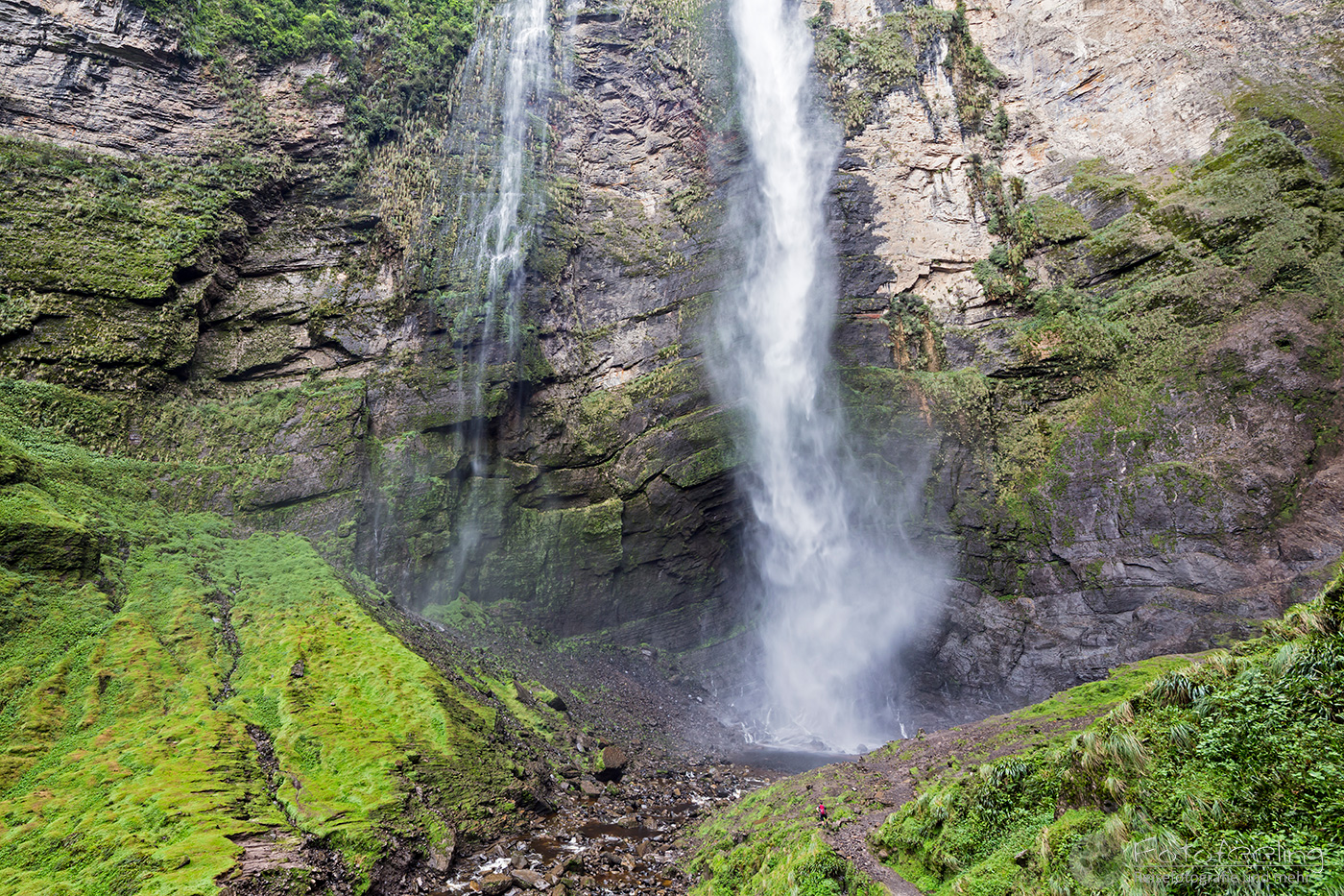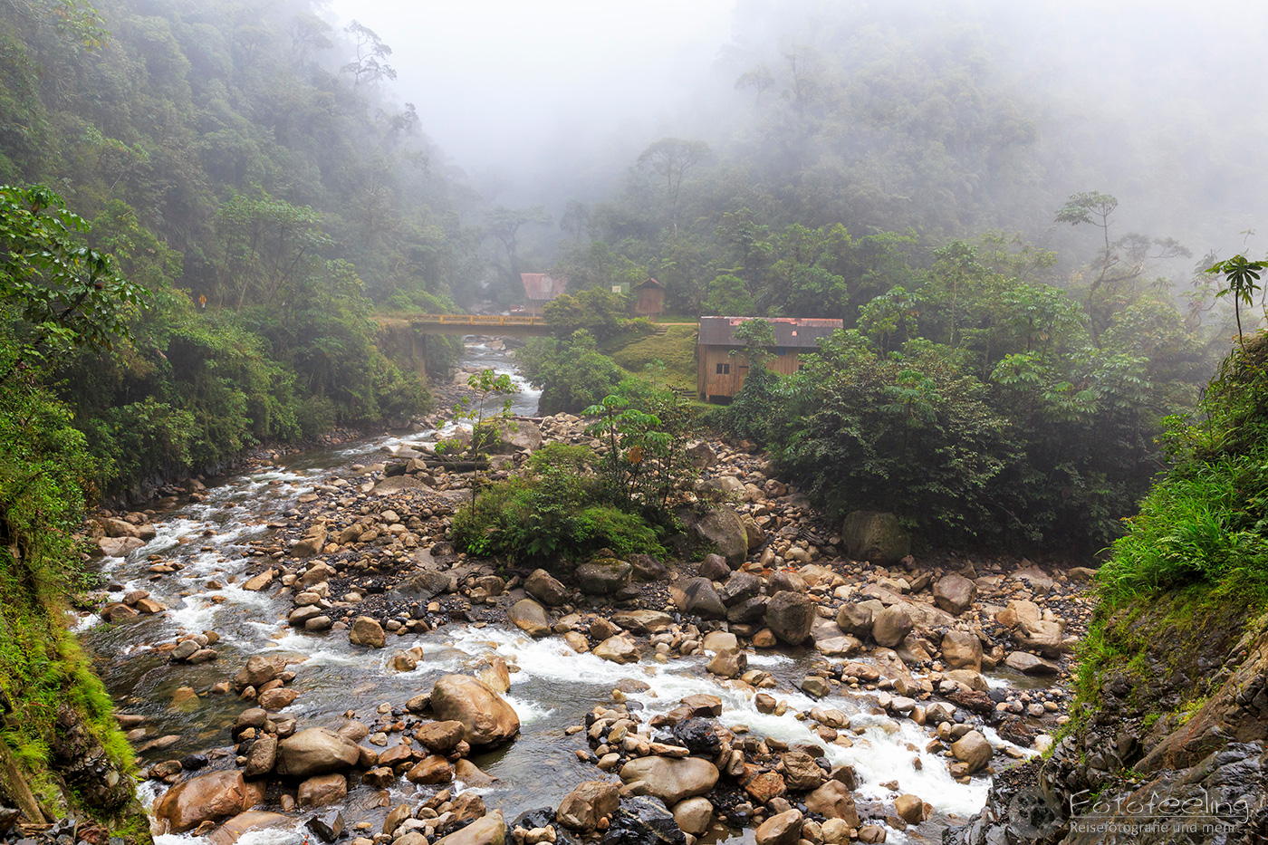 Als wir am Fuße des Wasserfalls ankamen, waren wir echt beeindruckt. Der Gocta Wasserfall gilt mit seinen 771 m als dritthöchster Wasserfall der Welt. Er hat zwei Stufen und wir standen nun an der unteren deutlich höheren Stufe und blickten hinauf. Die Gischt spritzte uns ins Gesicht und es war richtig kalt, aber auch sehr eindrucksvoll. Wir hielten uns eine Weile auf und genossen den mächtigen Wasserfall aus nächster Nähe, dann machten wir uns auf den Rückweg. Unterwegs trafen wir auf einen jungen Südamerikaner mit einer Führerin, die fragte Chris nach dem Weg hinauf zur Mittelstufe. Sie erklärte und der Junge übersetzte für uns ins Englische. Nach ca. einem Kilometer standen wir am Abzweig, den wir auf dem Hinweg überhaupt nicht gesehen hatten. Mir hätte eigentlich auch die 11 km-Tour gereicht, denn das viele Auf und Ab war schon kräftezehrend, aber Chris wollte unbedingt die mittlere Stufe sehen und überredete mich. Also kletterten wir den matschigen Weg erst einmal bergab zum Fluss hinab, den wir über eine fetzige Hängebrücke überquerten. Das Wasser floss über die mächtigen Steine und schäumte weiß unter uns. Da war jetzt schon so eine Geschwindigkeit drin, wie würde es dann erst nach einem heftigen Regenguss sein, fragte ich mich. Zu dem Zeitpunkt wusste ich noch nicht, dass ich das noch herausfinden würde…