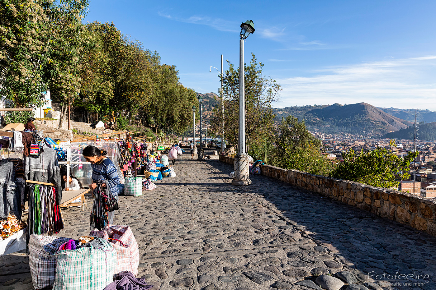 Danach besuchten wir noch ein paar schöne Aussichtsplätze wie den Mirador de San Blas mit der gleichnamigen Kirche. Hier fand gerade ein schöner Künstlermarkt statt, über den wir schlenderten. In einem Hinterhof kauften wir zwei schöne peruanische Tischdecken, die uns in Zukunft an diesen wunderbaren Urlaub erinnern werden.