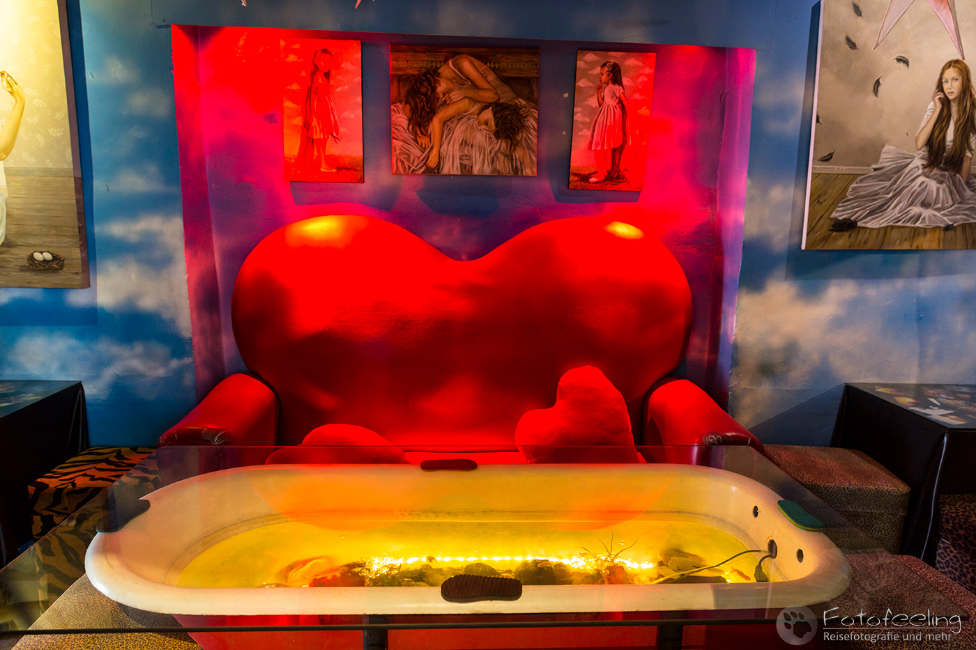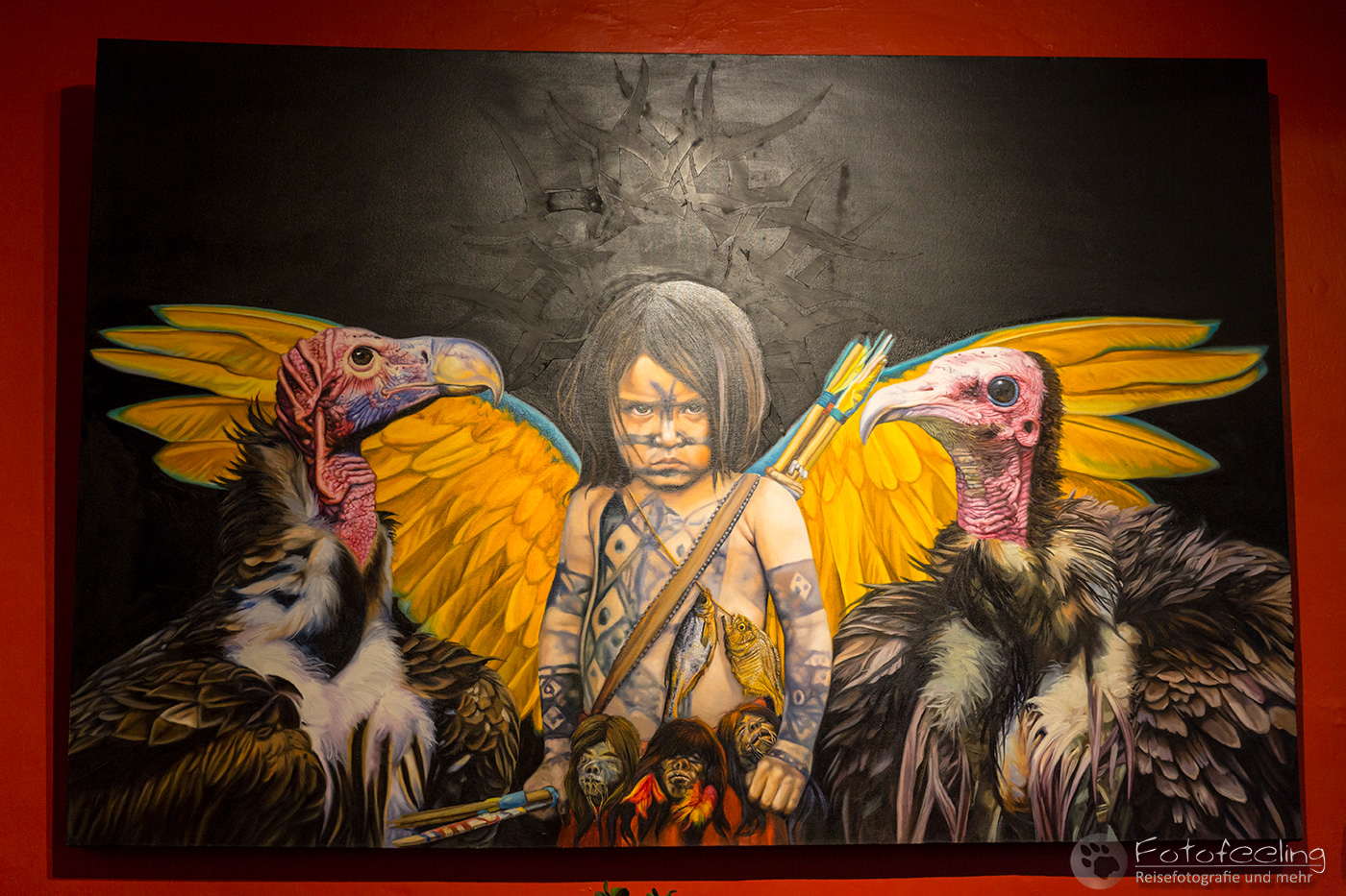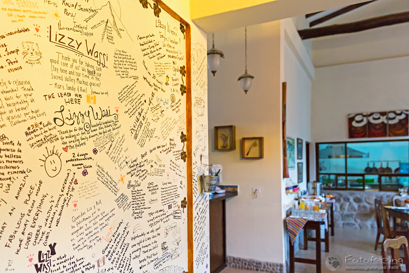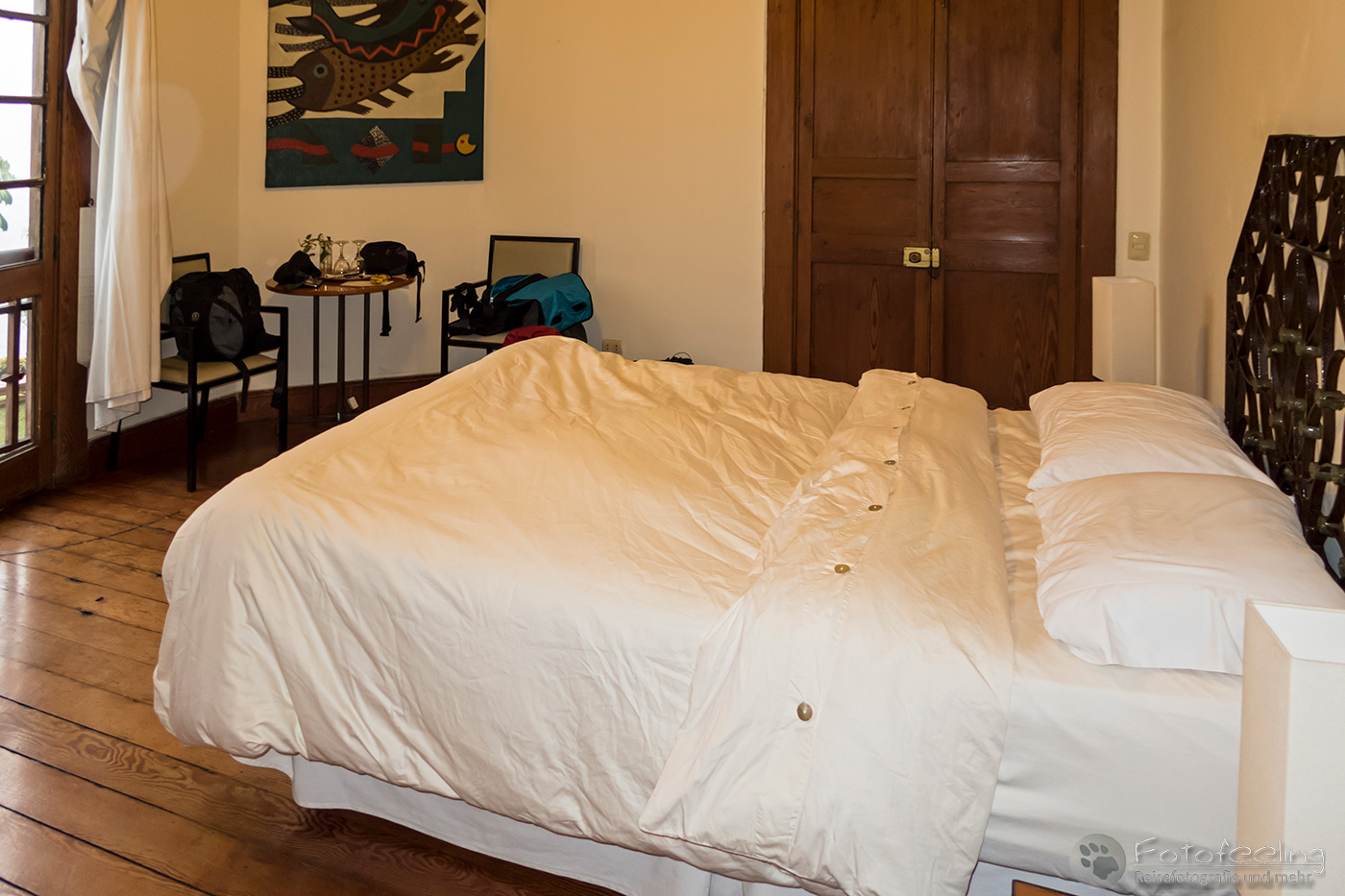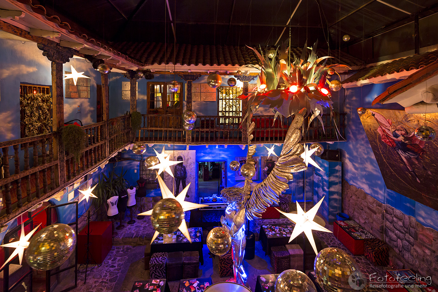 Das Hotel Fallen Angel lag nahe der Plaza de Armas und ist ein Boutique-Hotel mit vielen tollen Bildern von hervorragenden Künstlern und absolut genialen Kleinigkeiten und Accessoires. Um zum Zimmer zu kommen, muss man erst einmal durch das Restaurant. Hier hingen überall Schweine mit Engelsflügel oder Engel von der Decke. Tische sind aus alten gusseisernen Badewannen mit Glasplatten und darin schwimmen Goldfische und liegen Lichterketten. Wir wussten gar nicht, wo wir zuerst hinschauen sollten und beschlossen, gleich hier zu essen. Barbara wies uns im Innenhof, wo ein riesiger Engel stand, ein und kam mit einem roten Schlüsselpuschel zu uns. Wir hatten das Standard-Zimmer gebucht. Gerade als sie uns den Schlüssel geben wollte, verschwand sie noch einmal und kam kurz darauf mit einem weißem Schlüsselpuschel zurück. Sie schaute uns an und sagte, dass wir Glück hätten, normalerweise bekommt jeder sein gebuchtes Zimmer, aber ein älteres Paar könne nicht über die Treppe zum Bett und hätte gerne das kleine Zimmer. Sie führte uns in eine riesige Suite, die alleine schon ein Museum hätte sein können. Eine Küche mit Retrokühlschrank und Sitzecke, eine riesige Couch über der tolle Bilder hingen und ein Vorhang, hinter dem sich das Bad und die Treppe nach oben in den Schlafraum befanden. Wow, war das toll hier und so groß. Wir waren hin und weg und überließen unser Zimmer gerne dem älteren Paar.