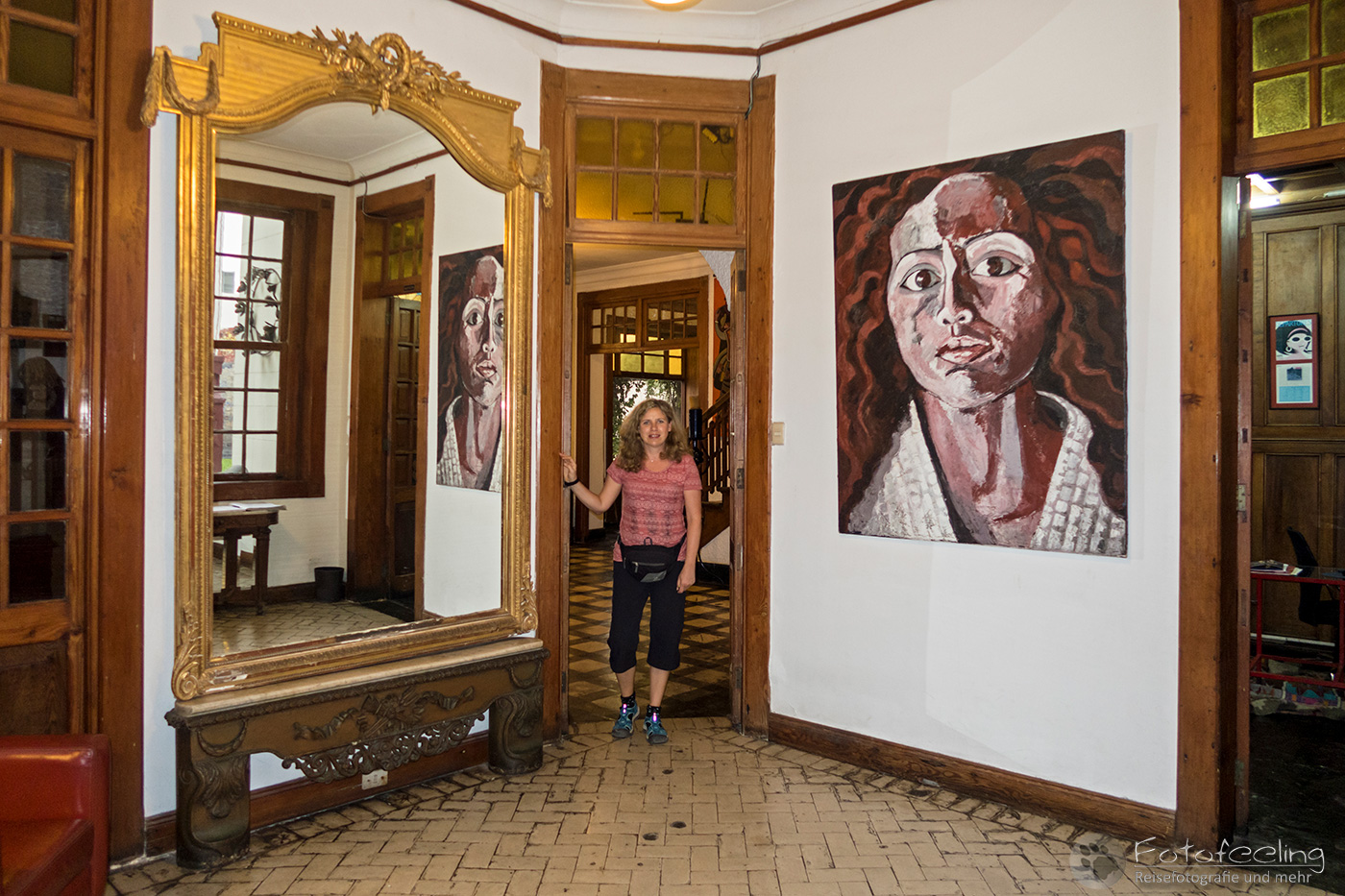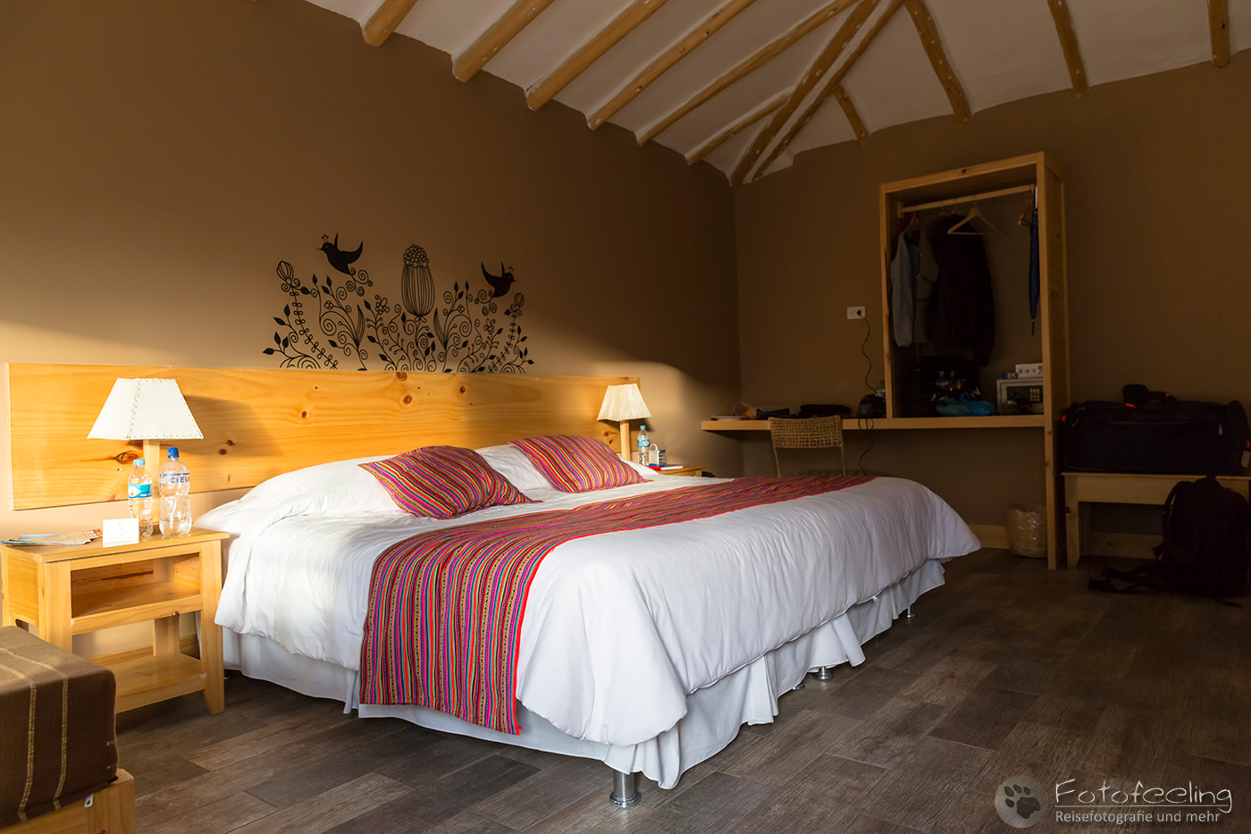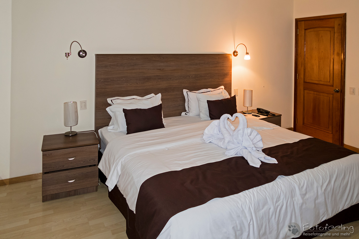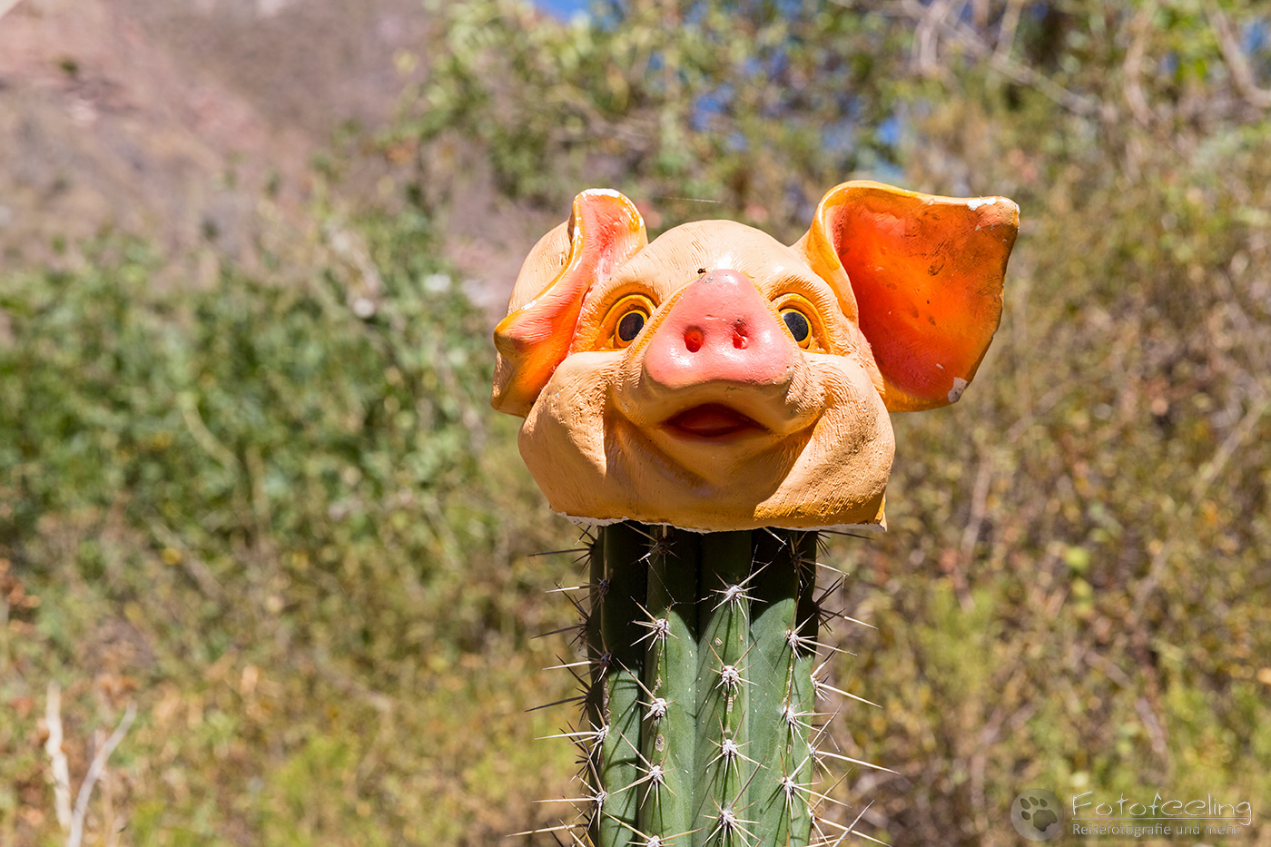 Das Hotel Fallen Angel lag nahe der Plaza de Armas und ist ein Boutique-Hotel mit vielen tollen Bildern von hervorragenden Künstlern und absolut genialen Kleinigkeiten und Accessoires. Um zum Zimmer zu kommen, muss man erst einmal durch das Restaurant. Hier hingen überall Schweine mit Engelsflügel oder Engel von der Decke. Tische sind aus alten gusseisernen Badewannen mit Glasplatten und darin schwimmen Goldfische und liegen Lichterketten. Wir wussten gar nicht, wo wir zuerst hinschauen sollten und beschlossen, gleich hier zu essen. Barbara wies uns im Innenhof, wo ein riesiger Engel stand, ein und kam mit einem roten Schlüsselpuschel zu uns. Wir hatten das Standard-Zimmer gebucht. Gerade als sie uns den Schlüssel geben wollte, verschwand sie noch einmal und kam kurz darauf mit einem weißem Schlüsselpuschel zurück. Sie schaute uns an und sagte, dass wir Glück hätten, normalerweise bekommt jeder sein gebuchtes Zimmer, aber ein älteres Paar könne nicht über die Treppe zum Bett und hätte gerne das kleine Zimmer. Sie führte uns in eine riesige Suite, die alleine schon ein Museum hätte sein können. Eine Küche mit Retrokühlschrank und Sitzecke, eine riesige Couch über der tolle Bilder hingen und ein Vorhang, hinter dem sich das Bad und die Treppe nach oben in den Schlafraum befanden. Wow, war das toll hier und so groß. Wir waren hin und weg und überließen unser Zimmer gerne dem älteren Paar.