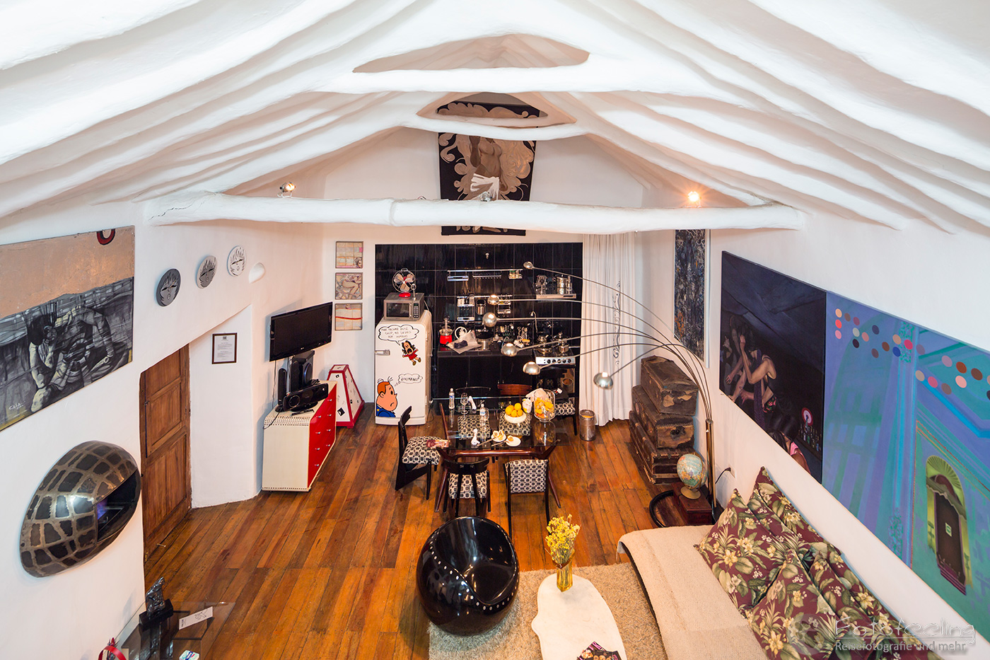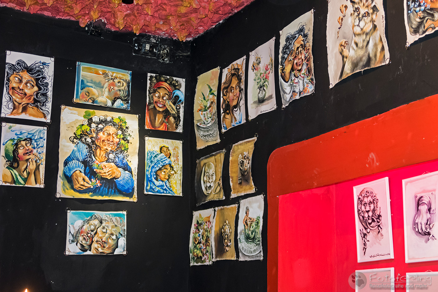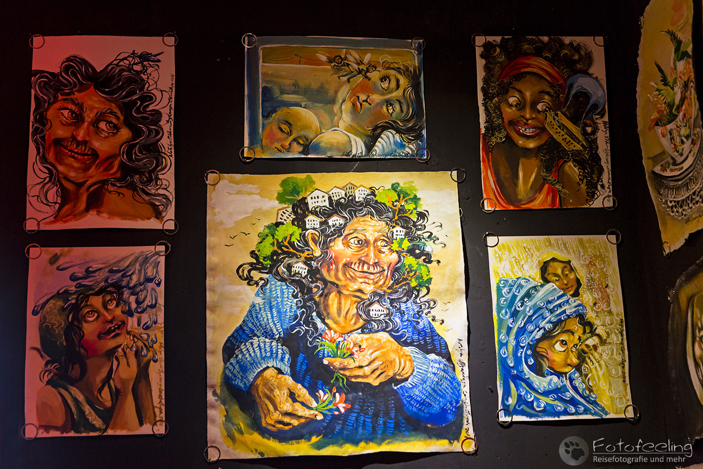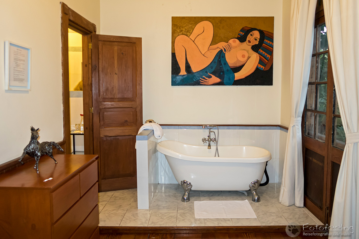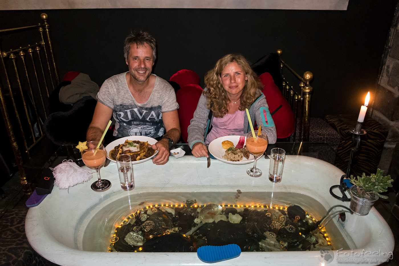 Das Hotel Fallen Angel lag nahe der Plaza de Armas und ist ein Boutique-Hotel mit vielen tollen Bildern von hervorragenden Künstlern und absolut genialen Kleinigkeiten und Accessoires. Um zum Zimmer zu kommen, muss man erst einmal durch das Restaurant. Hier hingen überall Schweine mit Engelsflügel oder Engel von der Decke. Tische sind aus alten gusseisernen Badewannen mit Glasplatten und darin schwimmen Goldfische und liegen Lichterketten. Wir wussten gar nicht, wo wir zuerst hinschauen sollten und beschlossen, gleich hier zu essen. Barbara wies uns im Innenhof, wo ein riesiger Engel stand, ein und kam mit einem roten Schlüsselpuschel zu uns. Wir hatten das Standard-Zimmer gebucht. Gerade als sie uns den Schlüssel geben wollte, verschwand sie noch einmal und kam kurz darauf mit einem weißem Schlüsselpuschel zurück. Sie schaute uns an und sagte, dass wir Glück hätten, normalerweise bekommt jeder sein gebuchtes Zimmer, aber ein älteres Paar könne nicht über die Treppe zum Bett und hätte gerne das kleine Zimmer. Sie führte uns in eine riesige Suite, die alleine schon ein Museum hätte sein können. Eine Küche mit Retrokühlschrank und Sitzecke, eine riesige Couch über der tolle Bilder hingen und ein Vorhang, hinter dem sich das Bad und die Treppe nach oben in den Schlafraum befanden. Wow, war das toll hier und so groß. Wir waren hin und weg und überließen unser Zimmer gerne dem älteren Paar.