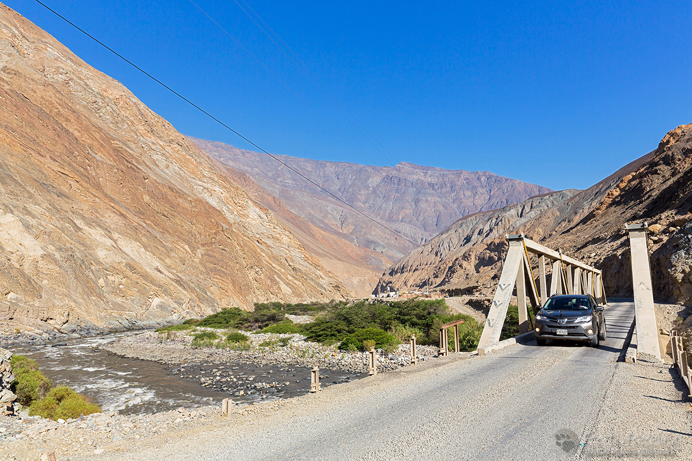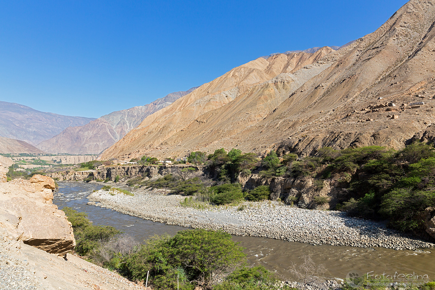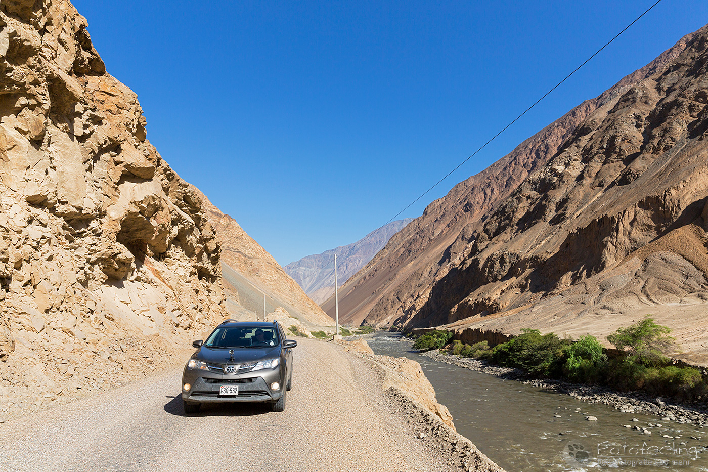 Küstennebel lag wieder wie ein graues Tuch über uns und hüllte die Landschaft ein. Doch schon um 8.00 Uhr setzt sich die Sonne durch und es wurde freundlicher. Nach 100 Kilometern auf der Panamericana verließen wir diese Richtung Nord Osten. Mittlerweile war es sonnig, grün und bergig. Es wirkte hier alles sehr trocken. Die kleinen Flüsse führten kaum Wasser. Kakteen wuchsen zwischen den Bäumen und Sträuchern.