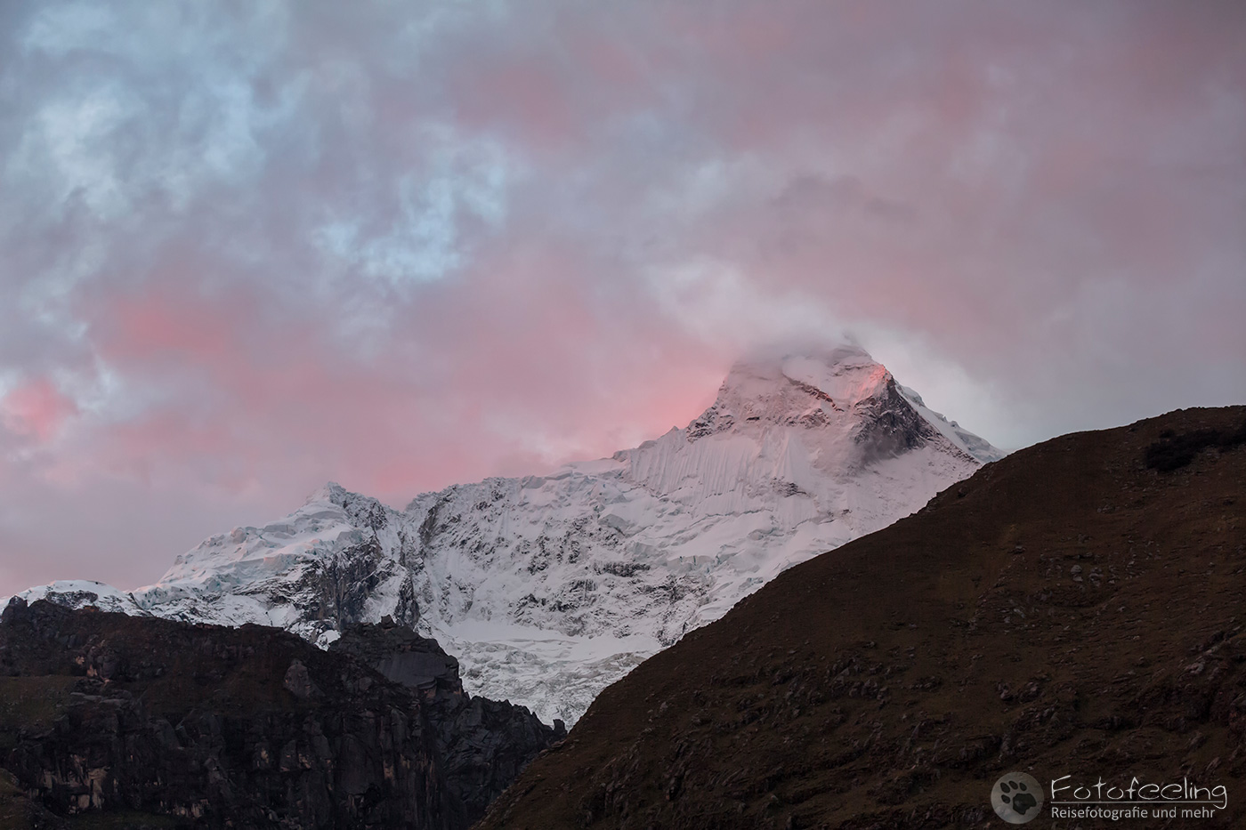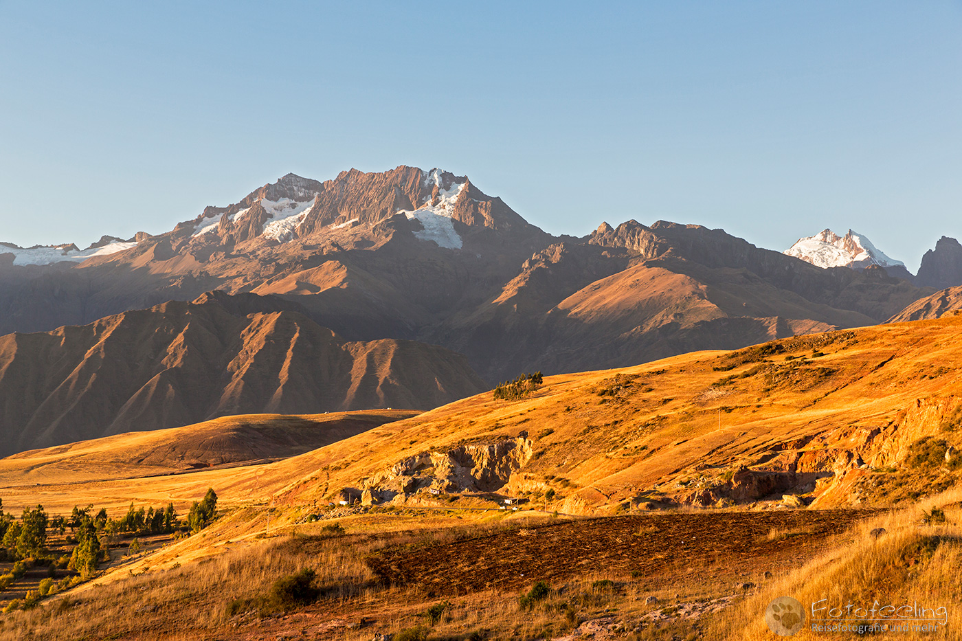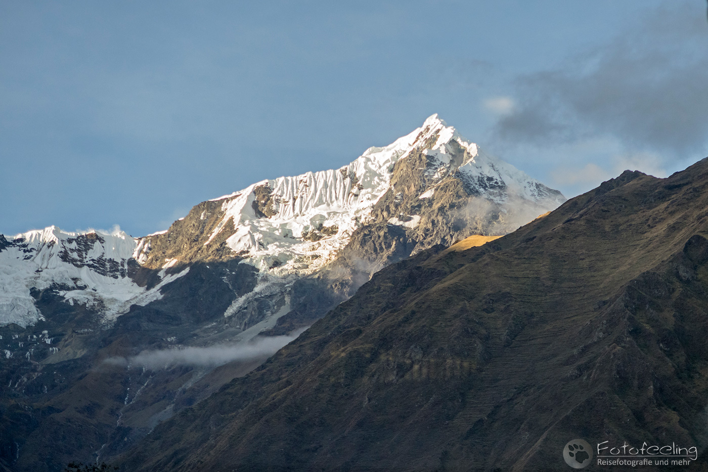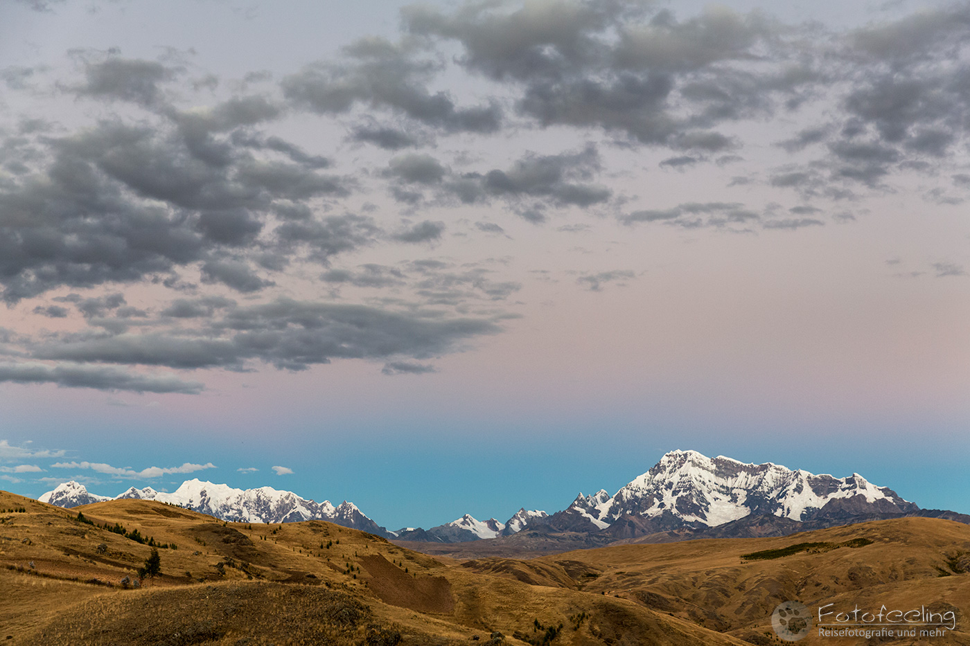 Unser Weg brachte uns immer weiter hinauf in die Anden bis auf 4300 m. Jetzt kam zu den Fahrern noch ein anderes Problem, denn das Auto war alles andere als höhentauglich. Bei der kleinsten Steigung – und es ging ja ständig bergauf – hatte der Motor keine Kraft mehr und wir wurden immer langsamer. Es ging so weit, dass sogar Lastwagen an uns vorbeizogen und die tuckerten normalerweise die Berge hinauf. Es fehlte nur noch, dass Radfahrer uns überholten. Am liebsten hätten wir den Karren angeschoben. So wurde es langsam dämmrig. Eigentlich hätten wir am Nachmittag einen schönen Blick auf den fünfthöchsten Berg Perus - den Ausangate (auch Auzangate, Quechua: Awsanqati) - haben sollen, den hatten wir nun in der Dämmerung. Der Ausangate ist 6384 m hoch und befindet sich südöstlich von Cusco am westlichen Rand der Cordillera Vilcanota.