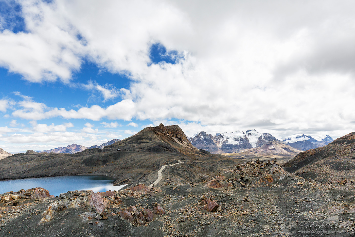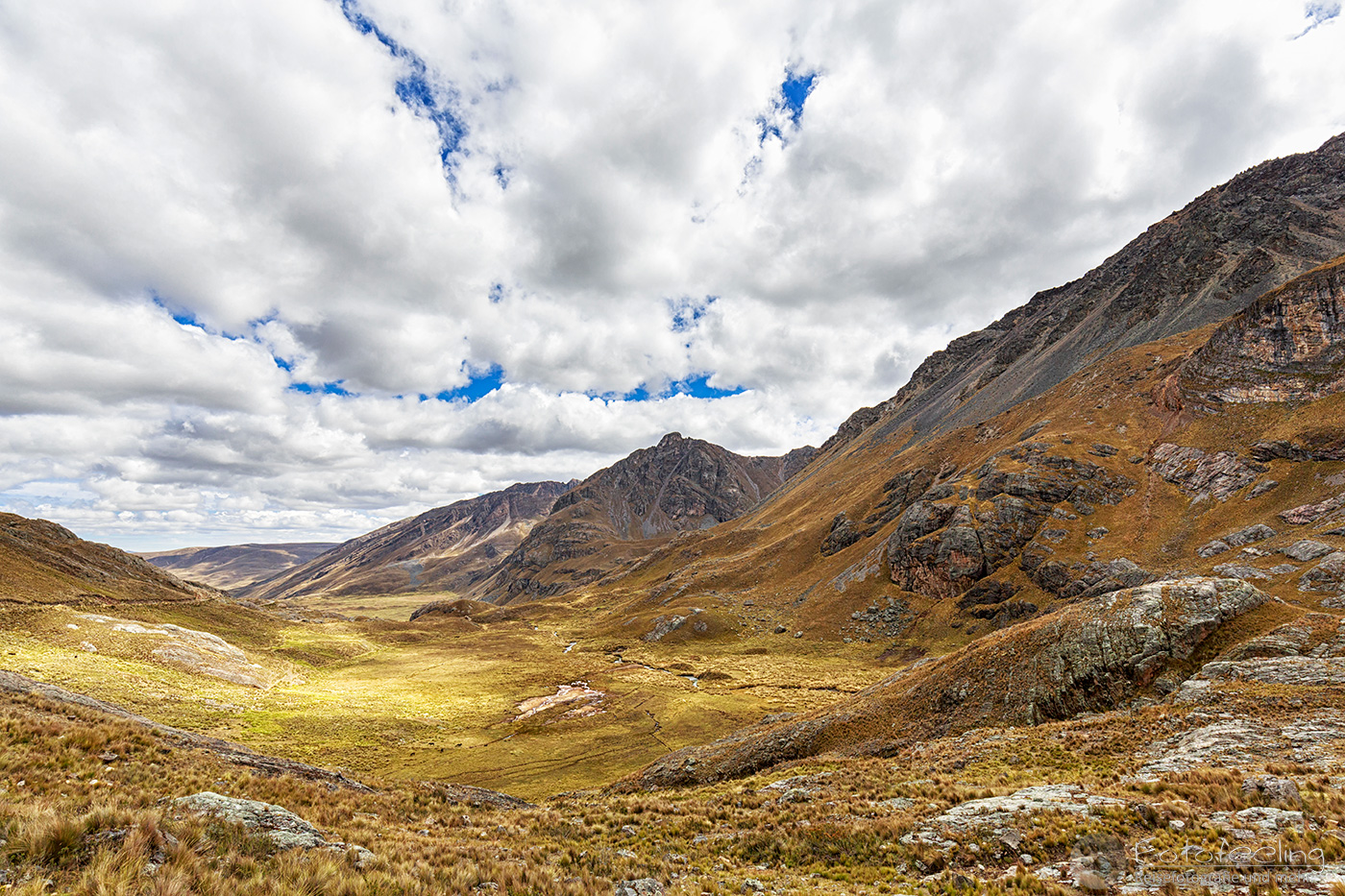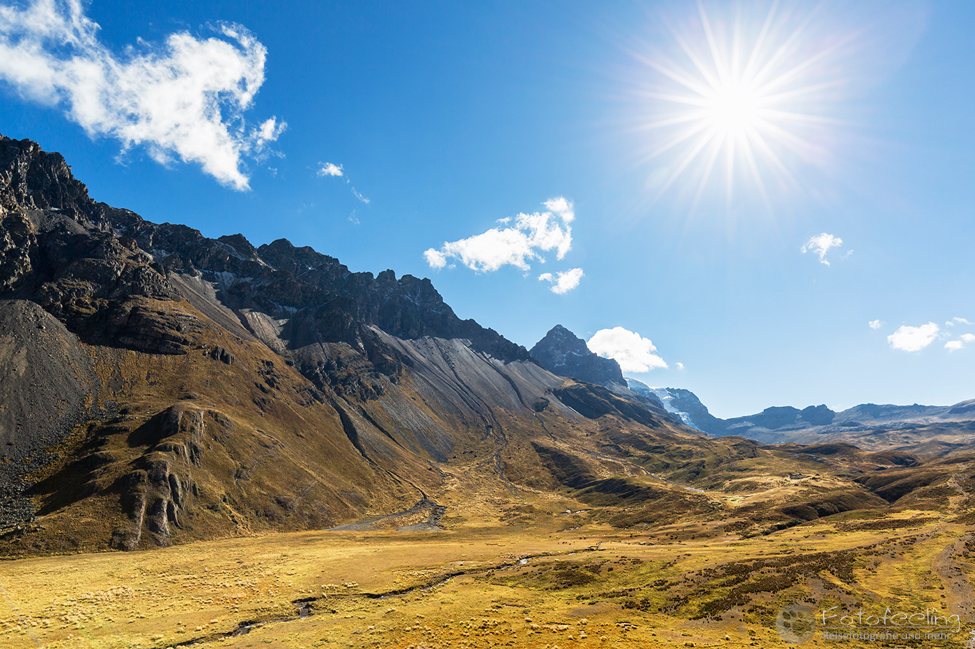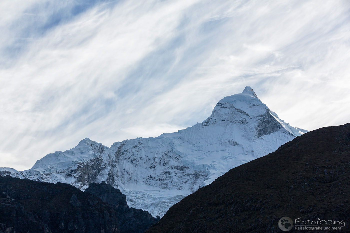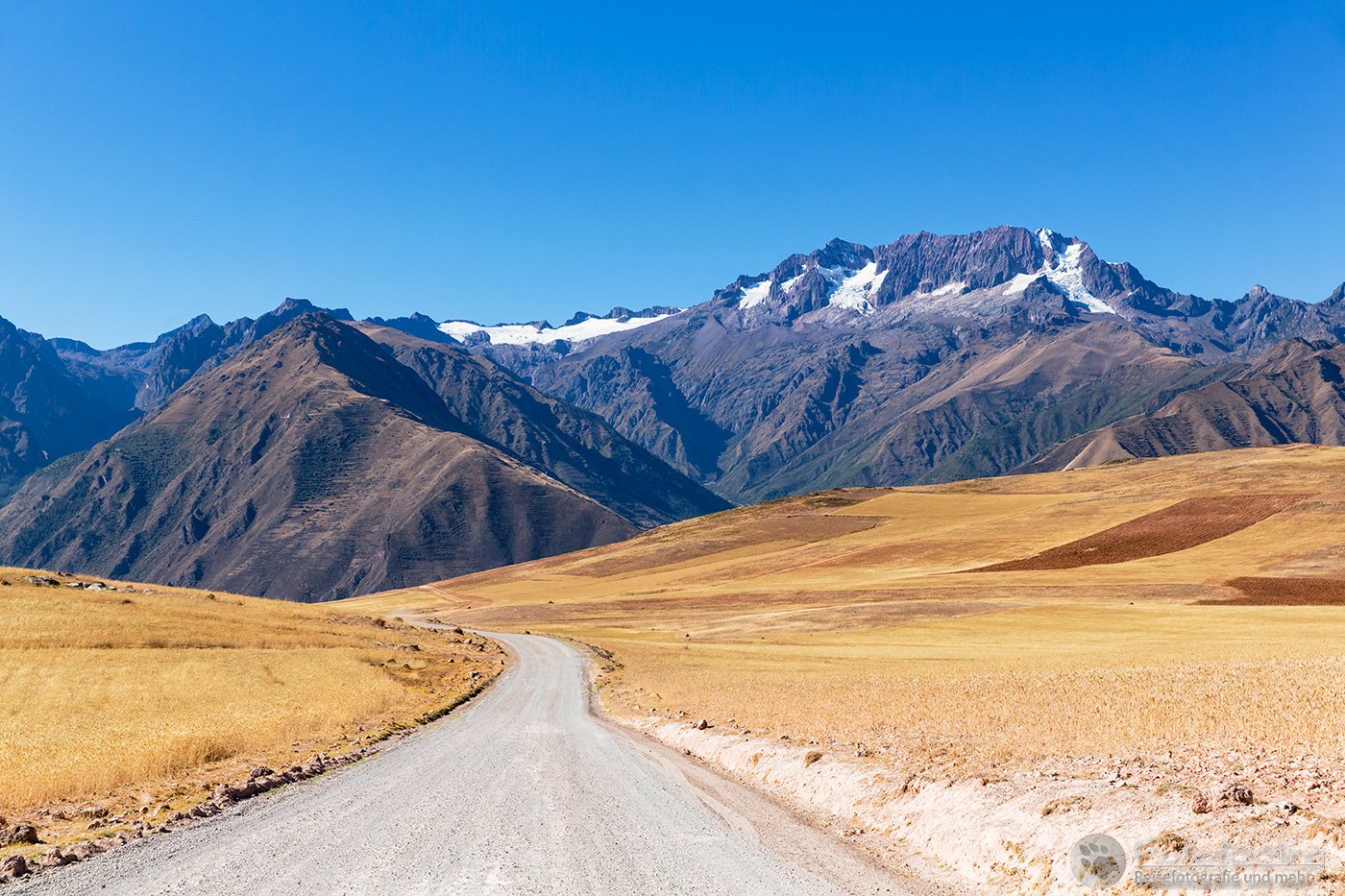 Unser Weg brachte uns immer weiter hinauf in die Anden bis auf 4300 m. Jetzt kam zu den Fahrern noch ein anderes Problem, denn das Auto war alles andere als höhentauglich. Bei der kleinsten Steigung – und es ging ja ständig bergauf – hatte der Motor keine Kraft mehr und wir wurden immer langsamer. Es ging so weit, dass sogar Lastwagen an uns vorbeizogen und die tuckerten normalerweise die Berge hinauf. Es fehlte nur noch, dass Radfahrer uns überholten. Am liebsten hätten wir den Karren angeschoben. So wurde es langsam dämmrig. Eigentlich hätten wir am Nachmittag einen schönen Blick auf den fünfthöchsten Berg Perus - den Ausangate (auch Auzangate, Quechua: Awsanqati) - haben sollen, den hatten wir nun in der Dämmerung. Der Ausangate ist 6384 m hoch und befindet sich südöstlich von Cusco am westlichen Rand der Cordillera Vilcanota.