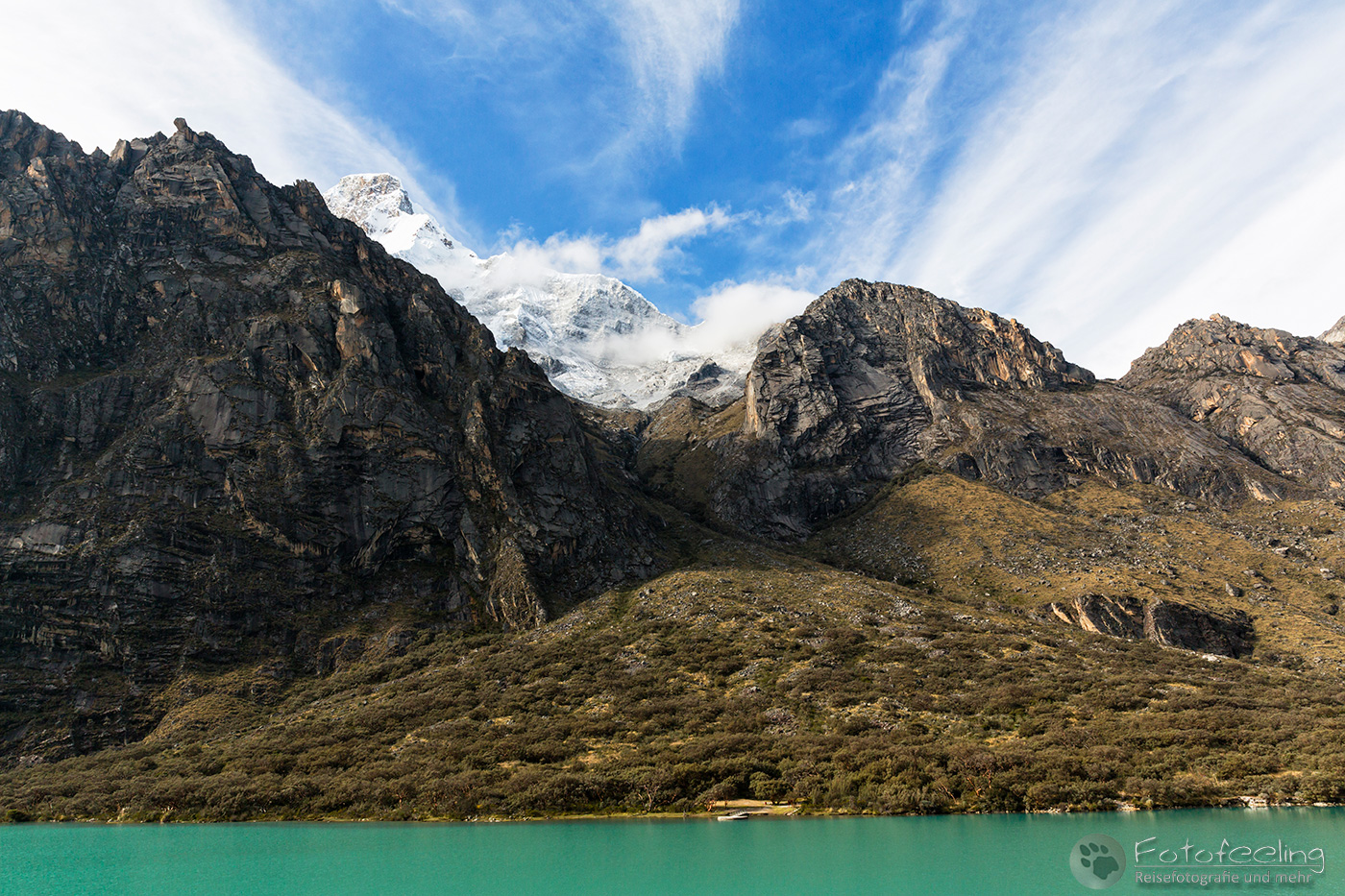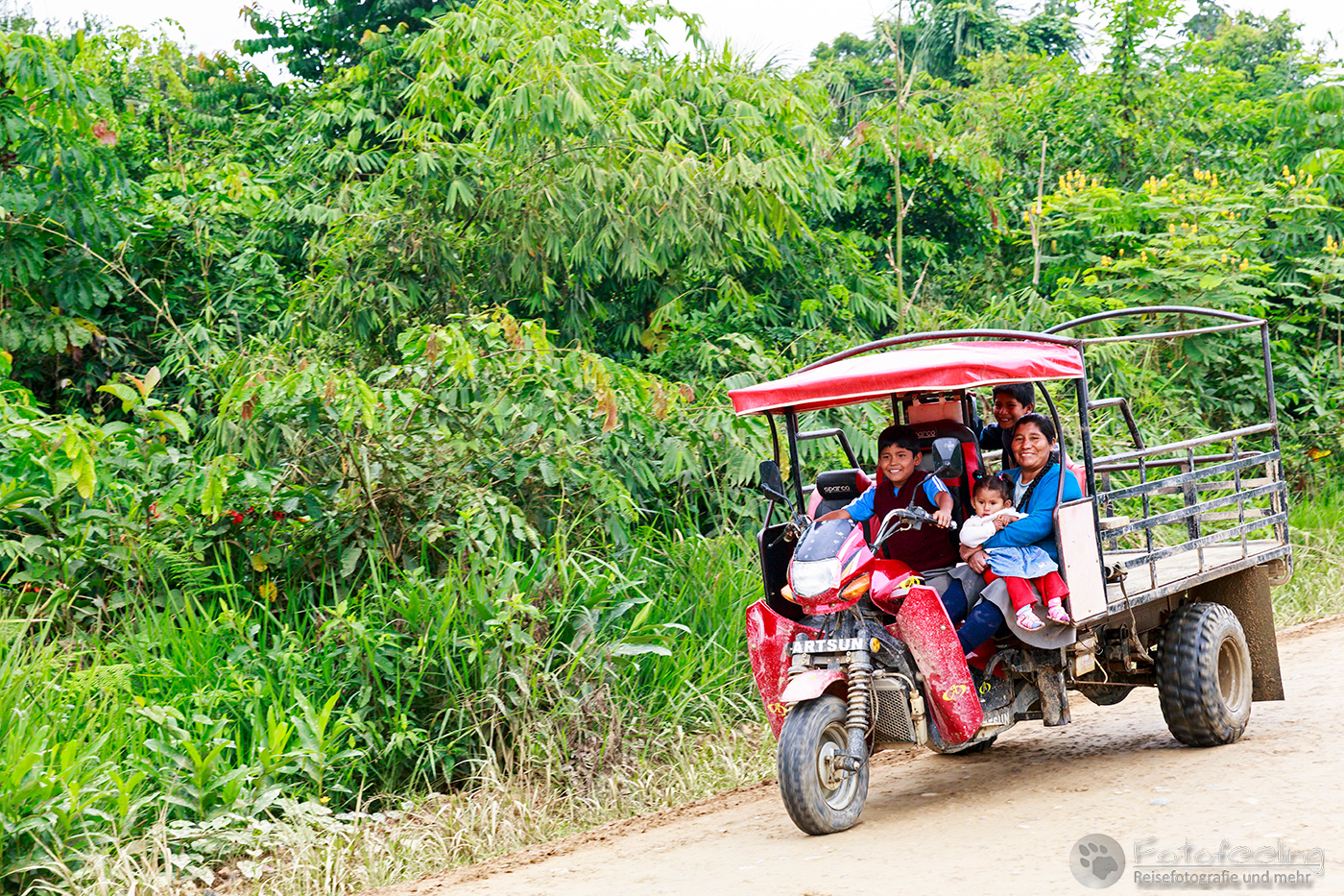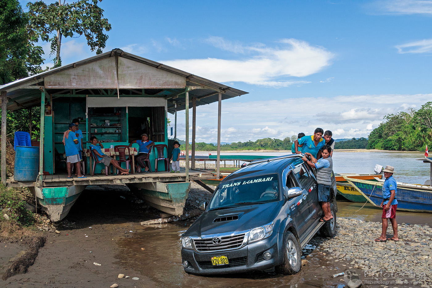 Kurze Autofahrt bis zum Fluss Urwaldpiste, Peru auf zum nächsten Boot Unser Boot steht bereit kurze Überfahrt über den Río Madre de Dios festgefahrenes Auto am Ufer Kurze Mittagspause in Quincemil kleine Kirche von Quincemil Quincemil mit seinem Wahrzeichen, den Aras neugierige Kinder besuchen uns Gipfel des Alcamarinayoc oder auch Allqamarinayuq, Peru Gipfel des Ausangate (Auzangate), Peru