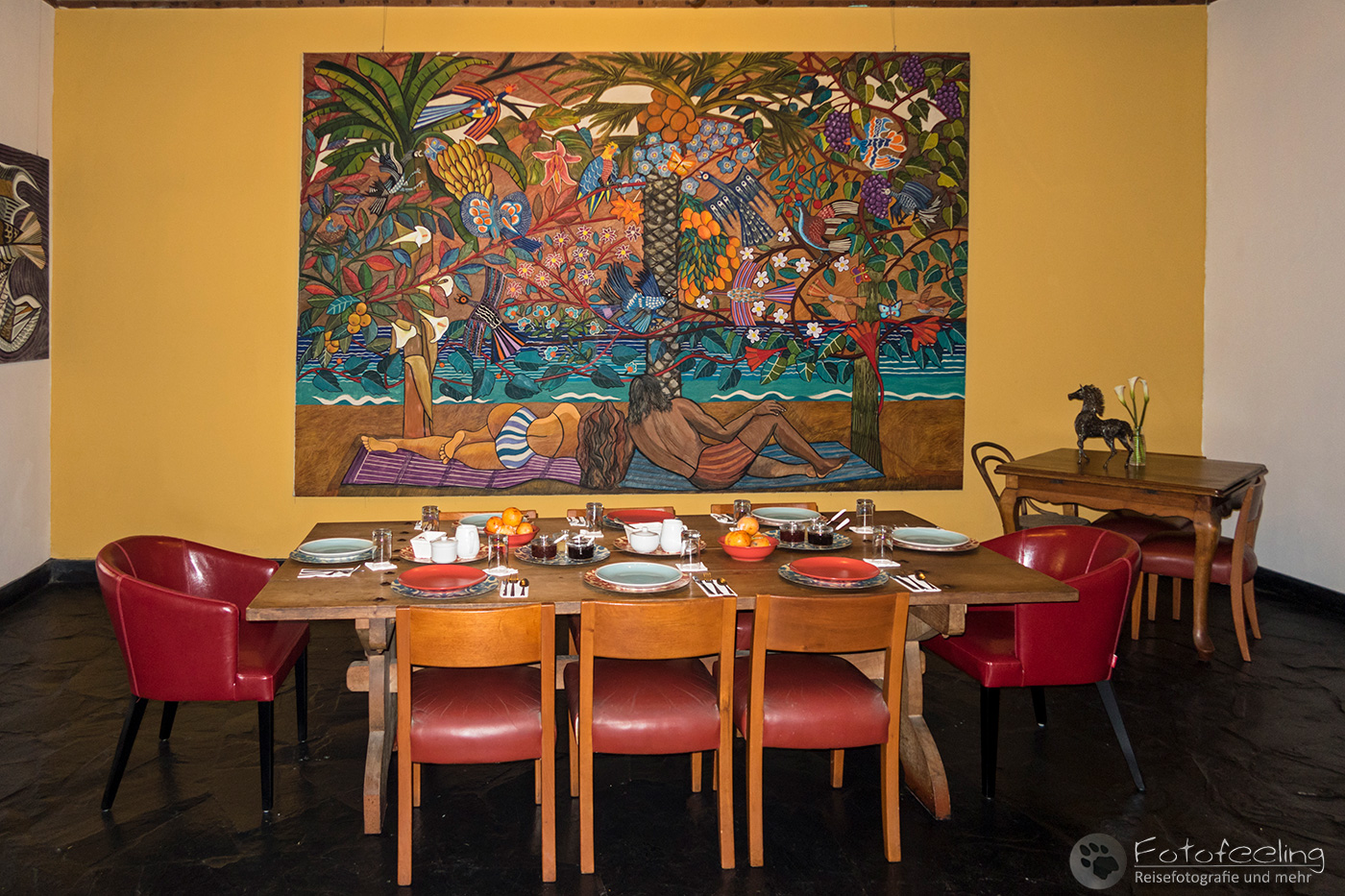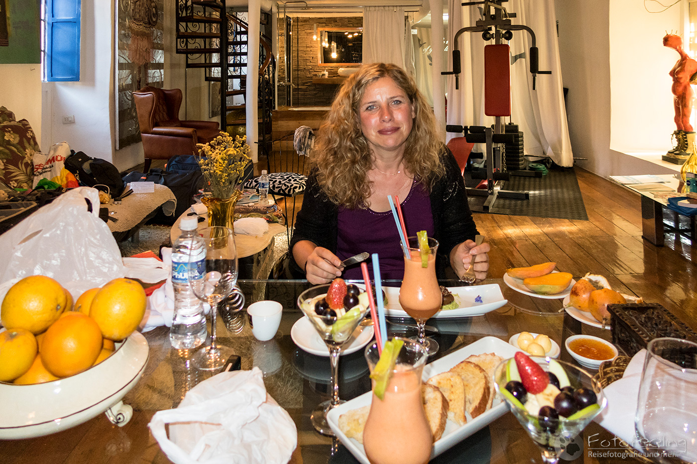 Um 9.00 Uhr waren wir zurück an der Unterkunft und bekamen unser Frühstück. Diesmal hatte Luis sich selbst übertroffen, denn es gab leckeren Kinoasaft, Eier mit Würstchen, Maniok und Avocado.