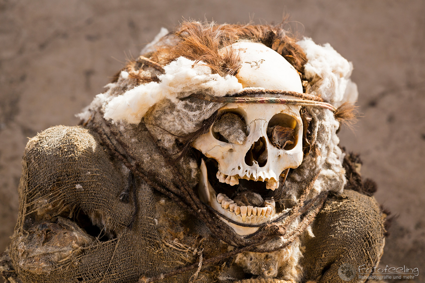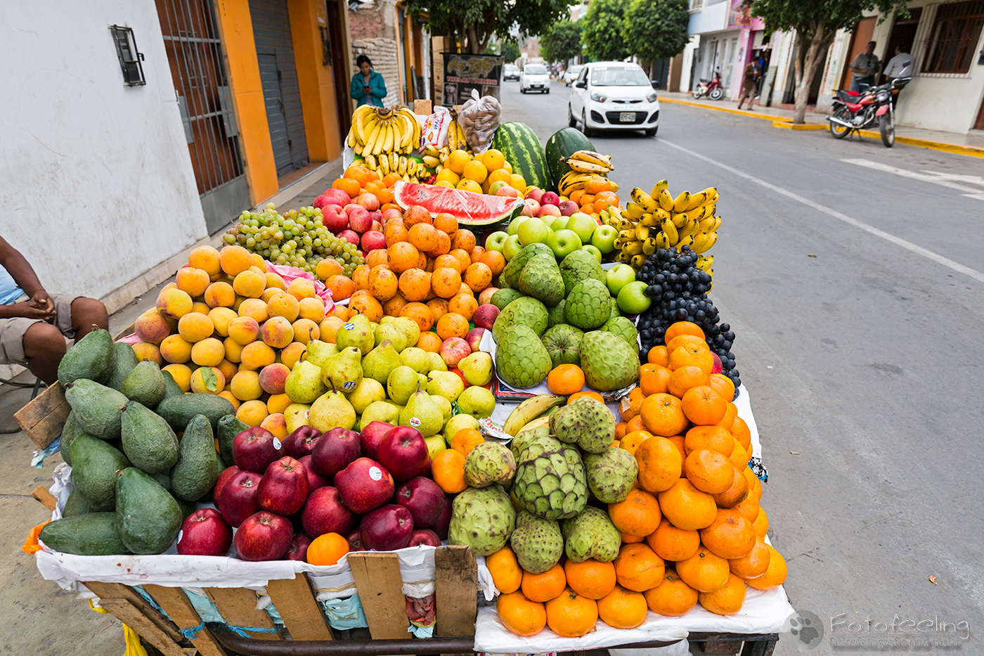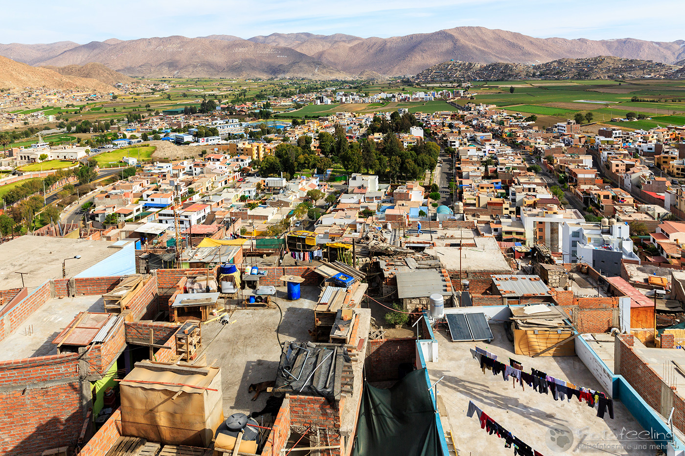 Zum Glück stand unser Auto auf einen bewachten Platz in einer Nebenstraße, denn die ganze Plaza de Armas war für den Verkehr gesperrt worden. So konnten wir ohne Probleme losfahren. Unser Ziel an diesem Vormittag war die Die Huaca de la Luna (Tempel des Mondes) im Moche-Tal. Sie ist eine Pyramide und besteht aus luftgetrockneten Lehmziegeln (Adobe). Sie befindet sich am Fuß des Berges Cerro Blanco und besteht aus vier durch Mauern und Plattformen miteinander verbundenen Pyramiden, die für vier verschiedene Bauphasen stehen (vom 3. bis zum 8. Jh. n. Chr.). Gegenüber ca. 500 m entfernt befindet sich die Sonnenpyramide (Huaca del Sol). Die Huaca de la Luna ist durch ihre farbigen Wandmalereien und Friese bekannt, die mythische Persönlichkeiten, Tiergestalten und anthropomorphe Wesen sowie Sonnen, Sterne, florale und abstrakte Motive zeigen. Man darf die Pyramide nur geführt besichtigen und so begleitete uns eine Studentin durch die beeindruckende vielschichtige Pyramide. Die Verzierungen und Farben waren wirklich wunderschön und zum Teil noch sehr gut erhalten. Wir waren richtig beeindruckt. Vorher hatten wir uns noch das Museum angeschaut, in dem tolle Fundstücke ausgestellt sind. Die Huaca de la Sol ist leider für den Besucher gesperrt und kann nur von außen besichtigt werden. Hier ist noch viel zu tun und zu erforschen und leider fehlt Peru bzw. der Region das Geld dazu. So verwittert sehr viel und manches kann nur spärlich mit Dächern geschützt werden.