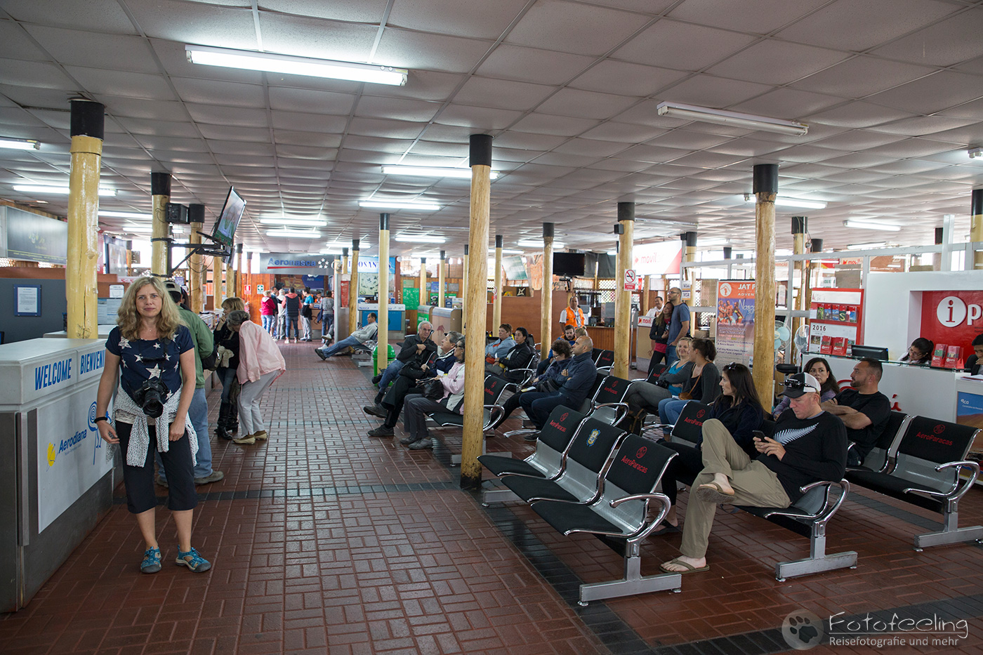 Die Einreise ging erstaunlich gut und schnell von statten. Nach 20 Minuten hatten wir unser Gepäck, die Passkontrolle war geschafft und auch der Zoll hatte uns passieren lassen. In einigen Reiseberichten hatte ich von einem Buzzer gelesen, den man drücken musste, aber den suchten wir vergeblich. Stattdessen gingen Männer mit Hunden am Gepäck entlang und einer schlug bei einer Frau an. Gespannt schauten wir, was sie denn dabei hatte. Nach einigem Hin und Her zog sie zwei dicke Orangen aus der Tasche und musste diese abgeben. Der Hund bekam eine Belohnung und zog weiter von Tasche zu Tasche.