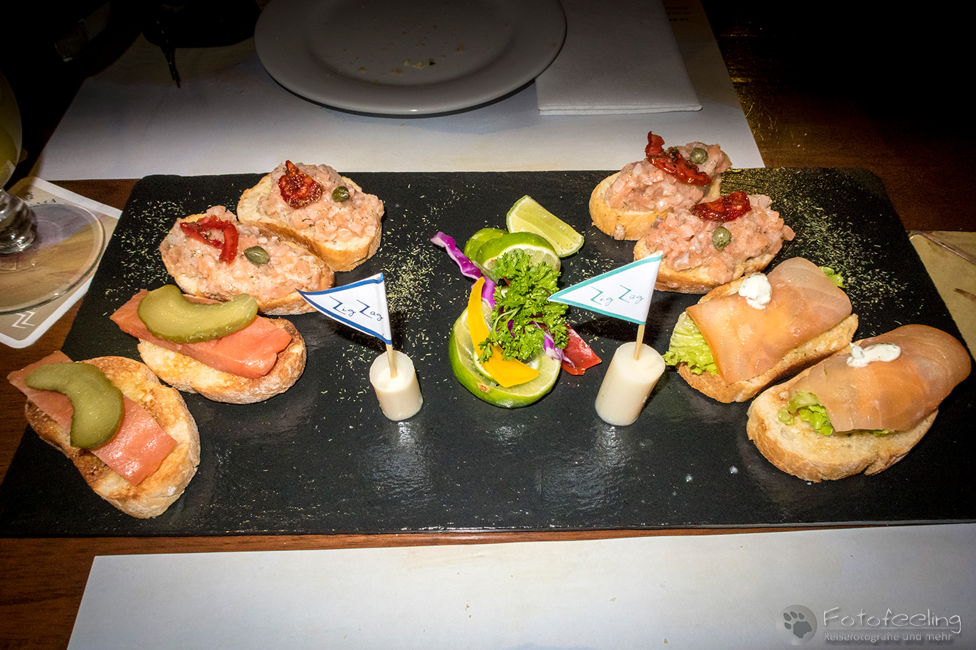 Für unser Abendessen hatten wir ja einen Tisch auf dem Balkon von El Celler de Cler reserviert. Der Tisch war total schön eingedeckt mit Kerze und die nette Kellnerin vom Vorabend begrüßte uns freudig. Wir kamen uns ein wenig wie VIPs vor, besonders als dann auch noch die Küchenchefin kam und uns beriet. Jedenfalls waren das Essen und der Service erstklassig und wir fühlten uns sauwohl. Hier wären wir gerne noch ein zweites Mal hingegangen. Aber auch so beendete das leckere Essen den schönen Tag perfekt.