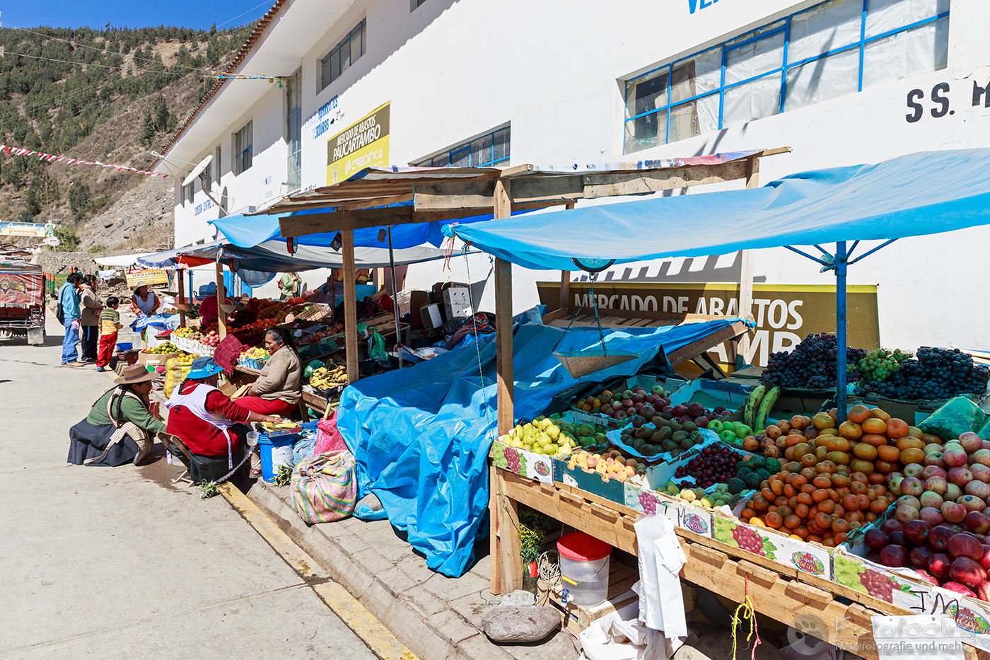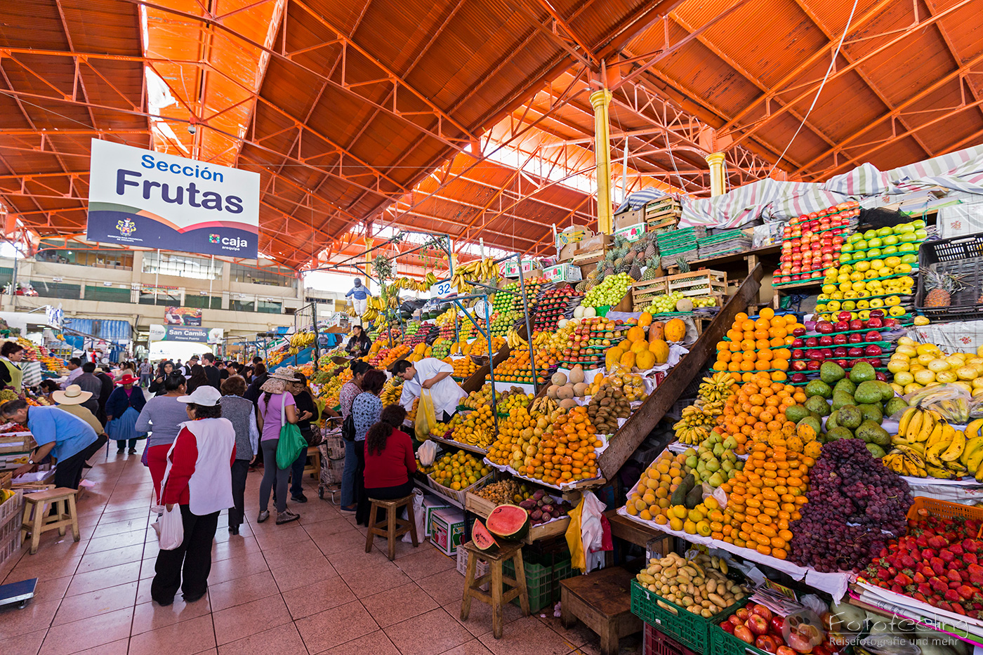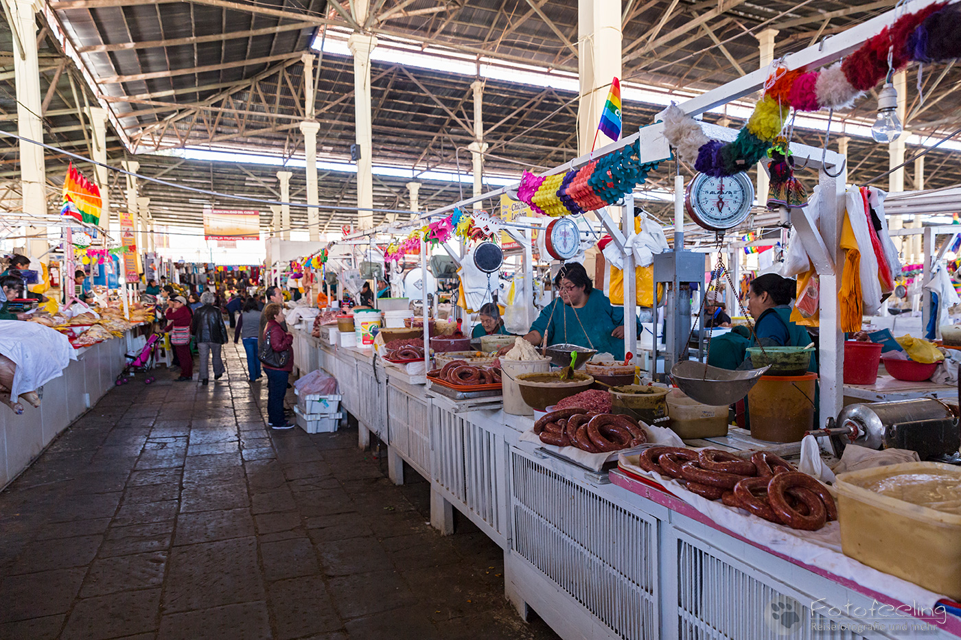 Wir wanderten weiter durch die Stadt und gelangten zum Mercado Central de San Pedro. Hierher gehen vor allem die Einheimischen und man bekommt wirklich alles, von frischen Fleischwaren, Brot, Obst und Gemüse, Klamotten, Blumen und vieles mehr. Selbst frisch gebratene Meerschweinchen wurden angeboten. Es war faszinierend, diese Vielfalt zu betrachten und auch die verschiedenen Gerüche, wobei ich nicht durch die Fleischstände gehen konnte, denn hier roch es verstärkt nach frischem Blut und das ging auch am späten Vormittag noch gar nicht. Christian hatte damit gar keine Probleme und schlenderte sichtlich angetan durch die Stände.