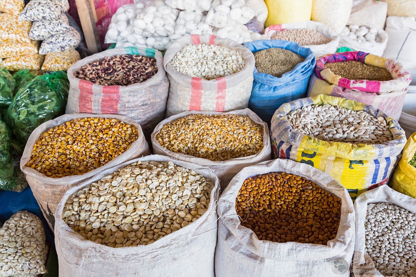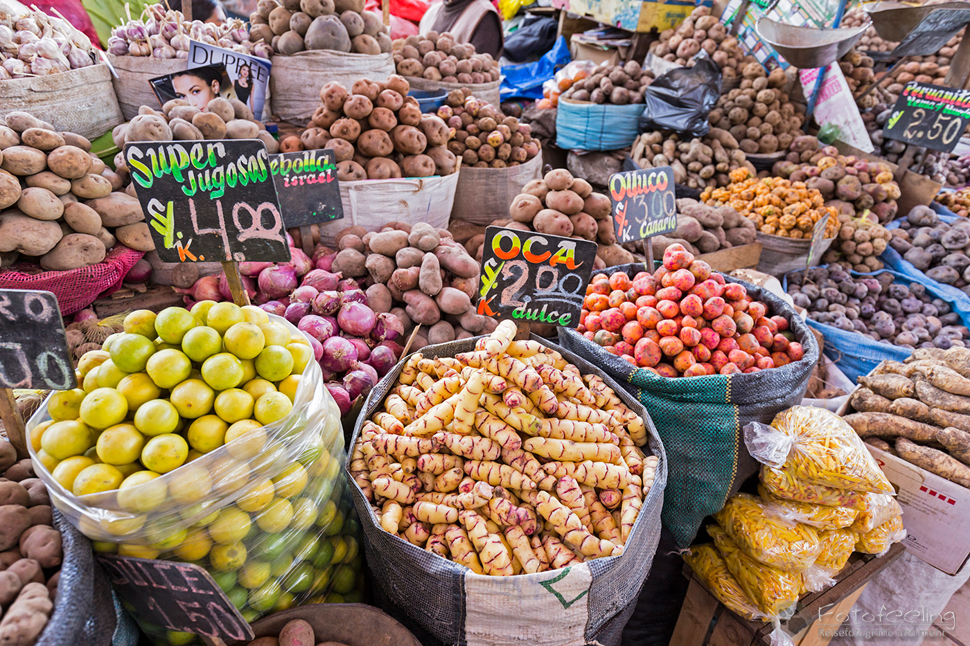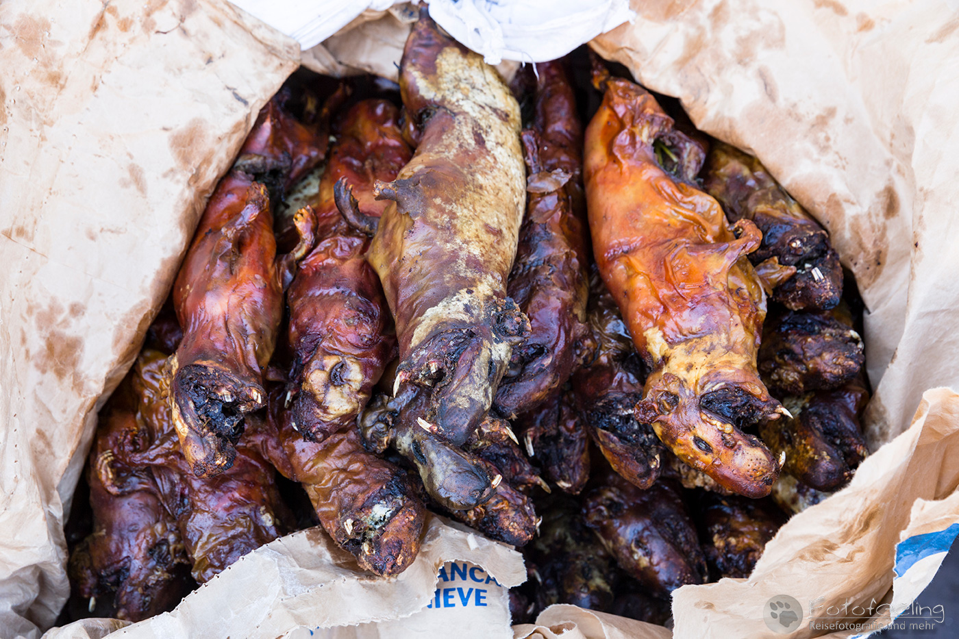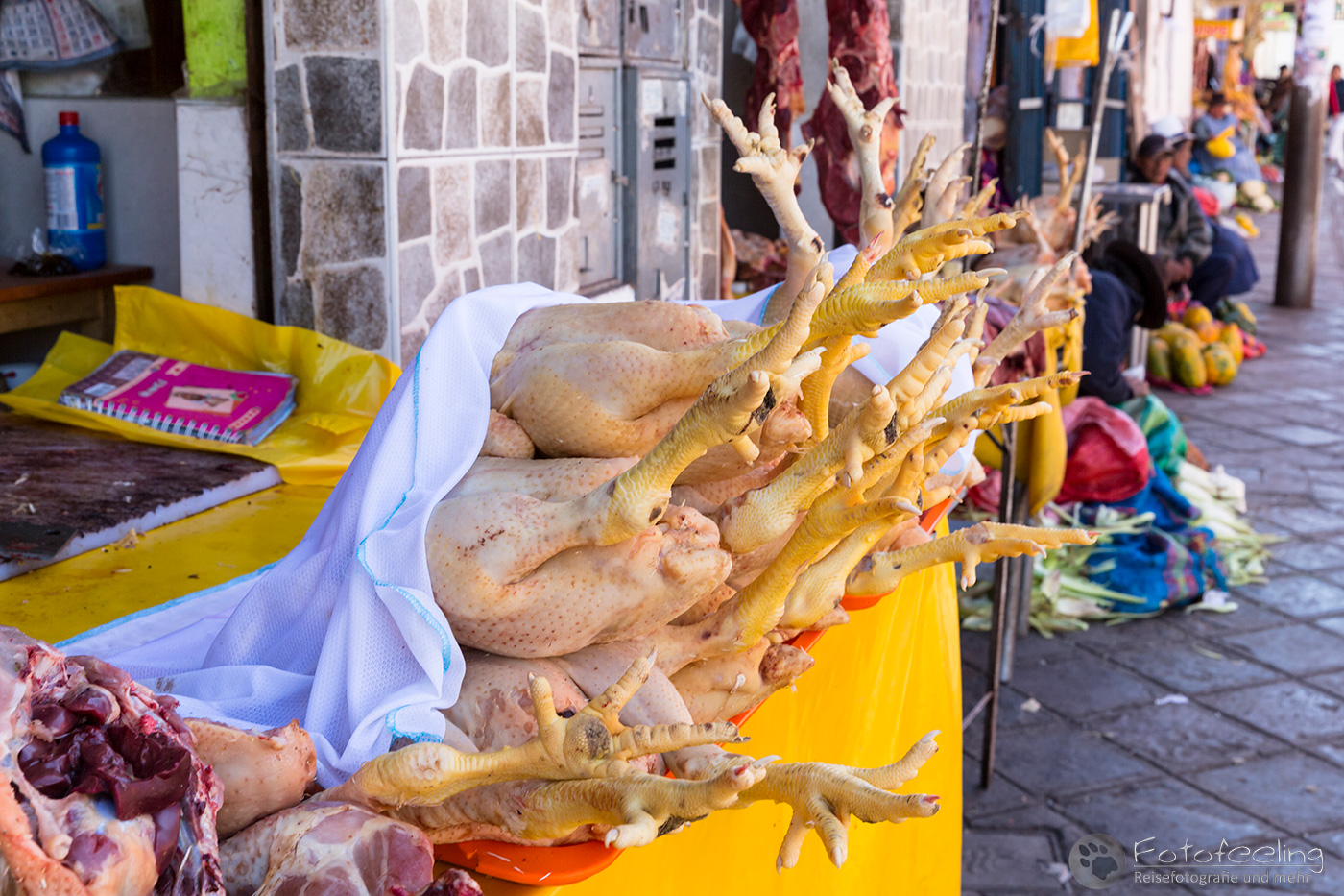 Fleischabteilung des Mercado Central de San Pedro, Cusco Blumen im Mercado Central de San Pedro Verschiedene Bohnen- und Hülsenfrüchte, Mercado Central de San Pedro Gebratene Meerschweinchen, Mercado Central de San Pedro, Cusco Fleischabteilung des Mercado Central de San Pedro, Cusco Purpur-Mais, Mercado Central de San Pedro frisch geschlachtete Hühner werden auf der Strasse verkauft Obststand in Cusco