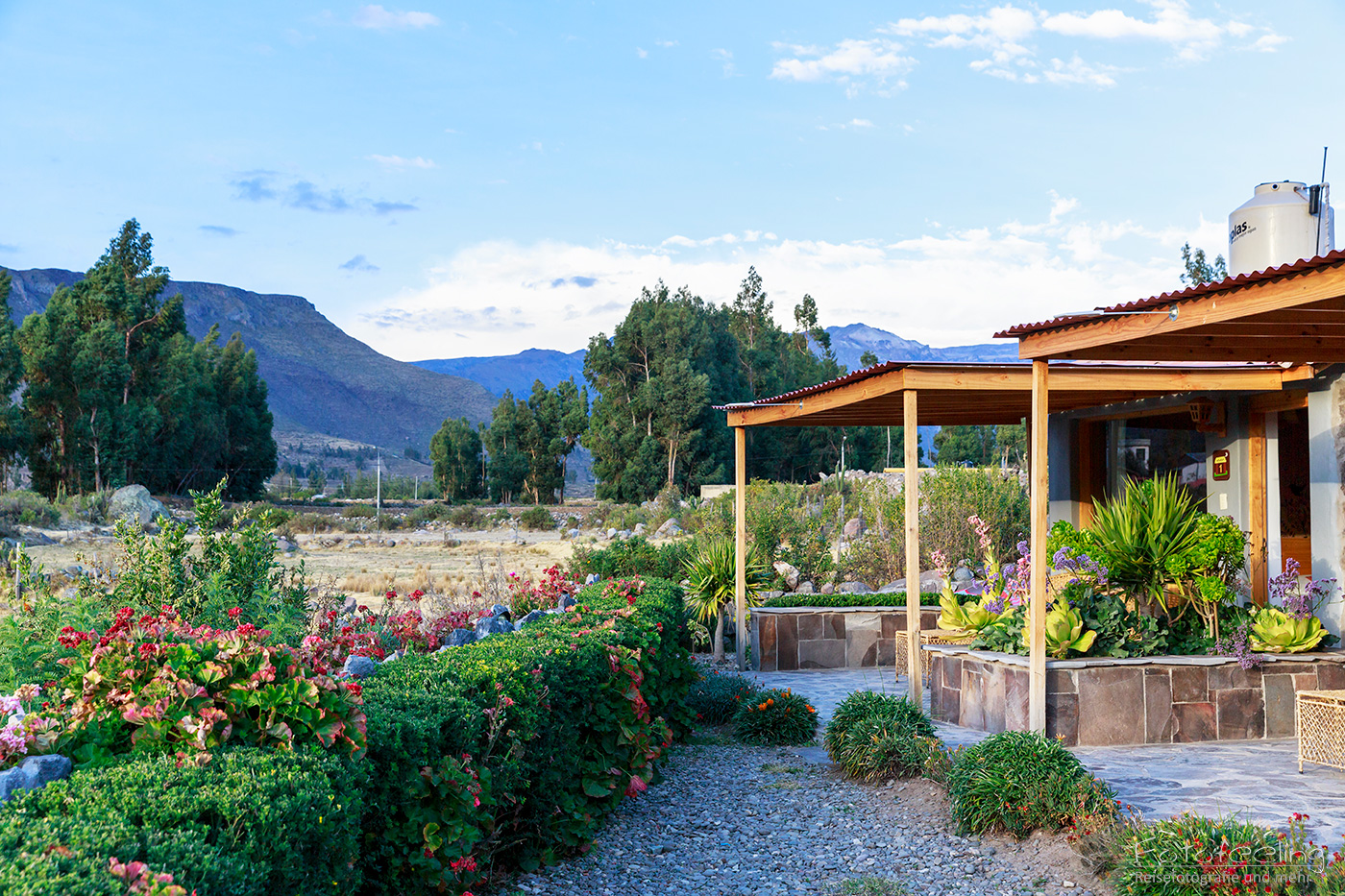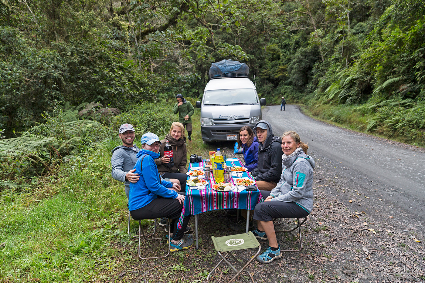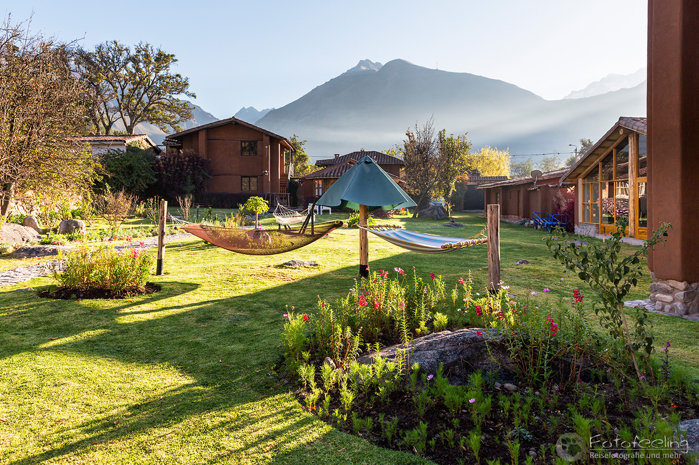 An diesem Morgen wurden wir durch schönsten Sonnenschein geweckt. Nebel hing in den Bergen und zauberte eine grandiose Stimmung. Die Lamas lagen wieder verträumt auf dem Rasen und Vögel zwitscherten. Ein Kolibri sauste um die Blumen herum und tauchte mit dem Schnabel in die Blüten ein.
