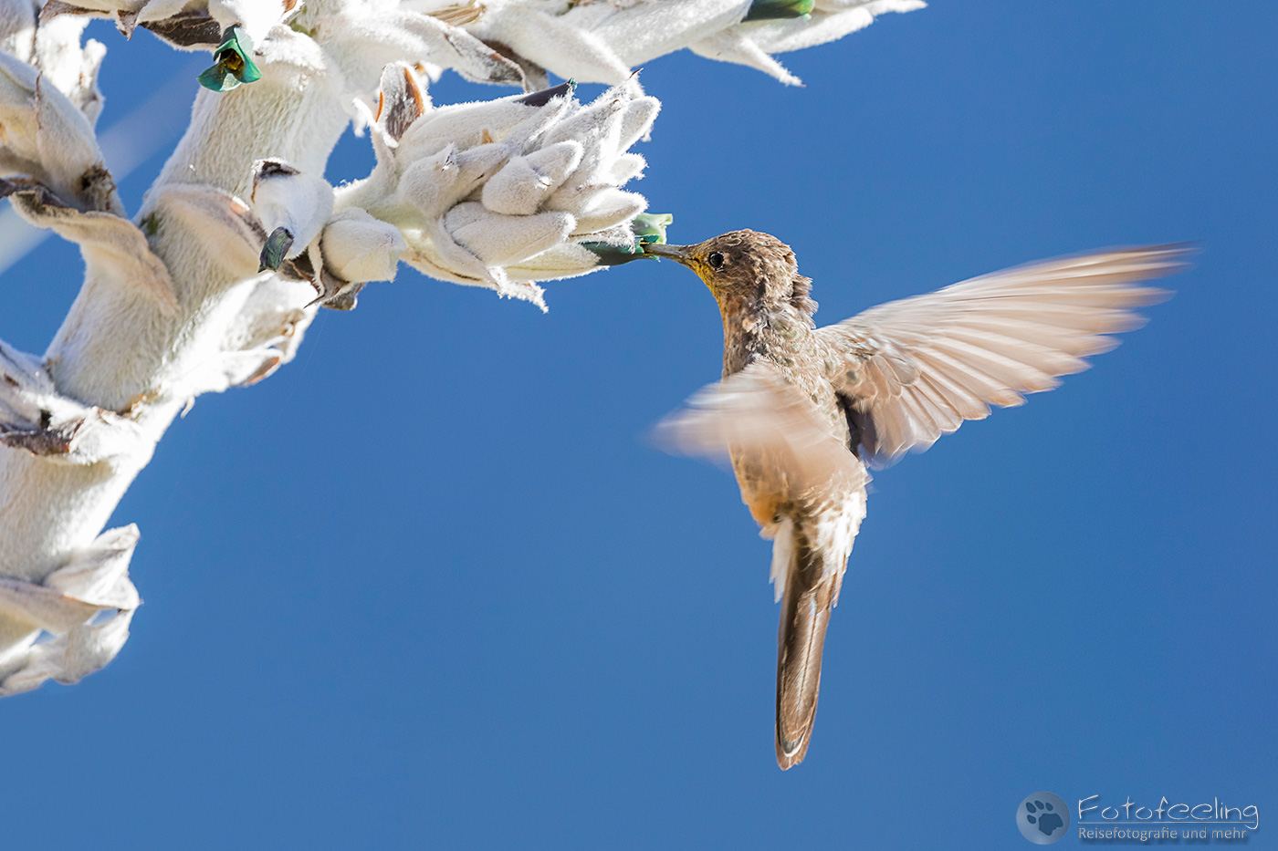 Ich las auf der Terrasse, während Chris mit der Kamera auf Kolibri-Jagd ging. Die kleinen flotten Vögel umschwirrten die Blüten der Pflanzen hier, doch sie waren so schnell, dass es wirklich eine Herausforderung war. Einige der Kolibris waren so klein, dass ich sie anfangs für Hummelschwärmer hielt.