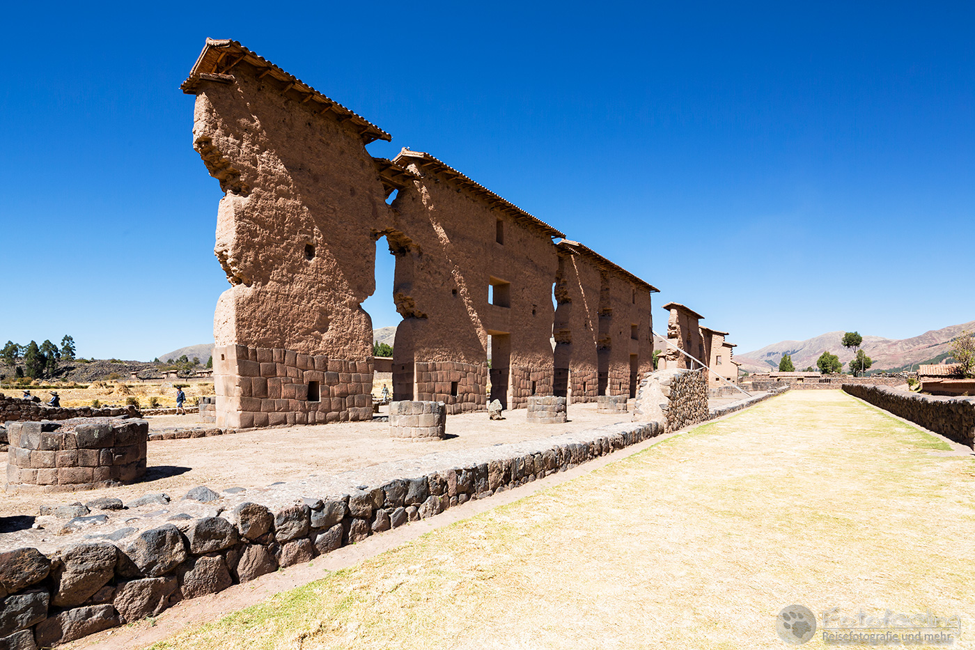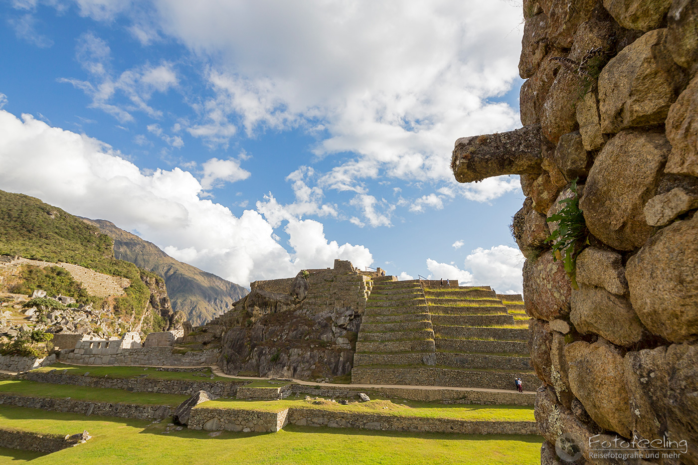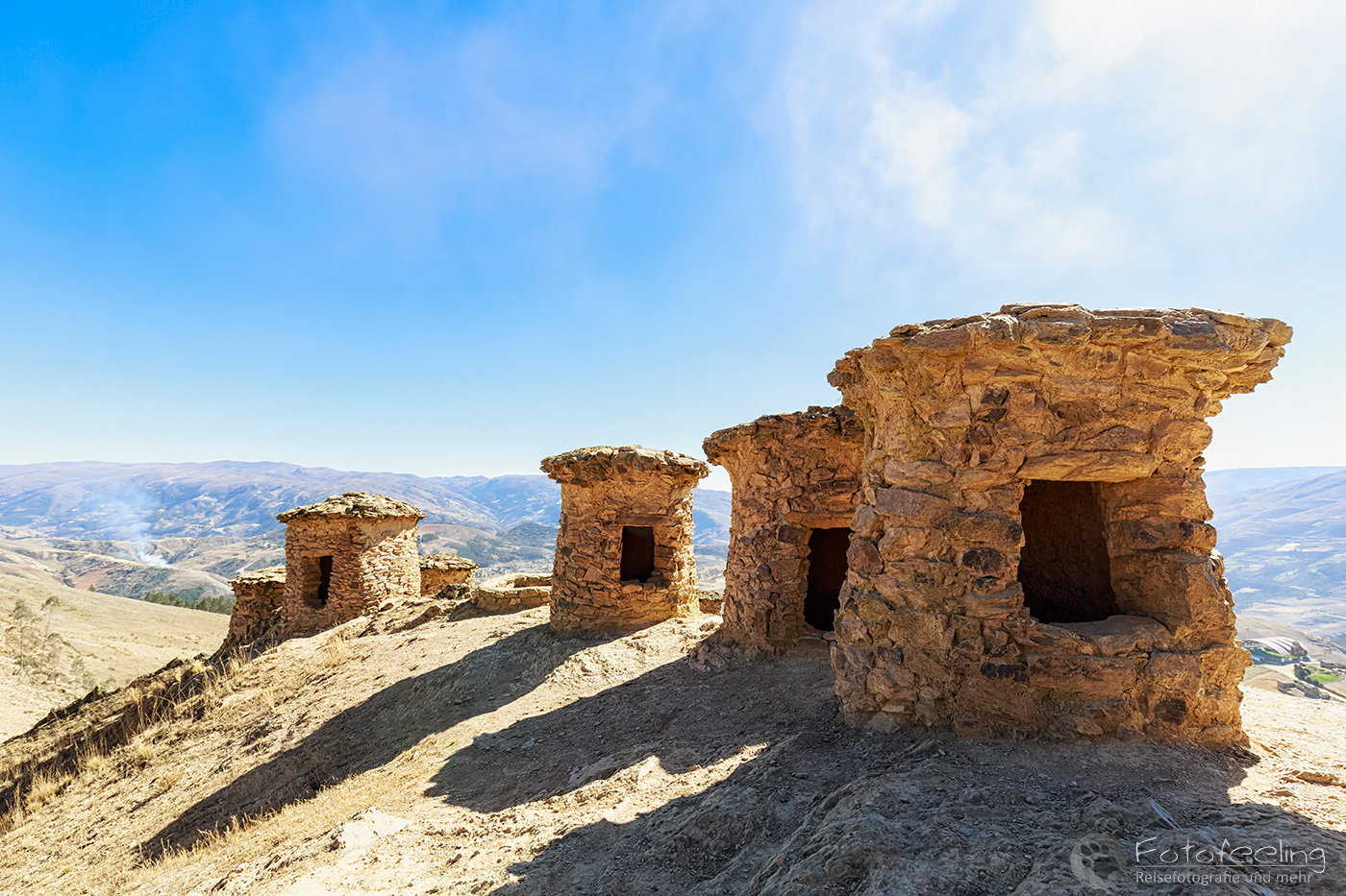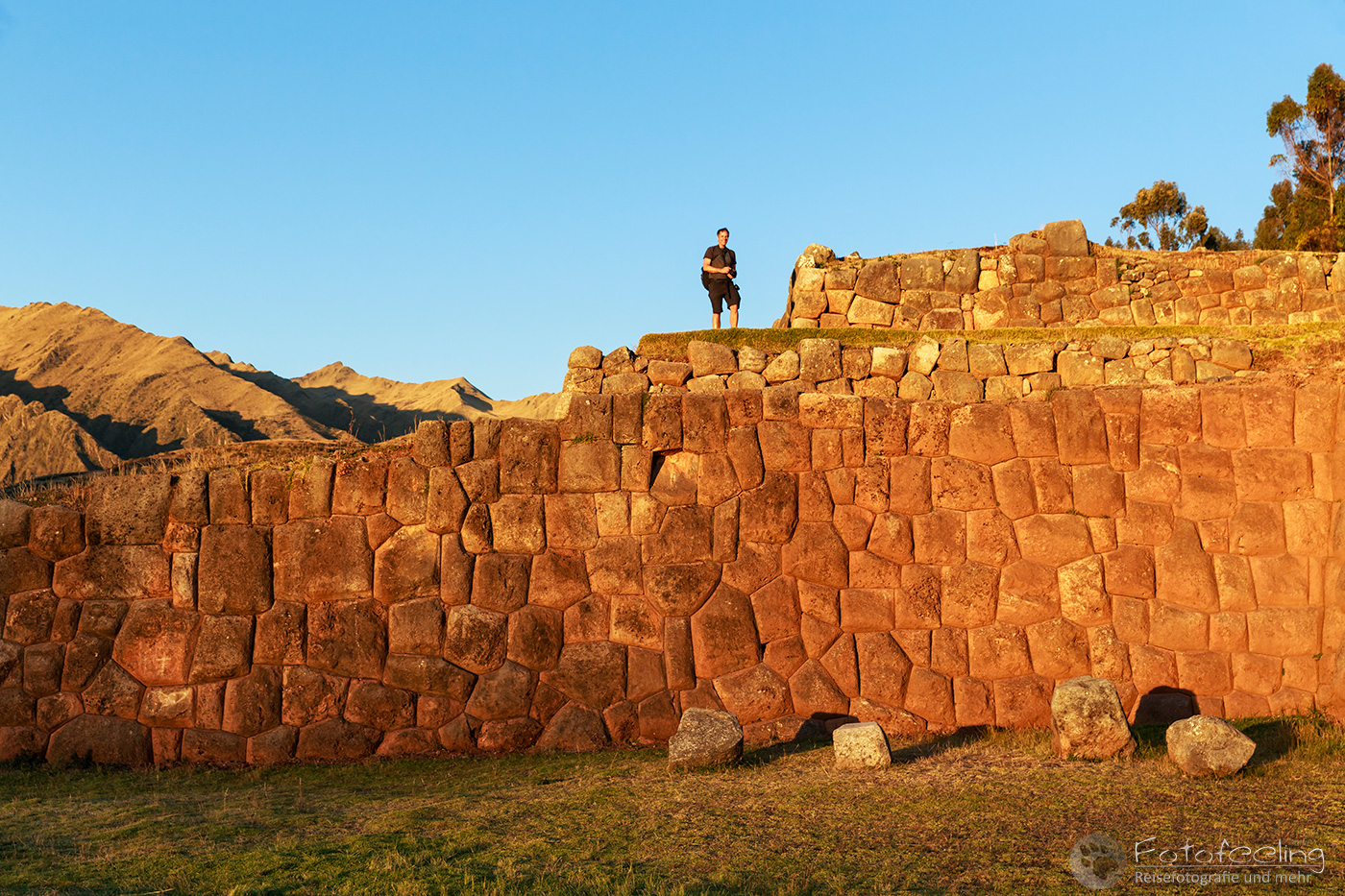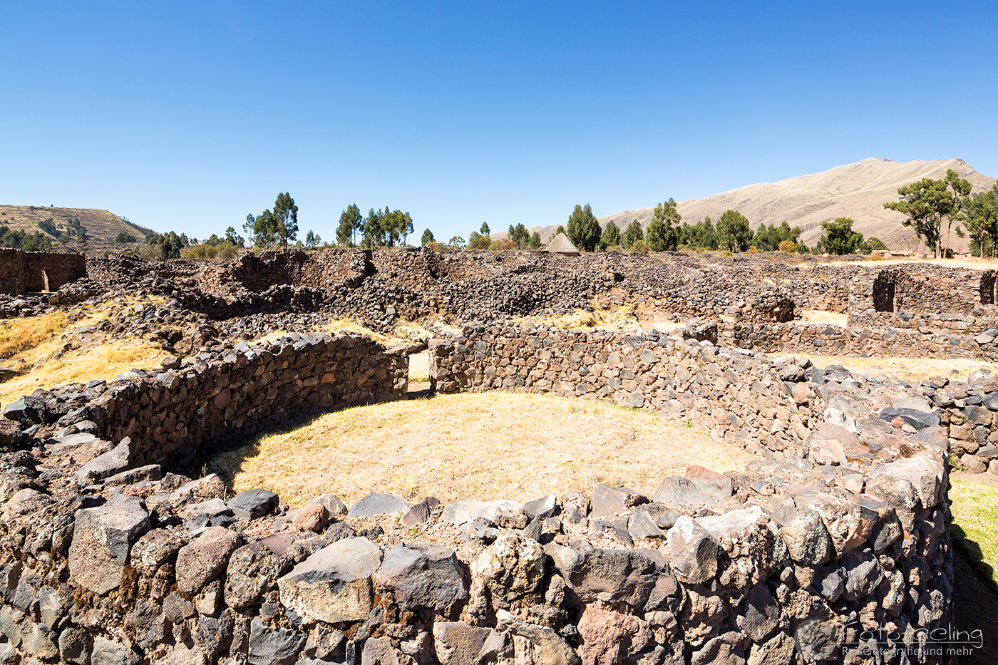 Zuerst erkundeten wir die obere Ebene, in der der Torreón über den Felsen thront mit dem Sector del Castillo. Von hier oben hatten wir eine eindrucksvolle Aussicht in die umliegenden Täler. Danach eroberten wir die untere Ebene mit ihren verwunschenen Rundhütten, in deren Mitte Lamas grasten. Begeistert wanderten wir bis zum Templo Mayor und unsere Kameras glühten. Noch immer waren wir alleine und erst nach und nach kamen einige Touristengruppen. Hatten wir noch Narrenfreiheit, wurden jetzt die Wächter aktiver und wiesen die Menschen immer wieder zurück auf die Wege.