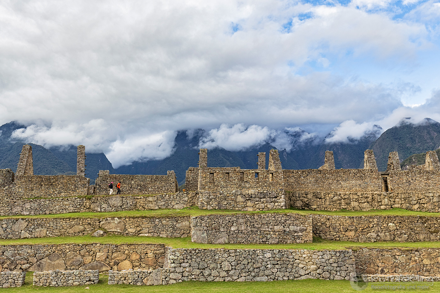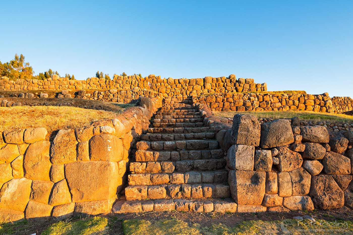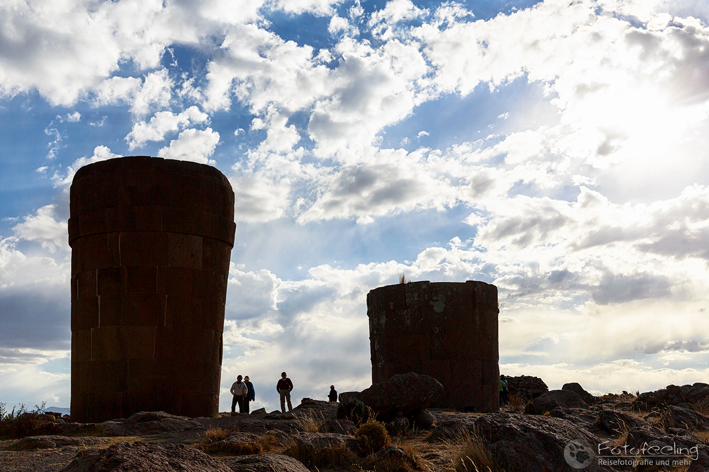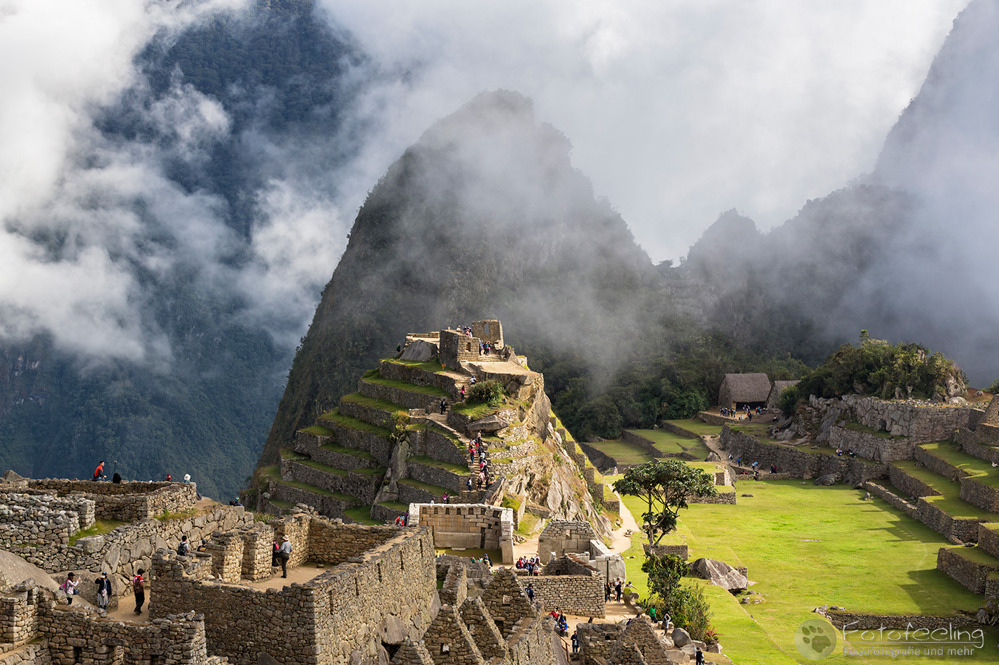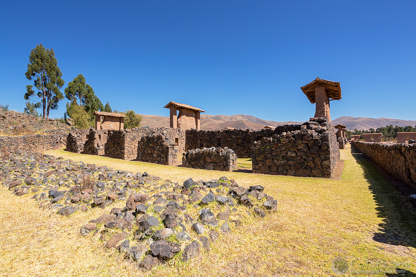 Zuerst erkundeten wir die obere Ebene, in der der Torreón über den Felsen thront mit dem Sector del Castillo. Von hier oben hatten wir eine eindrucksvolle Aussicht in die umliegenden Täler. Danach eroberten wir die untere Ebene mit ihren verwunschenen Rundhütten, in deren Mitte Lamas grasten. Begeistert wanderten wir bis zum Templo Mayor und unsere Kameras glühten. Noch immer waren wir alleine und erst nach und nach kamen einige Touristengruppen. Hatten wir noch Narrenfreiheit, wurden jetzt die Wächter aktiver und wiesen die Menschen immer wieder zurück auf die Wege.