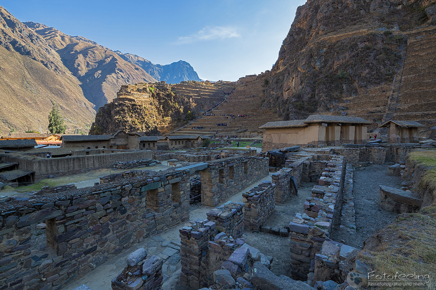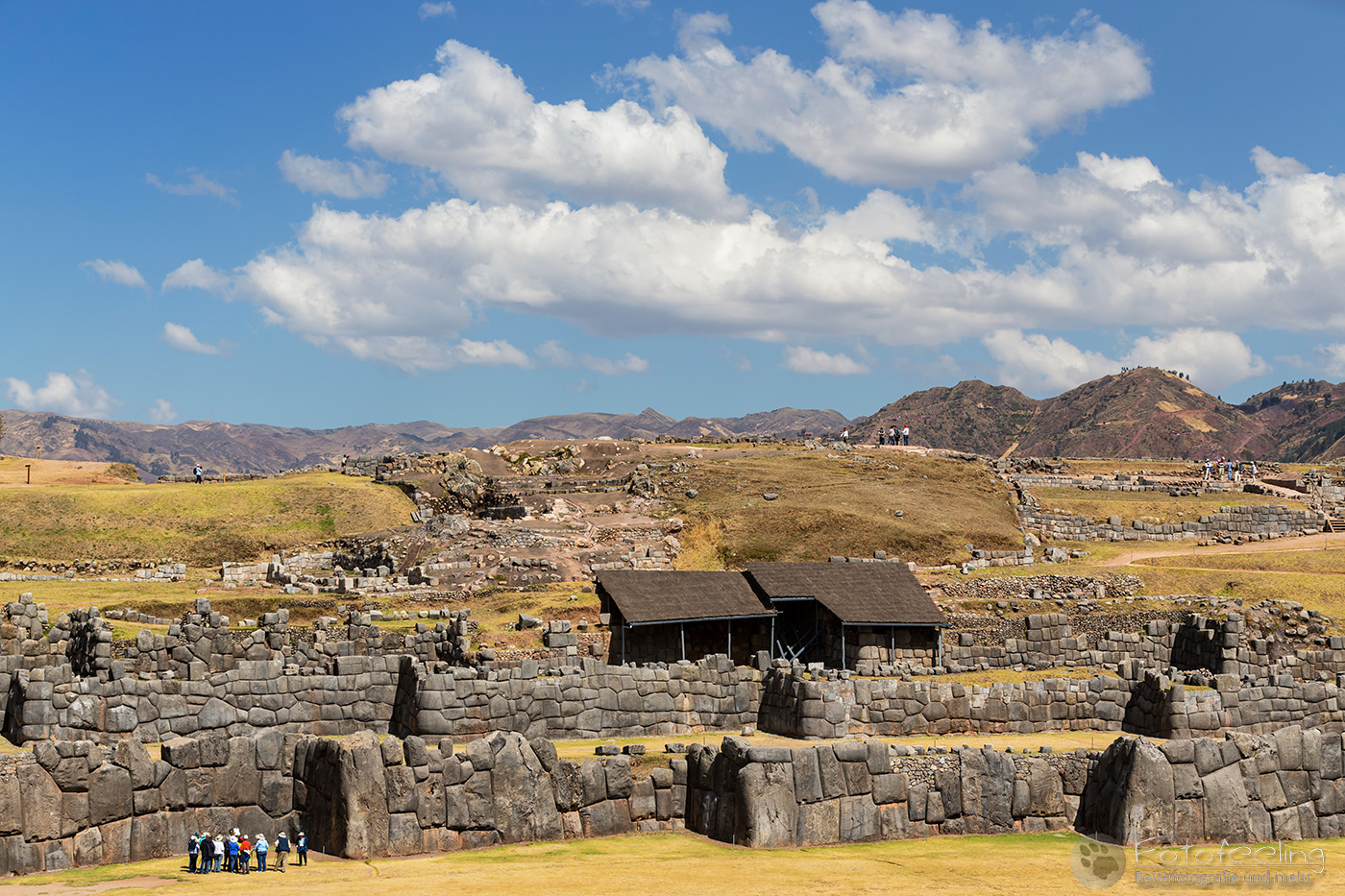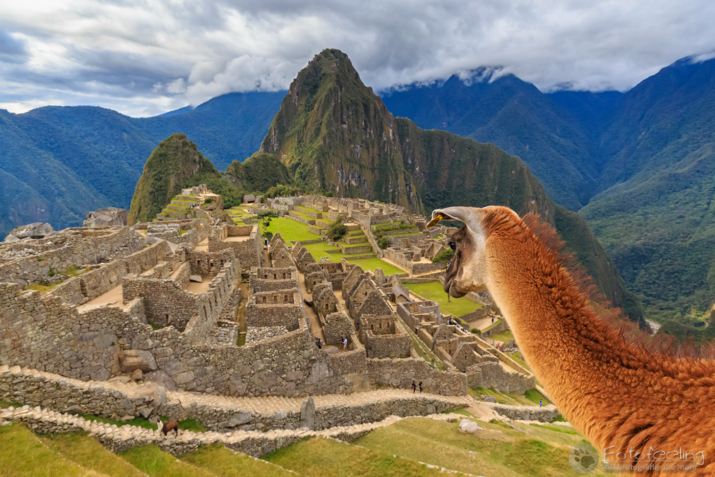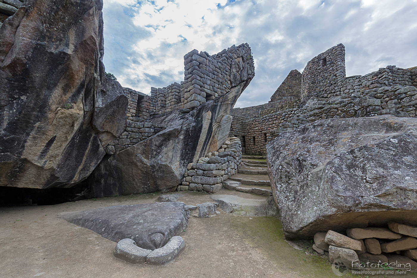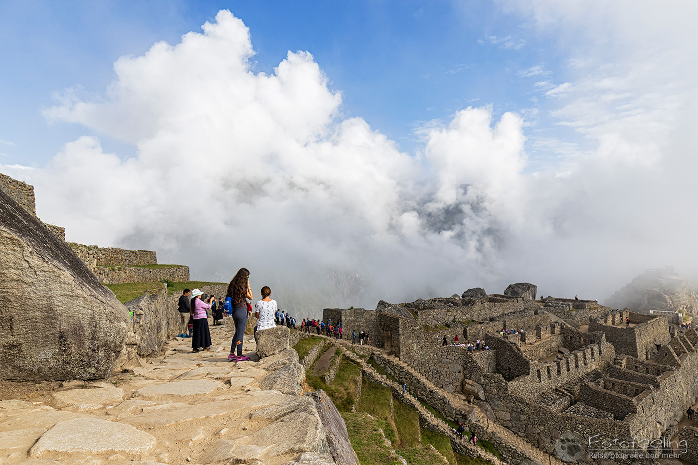 Zuerst erkundeten wir die obere Ebene, in der der Torreón über den Felsen thront mit dem Sector del Castillo. Von hier oben hatten wir eine eindrucksvolle Aussicht in die umliegenden Täler. Danach eroberten wir die untere Ebene mit ihren verwunschenen Rundhütten, in deren Mitte Lamas grasten. Begeistert wanderten wir bis zum Templo Mayor und unsere Kameras glühten. Noch immer waren wir alleine und erst nach und nach kamen einige Touristengruppen. Hatten wir noch Narrenfreiheit, wurden jetzt die Wächter aktiver und wiesen die Menschen immer wieder zurück auf die Wege.