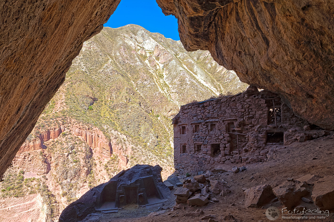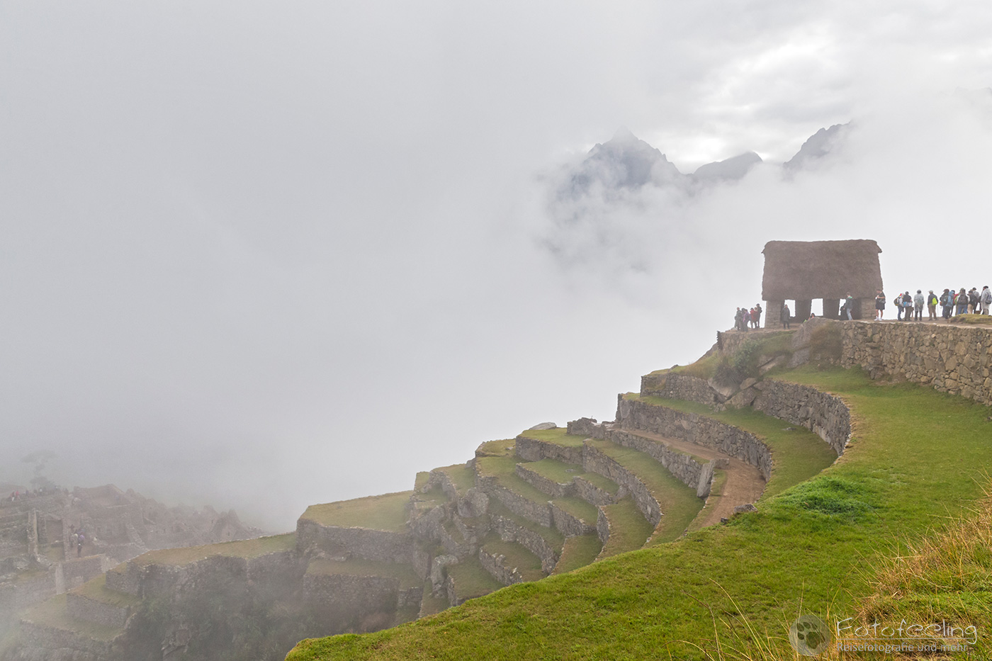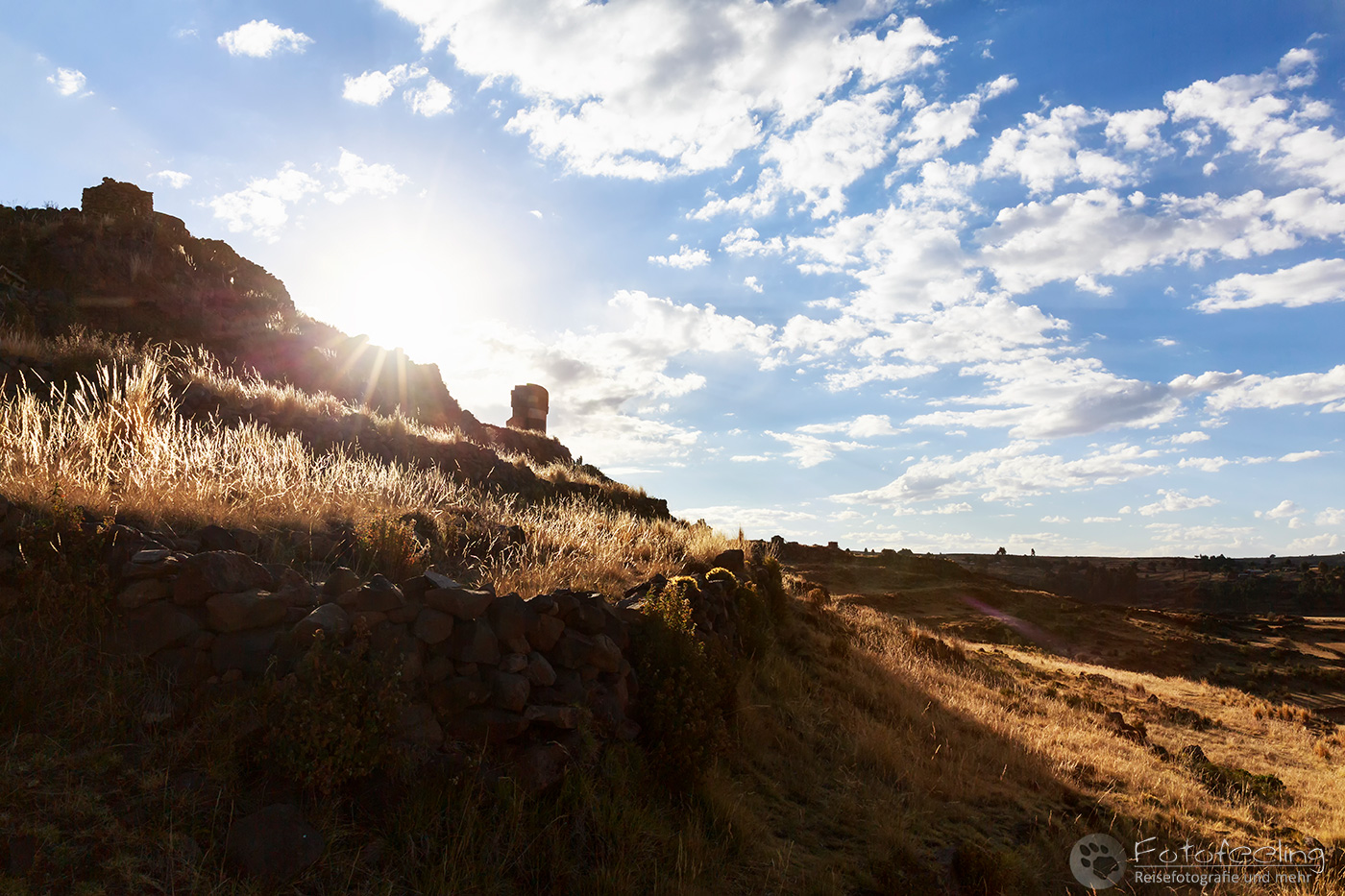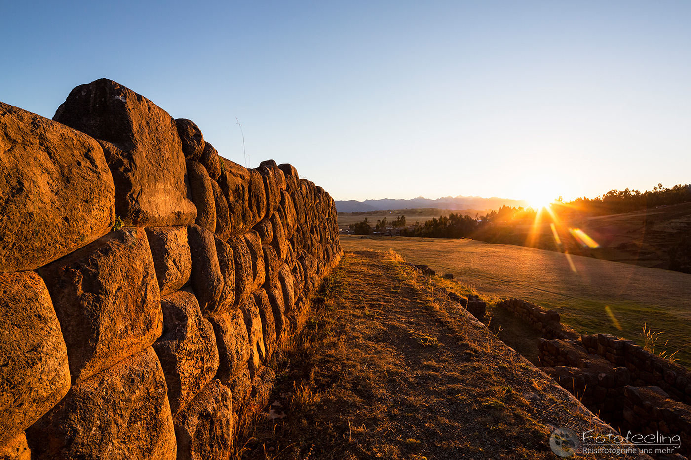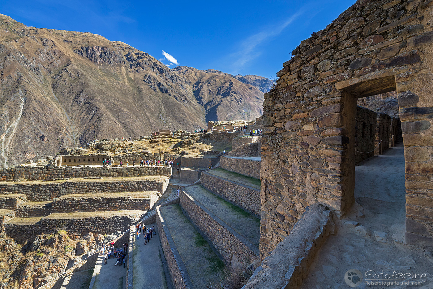Zuerst erkundeten wir die obere Ebene, in der der Torreón über den Felsen thront mit dem Sector del Castillo. Von hier oben hatten wir eine eindrucksvolle Aussicht in die umliegenden Täler. Danach eroberten wir die untere Ebene mit ihren verwunschenen Rundhütten, in deren Mitte Lamas grasten. Begeistert wanderten wir bis zum Templo Mayor und unsere Kameras glühten. Noch immer waren wir alleine und erst nach und nach kamen einige Touristengruppen. Hatten wir noch Narrenfreiheit, wurden jetzt die Wächter aktiver und wiesen die Menschen immer wieder zurück auf die Wege.