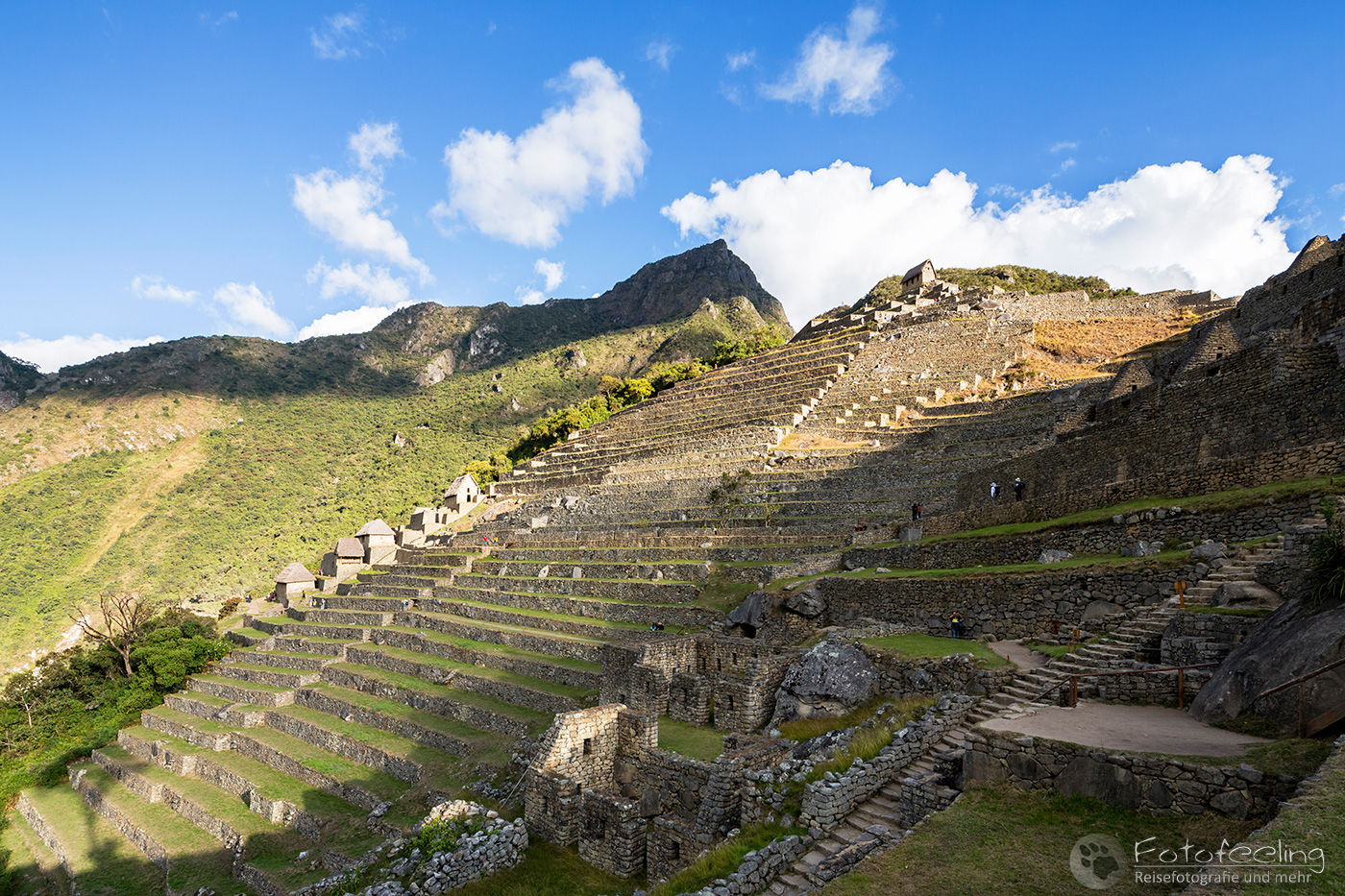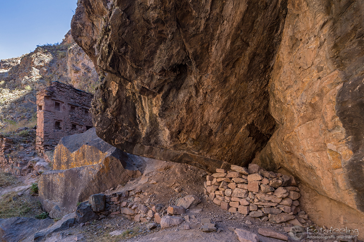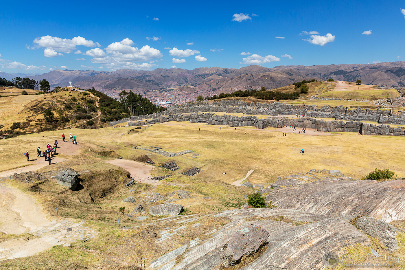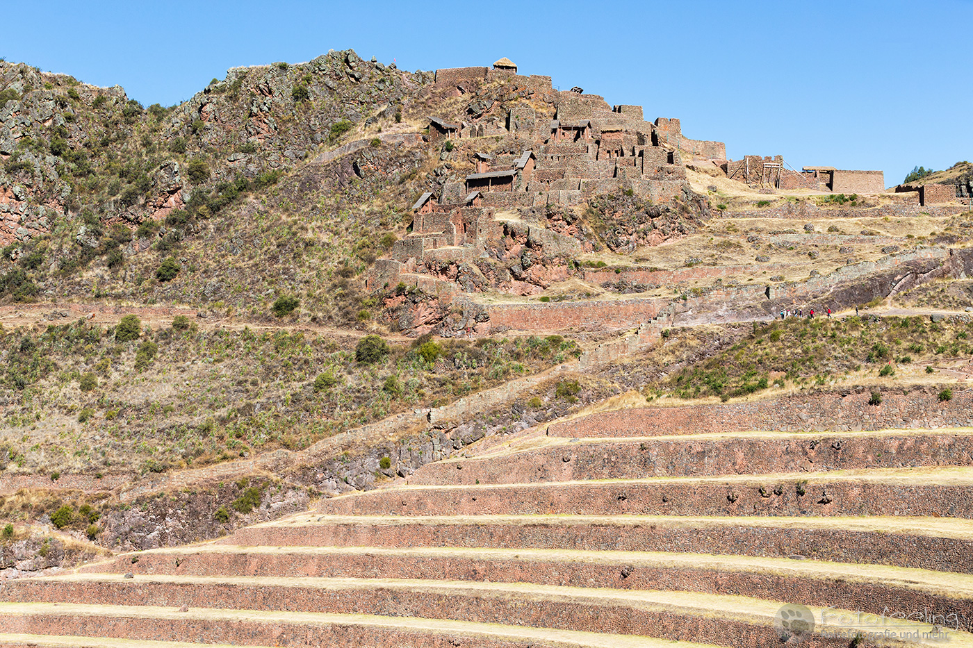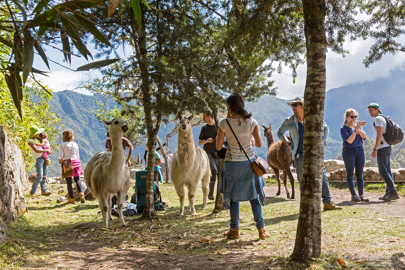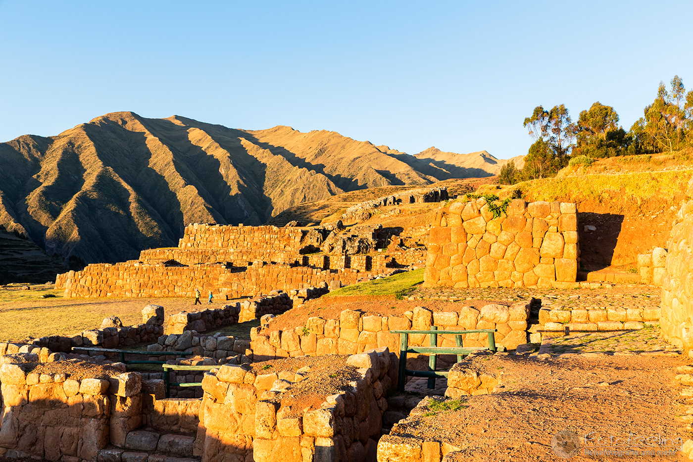 Zuerst erkundeten wir die obere Ebene, in der der Torreón über den Felsen thront mit dem Sector del Castillo. Von hier oben hatten wir eine eindrucksvolle Aussicht in die umliegenden Täler. Danach eroberten wir die untere Ebene mit ihren verwunschenen Rundhütten, in deren Mitte Lamas grasten. Begeistert wanderten wir bis zum Templo Mayor und unsere Kameras glühten. Noch immer waren wir alleine und erst nach und nach kamen einige Touristengruppen. Hatten wir noch Narrenfreiheit, wurden jetzt die Wächter aktiver und wiesen die Menschen immer wieder zurück auf die Wege.