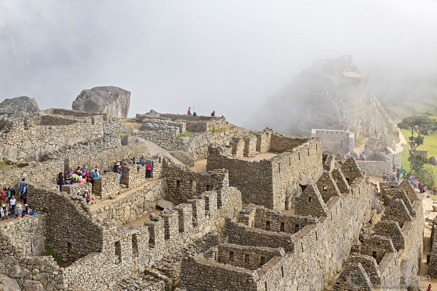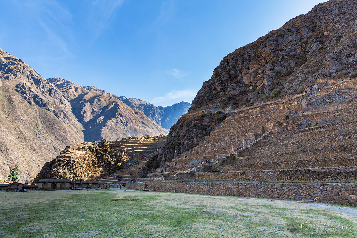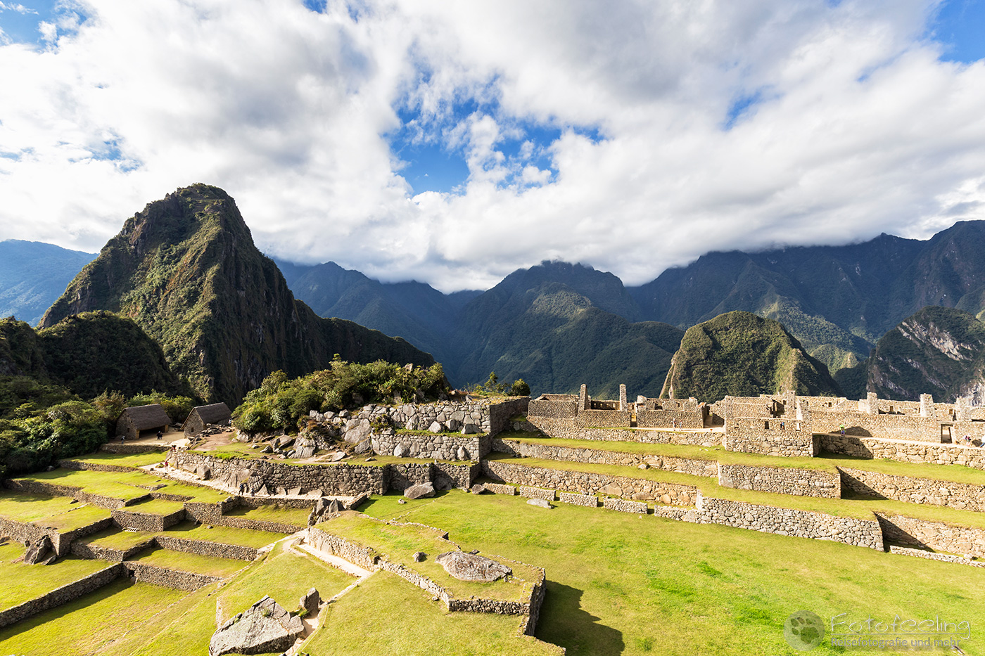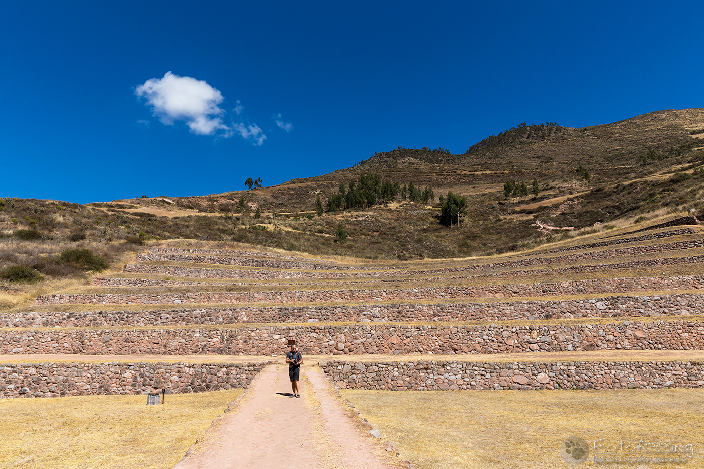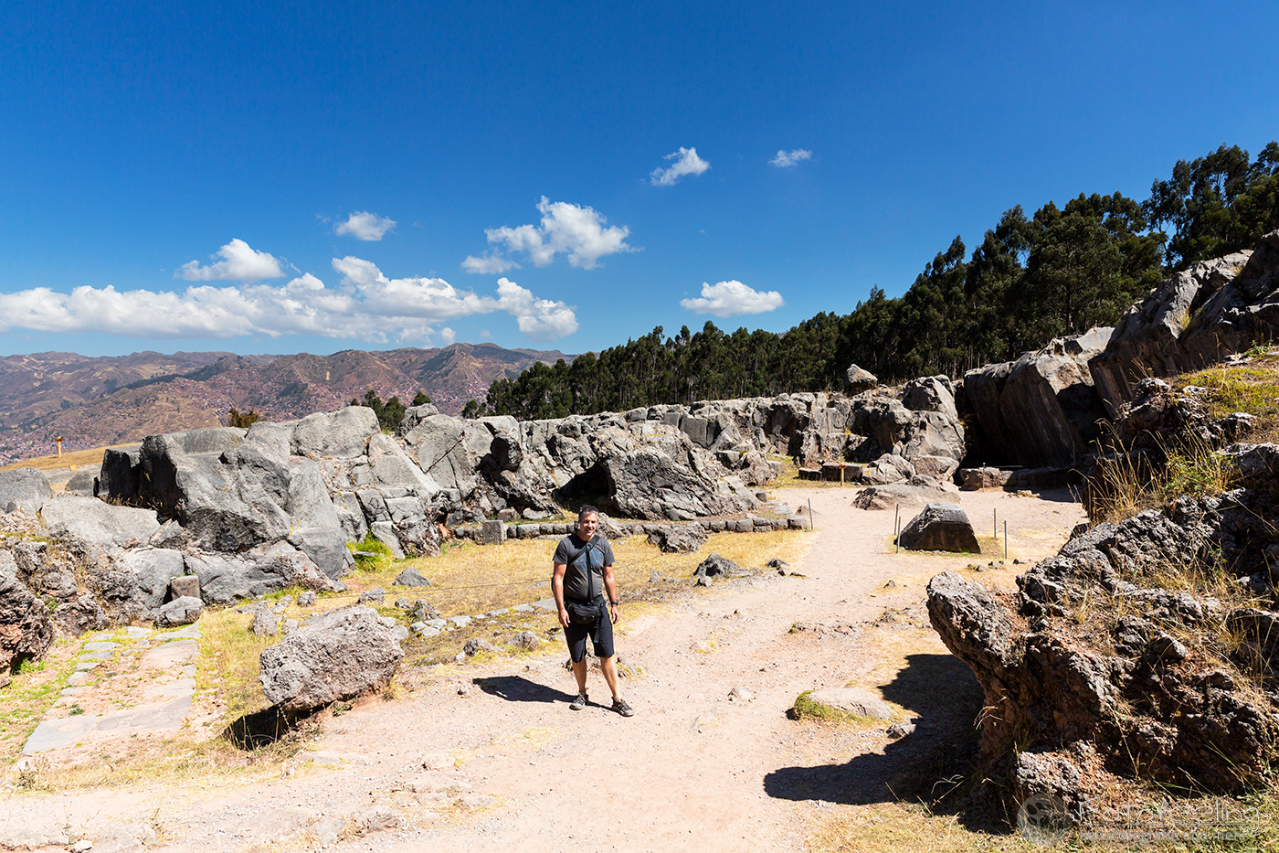 Zuerst erkundeten wir die obere Ebene, in der der Torreón über den Felsen thront mit dem Sector del Castillo. Von hier oben hatten wir eine eindrucksvolle Aussicht in die umliegenden Täler. Danach eroberten wir die untere Ebene mit ihren verwunschenen Rundhütten, in deren Mitte Lamas grasten. Begeistert wanderten wir bis zum Templo Mayor und unsere Kameras glühten. Noch immer waren wir alleine und erst nach und nach kamen einige Touristengruppen. Hatten wir noch Narrenfreiheit, wurden jetzt die Wächter aktiver und wiesen die Menschen immer wieder zurück auf die Wege.